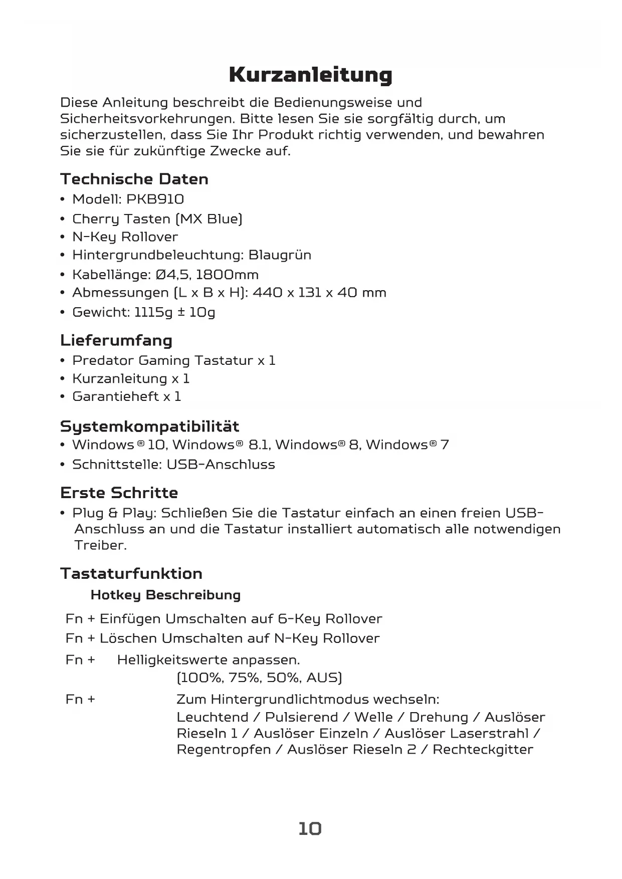- Plug & Play: Schließen Sie die Tastatur einfach an einen freien USB- Anschluss an und die Tastatur installiert automatisch alle notwendigen Treiber. Tastaturfunktion Hotkey Beschreibung Fn + Einfügen Umschalten auf 6-Key Rollover Fn + Löschen Umschalten auf N-Key Rollover Fn + Helligkeitswerte anpassen. (100%, 75%, 50%, AUS) Fn + Zum Hintergrundlichtmodus wechseln: Leuchtend / Pulsierend / Welle / Drehung / Auslöser Rieseln 1 / Auslöser Einzeln / Auslöser Laserstrahl / Regentropfen / Auslöser Rieseln 2 / Rechteckgitter11 Deutsch Hotkey Beschreibung Fn + Pos1 Sofortige Makroaufzeichnung Schritt 1: Drücken Sie Fn + F6. Die Windows Tastensperre wird aktiviert. Schritt 2: Drücken Sie Fn + Pos1, die LED wird blinken. Schritt 3: Weisen Sie eine Taste zu, die Sie speichern möchten, die LED blinkt schneller. Schritt 4: Tippen Sie die Taste an, die in der Makroliste steht. Schritt 5: Drücken Sie Fn + Pos1, beenden Sie die sofortige Makroaufzeichnung. Die Aufnahme wird beendet, wenn innerhalb von 20 Sekunden keine Aktion ausgeführt wird. Hinweise zum Komfort Forschungsergebnisse legen nahe, dass lange Zeiträume sich wiederholender Bewegungen bei Verwendung eines unsachgemäßen Aktionsraumes, Körperhaltung und schlechte Arbeitsgewohnheiten mit körperlichen Beschwerden und Verletzungen von Nerven, Sehnen und Muskeln in Verbindung gebracht werden können. Nachfolgend finden Sie einige Hinweise zur Optimierung des Benutzerkomforts und zur Vermeidung von Verletzungen.