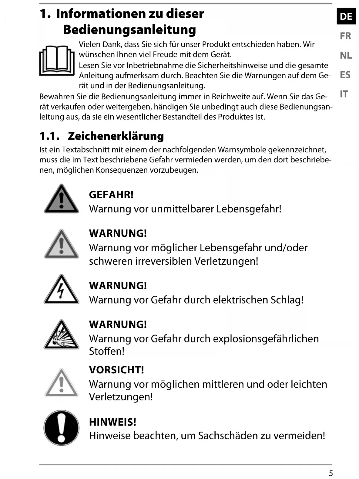 Bedienungsanleitung Vielen Dank, dass Sie sich für unser Produkt entschieden haben. Wir wünschen Ihnen viel Freude mit dem Gerät. Lesen Sie vor Inbetriebnahme die Sicherheitshinweise und die gesamte Anleitung aufmerksam durch. Beachten Sie die Warnungen auf dem Ge- rät und in der Bedienungsanleitung. Bewahren Sie die Bedienungsanleitung immer in Reichweite auf. Wenn Sie das Ge- rät verkaufen oder weitergeben, händigen Sie unbedingt auch diese Bedienungsan- leitung aus, da sie ein wesentlicher Bestandteil des Produktes ist. 1.1. Zeichenerklärung Ist ein Textabschnitt mit einem der nachfolgenden Warnsymbole gekennzeichnet, muss die im Text beschriebene Gefahr vermieden werden, um den dort beschriebe- nen, möglichen Konsequenzen vorzubeugen. GEFAHR! Warnung vor unmittelbarer Lebensgefahr! WARNUNG! Warnung vor möglicher Lebensgefahr und/oder schweren irreversiblen Verletzungen! WARNUNG! Warnung vor Gefahr durch elektrischen Schlag! WARNUNG! Warnung vor Gefahr durch explosionsgefährlichen Stoffen! VORSICHT! Warnung vor möglichen mittleren und oder leichten Verletzungen! HINWEIS! Hinweise beachten, um Sachschäden zu vermeiden!6 Weiterführende Informationen für den Gebrauch des Gerätes! Hinweise in der Bedienungsanleitung beachten!