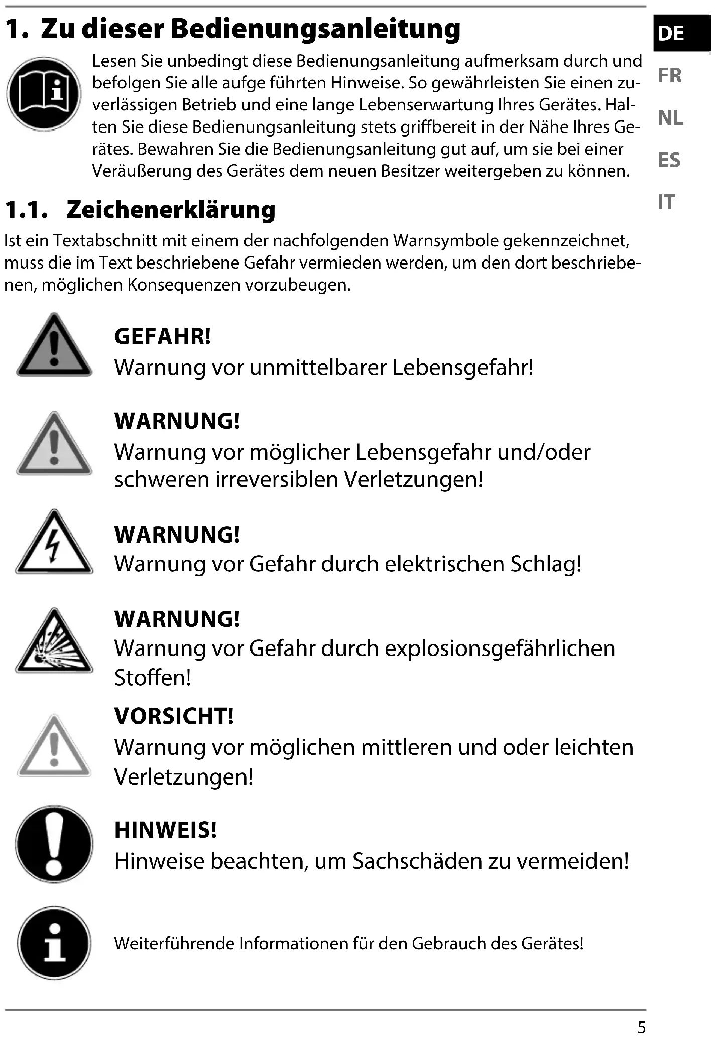 Lesen Sie unbedingt diese Bedienungsanleitung aufmerksam durch und befolgen Sie alle aufge führten Hinweise. So gewährleisten Sie einen zu- verlässigen Betrieb und eine lange Lebenserwartung Ihres Gerätes. Hal- ten Sie diese Bedienungsanleitung stets griffbereit in der Nähe Ihres Ge- rätes. Bewahren Sie die Bedienungsanleitung gut auf, um sie bei einer Veräußerung des Gerätes dem neuen Besitzer weitergeben zu können. 1.1. Zeichenerklärung Ist ein Textabschnitt mit einem der nachfolgenden Warnsymbole gekennzeichnet, muss die im Text beschriebene Gefahr vermieden werden, um den dort beschriebe- nen, möglichen Konsequenzen vorzubeugen. GEFAHR! Warnung vor unmittelbarer Lebensgefahr! WARNUNG! Warnung vor möglicher Lebensgefahr und/oder schweren irreversiblen Verletzungen! WARNUNG! Warnung vor Gefahr durch elektrischen Schlag! WARNUNG! Warnung vor Gefahr durch explosionsgefährlichen Stoffen! VORSICHT! Warnung vor möglichen mittleren und oder leichten Verletzungen! HINWEIS! Hinweise beachten, um Sachschäden zu vermeiden! Weiterführende Informationen für den Gebrauch des Gerätes!6 HINWEIS! Hinweise in der Bedienungsanleitung beachten!