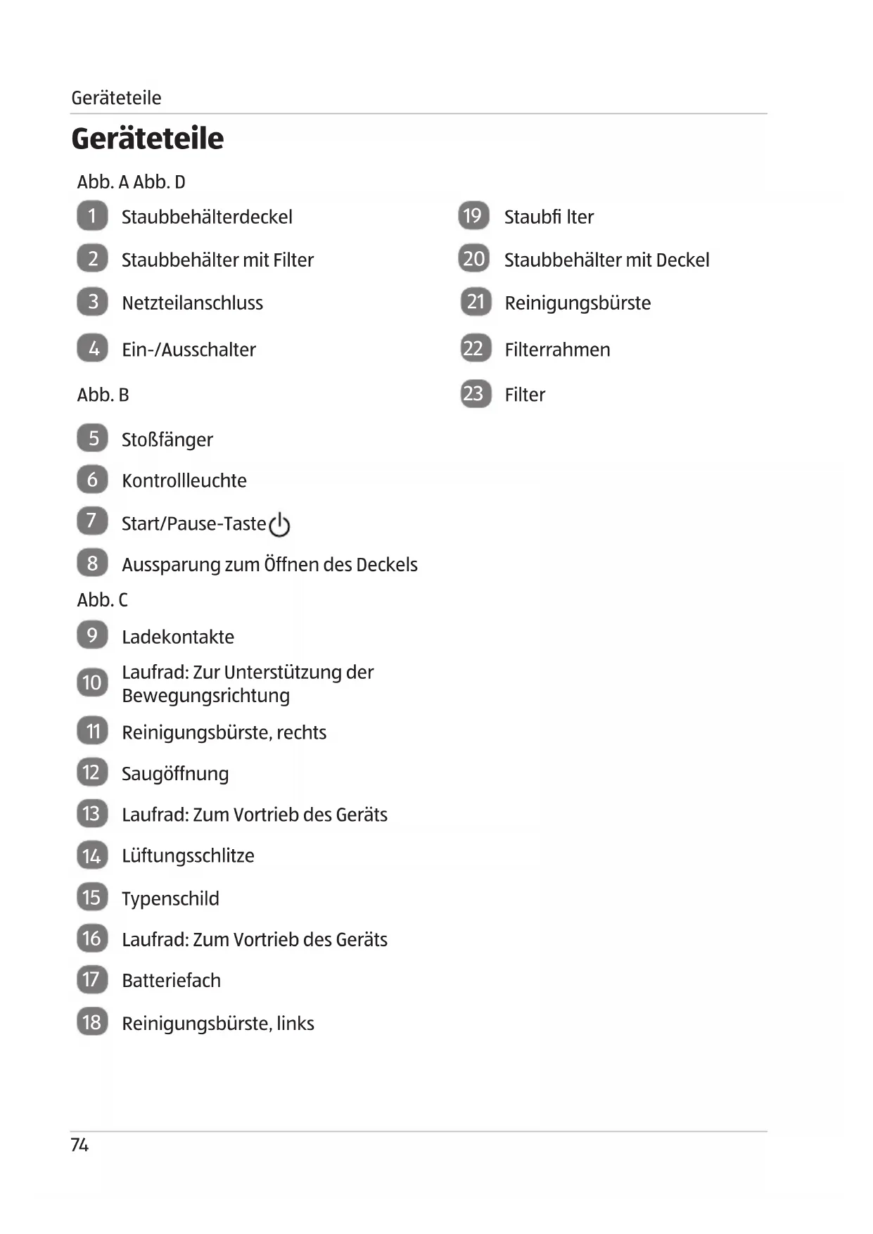 VORSICHT! Verletzungsgefahr/Gefahr von Geräteschaden! Es besteht Verletzungsgefahr oder die Möglichkeit eines Geräte- schadens durch unsachgemäße Behandlung. − Benutzen Sie das Gerät nur zum Aufsaugen kleiner Mengen Staub, Schmutz und Krümeln. Leeren Sie den Staubbehälter nach jeder Benutzung. − Benutzen Sie das Gerät nicht, um Flüssigkeiten oder feuchten Schmutz aufzusaugen. − Um Stolpergefahr zu vermeiden, verwenden Sie kein Verlän- gerungskabel und informieren Sie anwesende Personen über den Betrieb des Saugroboters. − Entfernen Sie vor dem Betrieb alle empfi ndlichen Gegenstände (z.B. Glas, Lampen, Vasen) und Objekte, die sich in den Bürsten verfangen oder aufgesaugt werden könnten (z.B.Schnüre, Kleidung, Zeitungen, Vorhänge) aus dem Arbeitsbereich. − Decken Sie die Sensoren und Lüftungsschlitze des Saugroboter nicht ab. HINWEIS! Möglicher Geräteschaden durch Abrieb bei rauen Oberfl ächen. Einige Sockelleisten, insbesondere Kamine und Öfen können eine raue, gebürstete oder körnige Eloxier Gusseisen Stahl oder Metall-Oberfl äche besitzen. Diese Oberfl ächen können ähnlich wie Schmirgelpapier auf Gummi- und Kunststoffoberfl ächen wirken und bei Berührungen die Oberfl äche des Geräts beschädigen. Ebenso können durch Kollision mit dem Sauger auch die oben be- schriebenen Oberfl ächen selbst beschädigt werden.Sicherheitshinweise