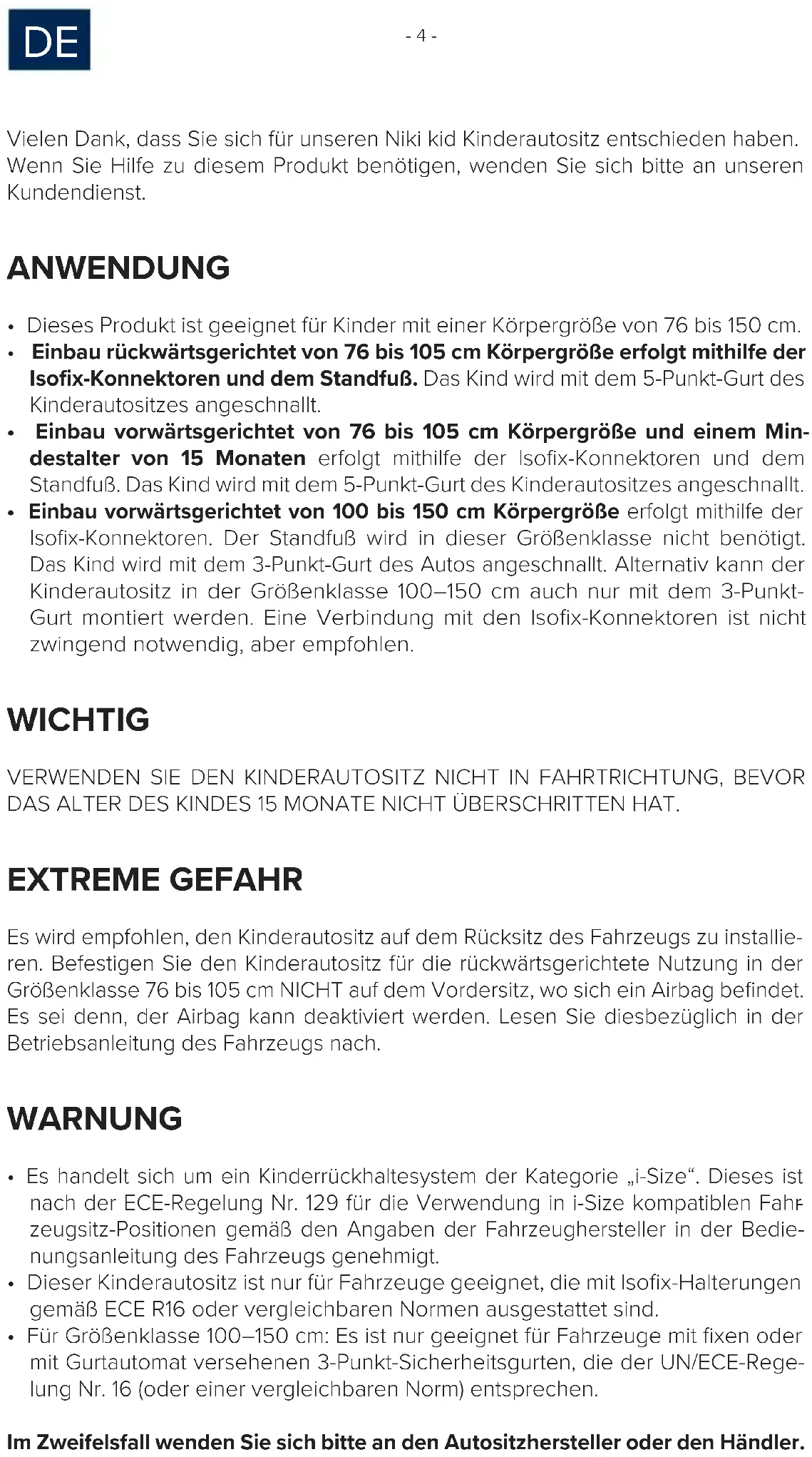 Vielen Dank, dass Sie sich für unseren Niki kid Kinderautositz entschieden haben. Wenn Sie Hilfe zu diesem Produkt benötigen, wenden Sie sich bitte an unseren Kundendienst. ANWENDUNG