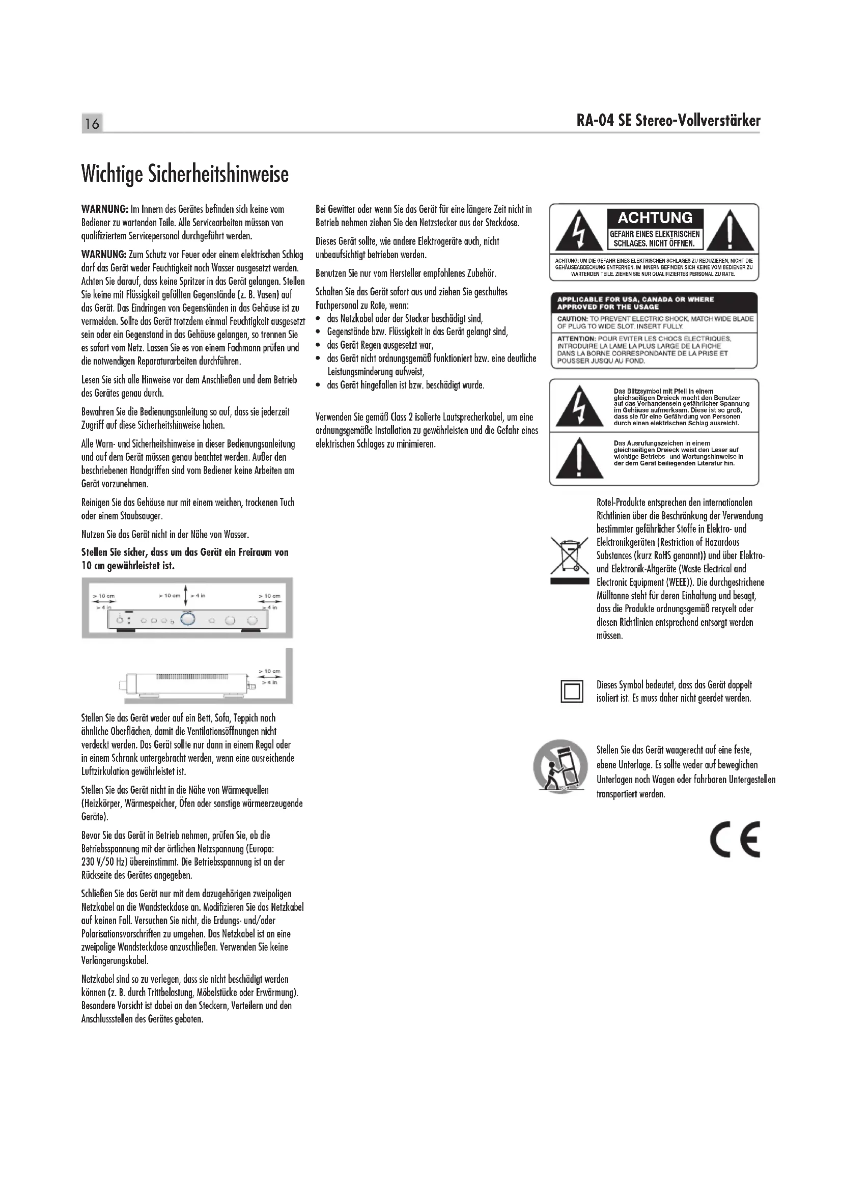 Bei Störungen . . . . . . . . . . . . . . . . . . . . . . . . . . . . . . . . . . . . . . . . . . . . . . . . . 21 Die POWER-LED leuchtet nicht 21 Austauschen der Sicherung 21 Kein Ton 21 Technische Daten . . . . . . . . . . . . . . . . . . . . . . . . . . . . . . . . . . . . . . . . . . . . . . . 2118 RA-04 SE Stereo-Vollverstärker Zu dieser Anleitung Vielen Dank, dass Sie sich für den Rotel-Stereo-Vollverstärker RA-04 SE entschieden haben. Dieses einzigartige Gerät kann optimal in jedem hochwertigen Audiosystem eingesetzt werden. Sie werden viel Freude mit diesem Gerät haben. Der RA-04 SE überzeugt durch höchste Wiedergabequalität und ist mit einer Vielzahl von Ausstattungsmerkmalen ausgestattet. Bei seiner Entwicklung wurde besonderer Wert darauf gelegt, den kompletten Dynamikbereich und feinste Nuancen der Musik wiederzugeben. Der RA-04 SE überzeugt mit einem großzügig dimensionierten Netzteil mit Rotel-Ringkerntransformator. Dieses niederohmige Netzteil hat extreme Leistungsreserven, die es dem Vollverstärker ermöglichen, die anspruchsvollsten Musiksignale zu verarbeiten. Zwar ist diese Konstruktion teurer in der Herstellung, die Musikwiedergabe jedoch profitiert davon deutlich. Die Signalwege sind streng symmetrisch gehalten, um Laufzeitunterschiede in den Kanälen zu verhindern. Auf der Platine werden Metallfilmwiderstände und Polystyrol- bzw. Polypropylenkondensatoren eingesetzt, die die Signale klanggetreu übertragen. Alle Aspekte dieser Konstruktion dienen nur dem Ziel der möglichst originalgetreuen Wiedergabe von Musik. Der RA-04 SE ist einfach zu installieren und zu bedienen. Sollten Sie bereits Erfahrung mit der Installation anderer Stereosysteme haben, dürften keinerlei Probleme auftreten. Schließen Sie einfach die gewünschten Geräte an und genießen Sie die Musik. EinigeVorsichtsmaßnahmen WARNUNG: Um eine Beschädigung des Systems zu vermeiden, sollten Sie ALLE Geräte des Systems abschalten, bevor Sie die Lautsprecher oder sonstige Komponenten anschließen bzw. trennen. Schalten Sie die Geräte erst wieder ein, wenn alle Anschlüsse ordnungsgemäß hergestellt worden sind. Achten Sie dabei besonders auf die Lautsprecherkabel oder das Gehäuse des Verstärkers. Lesen Sie sich die Bedienungsanleitung bitte vor der Inbetriebnahme genau durch. Neben grundsätzlichen Installations- und Bedienungshinweisen (bitte beachten Sie auch die Sicherheitshinweise am Anfang der Bedienungsanleitung) enthält sie allgemeine Informationen, die Ihnen helfen werden, Ihr System mit seiner maximalen Leistungsfähigkeit zu betreiben. Bitte setzen Sie sich bei etwaigen Fragen mit Ihrem autorisierten Rotel-Fachhändler in Verbindung. Bewahren Sie den Versandkarton und das übrige Verpackungsmaterial des RA-04 SE für einen eventuellen späteren Einsatz auf. Der Versand oder Transport des Vollverstärkers in einer anderen als der Originalverpackung kann zu erheblichen Beschädigungen des Gerätes führen. Schicken Sie die Ihrem Vollverstärker beiliegende Garantieanforderungskarte ausgefüllt an den Rotel-Distributor in Ihrem Land. Bewahren Sie bitte die Original-Kaufquittung auf. Sie belegt am besten das Kaufdatum, das für Sie wichtig wird, sobald Sie eine Garantieleistung in Anspruch nehmen. Aufstellung des Gerätes Wie bei allen anderen Audiokomponenten auch, kann die Signalqualität des RA-04 SE durch andere Geräte beeinträchtigt werden. Stellen Sie den RA-04 SE daher nicht auf andere Geräte. Auch sollten die Audiosignalkabel nicht neben den Netzkabeln verlaufen, um Rauschen oder Interferenzen zu vermeiden. Der RA-04 SE erwärmt sich während des Betriebes. Die entstehende Wärme kann unter normalen Bedingungen über die Kühlrippen und Ventilationsöffnungen abgeführt werden. Die Ventilationsöffnungen an der Oberseite dürfen nicht verdeckt werden. Um das Gerät muss ein Freiraum von 10 cm und am Aufstellungsort eine ausreichende Luftzirkulation gewährleistet sein, um einer Überhitzung des Vollverstärkers vorzubeugen. Berücksichtigen Sie beim Aufstellen das Gewicht des Vollverstärkers. Wir empfehlen, ihn in entsprechendem HiFi-Mobiliar unterzubringen. HiFi- Mobiliar ist so ausgelegt, dass klangbeeinträchtigende Erschütterungen gedämpft bzw. unterdrückt werden. Lassen Sie sich von Ihrem autorisierten Rotel-Fachhändler in Bezug auf HiFi-Mobiliar und die optimale Aufstellung von Audiokomponenten beraten. Kabel Achten Sie bitte darauf, dass Netz-, Digital- und die normalen Audiosignal- kabel separat verlaufen. Dies minimiert die Wahrscheinlichkeit, dass Netz- bzw. Digitalkabel die Signale der Analogkabel stören. Wir empfehlen, hochwertige abgeschirmte Kabel zu verwenden. Wenden Sie sich bei etwaigen Fragen zu den optimalen Kabeln für Ihr System an Ihren autorisierten Rotel-Fachhändler. Netzspannung und Bedienung Netzeingang