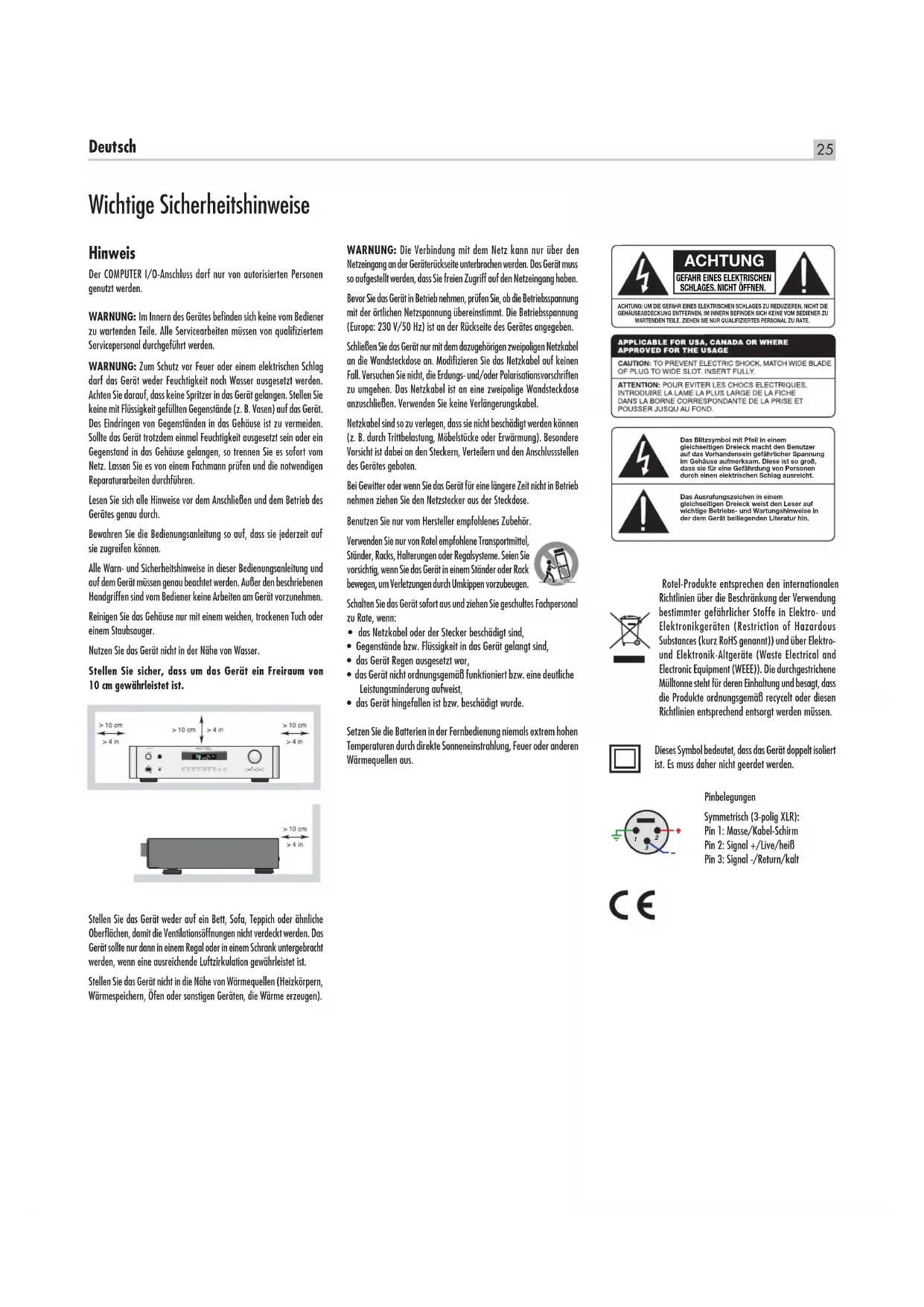 Poids (net) 7 kgs, 16 lbs. Toutes les spécifications sont garanties exactes au moment de l’impression. Rotel se réserve le droit de les modifier sans préavis. Rotel et le logo Rotel HiFi sont des marques déposées de The Rotel Co, Ltd, Tokyo, Japon. “Made for iPod,” et “Made for iPhone,” signifie qu’un appareil ou accessoire électronique a été conçu pour être connecté spécifiquement à l’iPod ou à l’iPhone, respectivement, et qu’il a été certifié par le fabricant pour répondre aux normes de performances requises par Apple. Apple n’est pas responsable du fonctionnement de l’appareil ou de sa conformité avec les différents normes de sécurité ou de régularisation. Veuillez noter que l’utilisation de cet accessoire avec l’iPod ou l’iPhone peut affecter ses performances de fonctionnement sans fil. iPhone, iPod, iPod classic, iPod nano, et iPod touch sont des marques déposées d’Apple Inc., enregistrées aux États-Unis et d’autres pays.25 Deutsch Hinweis Der COMPUTER I/O-Anschluss darf nur von autorisierten Personen genutzt werden. WARNUNG: Im Innern des Gerätes befinden sich keine vom Bediener zu wartenden Teile. Alle Servicearbeiten müssen von qualifiziertem Servicepersonal durchgeführt werden. WARNUNG: Zum Schutz vor Feuer oder einem elektrischen Schlag darf das Gerät weder Feuchtigkeit noch Wasser ausgesetzt werden. Achten Sie darauf, dass keine Spritzer in das Gerät gelangen. Stellen Sie keine mit Flüssigkeit gefüllten Gegenstände (z. B. Vasen) auf das Gerät. Das Eindringen von Gegenständen in das Gehäuse ist zu vermeiden. Sollte das Gerät trotzdem einmal Feuchtigkeit ausgesetzt sein oder ein Gegenstand in das Gehäuse gelangen, so trennen Sie es sofort vom Netz. Lassen Sie es von einem Fachmann prüfen und die notwendigen Reparaturarbeiten durchführen. Lesen Sie sich alle Hinweise vor dem Anschließen und dem Betrieb des Gerätes genau durch. Bewahren Sie die Bedienungsanleitung so auf, dass sie jederzeit auf sie zugreifen können. Alle Warn- und Sicherheitshinweise in dieser Bedienungsanleitung und auf dem Gerät müssen genau beachtet werden. Außer den beschriebenen Handgriffen sind vom Bediener keine Arbeiten am Gerät vorzunehmen. Reinigen Sie das Gehäuse nur mit einem weichen, trockenen Tuch oder einem Staubsauger. Nutzen Sie das Gerät nicht in der Nähe von Wasser. Stellen Sie sicher, dass um das Gerät ein Freiraum von 10 cm gewährleistet ist. Stellen Sie das Gerät weder auf ein Bett, Sofa, Teppich oder ähnliche Oberflächen, damit die Ventilationsöffnungen nicht verdeckt werden. Das Gerät sollte nur dann in einem Regal oder in einem Schrank untergebracht werden, wenn eine ausreichende Luftzirkulation gewährleistet ist. Stellen Sie das Gerät nicht in die Nähe von Wärmequellen (Heizkörpern, Wärmespeichern, Öfen oder sonstigen Geräten, die Wärme erzeugen). Rotel-Produkte entsprechen den internationalen Richtlinien über die Beschränkung der Verwendung bestimmter gefährlicher Stoffe in Elektro- und Elektronikgeräten (Restriction of Hazardous Substances (kurz RoHS genannt)) und über Elektro- und Elektronik-Altgeräte (Waste Electrical and Electronic Equipment (WEEE)). Die durchgestrichene Mülltonne steht für deren Einhaltung und besagt, dass die Produkte ordnungsgemäß recycelt oder diesen Richtlinien entsprechend entsorgt werden müssen. Dieses Symbol bedeutet, dass das Gerät doppelt isoliert ist. Es muss daher nicht geerdet werden. Wichtige Sicherheitshinweise WARNUNG: Die Verbindung mit dem Netz kann nur über den Netzeingang an der Geräterückseite unterbrochen werden. Das Gerät muss so aufgestellt werden, dass Sie freien Zugriff auf den Netzeingang haben. Bevor Sie das Gerät in Betrieb nehmen, prüfen Sie, ob die Betriebsspannung mit der örtlichen Netzspannung übereinstimmt. Die Betriebsspannung (Europa: 230 V/50 Hz) ist an der Rückseite des Gerätes angegeben. Schließen Sie das Gerät nur mit dem dazugehörigen zweipoligen Netzkabel an die Wandsteckdose an. Modifizieren Sie das Netzkabel auf keinen Fall. Versuchen Sie nicht, die Erdungs- und/oder Polarisationsvorschriften zu umgehen. Das Netzkabel ist an eine zweipolige Wandsteckdose anzuschließen. Verwenden Sie keine Verlängerungskabel. Netzkabel sind so zu verlegen, dass sie nicht beschädigt werden können (z. B. durch Trittbelastung, Möbelstücke oder Erwärmung). Besondere Vorsicht ist dabei an den Steckern, Verteilern und den Anschlussstellen des Gerätes geboten. Bei Gewitter oder wenn Sie das Gerät für eine längere Zeit nicht in Betrieb nehmen ziehen Sie den Netzstecker aus der Steckdose. Benutzen Sie nur vom Hersteller empfohlenes Zubehör. Verwenden Sie nur von Rotel empfohlene Transportmittel, Ständer, Racks, Halterungen oder Regalsysteme. Seien Sie vorsichtig, wenn Sie das Gerät in einem Ständer oder Rack bewegen, um Verletzungen durch Umkippen vorzubeugen. Schalten Sie das Gerät sofort aus und ziehen Sie geschultes Fachpersonal zu Rate, wenn: