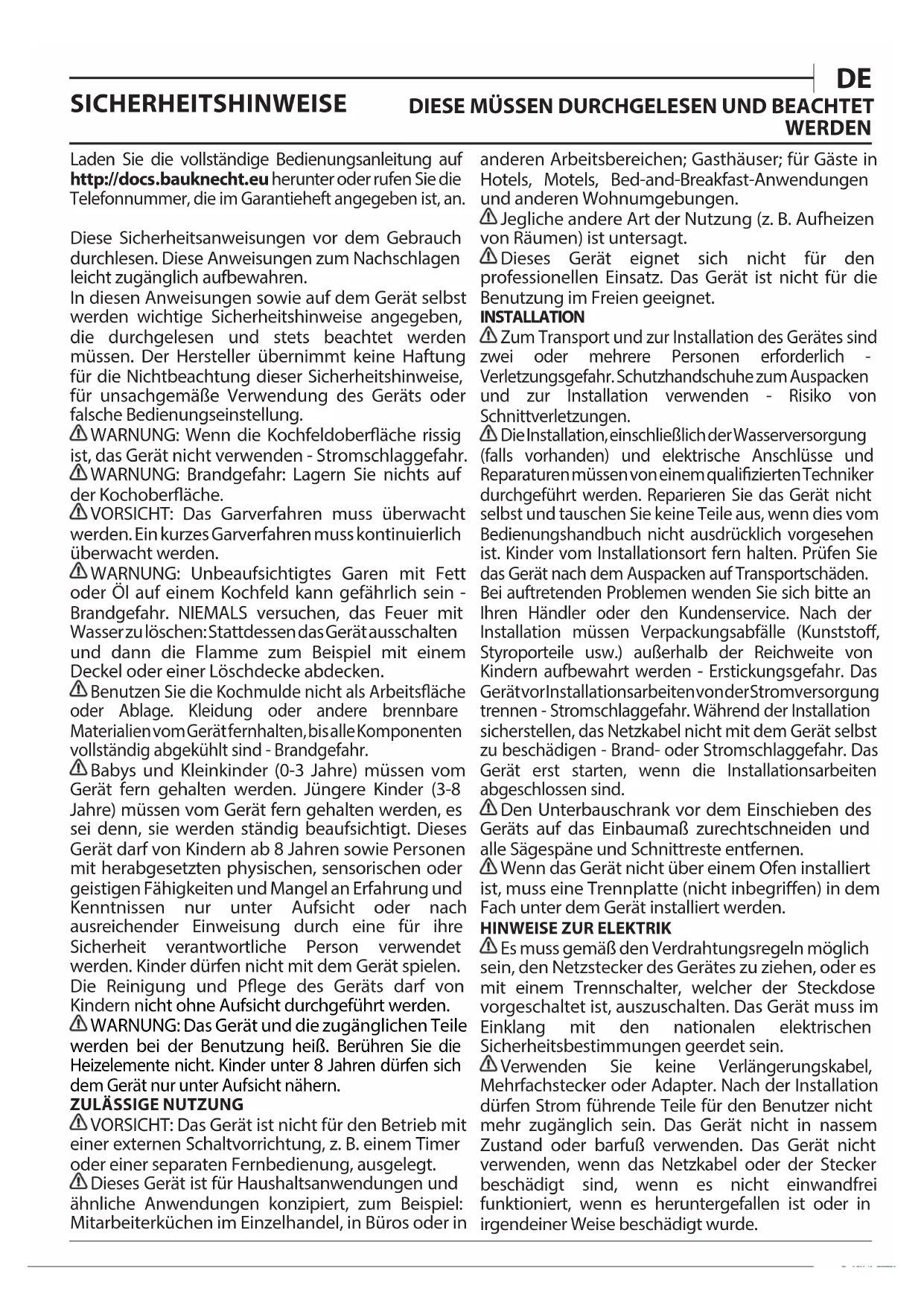 Laden Sie die vollständige Bedienungsanleitung auf http://docs.bauknecht.eu herunter oder rufen Sie die Telefonnummer, die im Garantieheft angegeben ist, an. Diese Sicherheitsanweisungen vor dem Gebrauch durchlesen. Diese Anweisungen zum Nachschlagen leicht zugänglich aufbewahren. In diesen Anweisungen sowie auf dem Gerät selbst werden wichtige Sicherheitshinweise angegeben, die durchgelesen und stets beachtet werden müssen. Der Hersteller übernimmt keine Haftung für die Nichtbeachtung dieser Sicherheitshinweise, für unsachgemäße Verwendung des Geräts oder falsche Bedienungseinstellung. WARNUNG: Wenn die Kochfeldoberäche rissig ist, das Gerät nicht verwenden - Stromschlaggefahr. WARNUNG: Brandgefahr: Lagern Sie nichts auf der Kochoberäche. VORSICHT: Das Garverfahren muss überwacht werden. Ein kurzes Garverfahren muss kontinuierlich überwacht werden. WARNUNG: Unbeaufsichtigtes Garen mit Fett oder Öl auf einem Kochfeld kann gefährlich sein - Brandgefahr. NIEMALS versuchen, das Feuer mit Wasser zu löschen: Stattdessen das Gerät ausschalten und dann die Flamme zum Beispiel mit einem Deckel oder einer Löschdecke abdecken. Benutzen Sie die Kochmulde nicht als Arbeitsäche oder Ablage. Kleidung oder andere brennbare Materialien vom Gerät fernhalten, bis alle Komponenten vollständig abgekühlt sind - Brandgefahr. Babys und Kleinkinder (0-3 Jahre) müssen vom Gerät fern gehalten werden. Jüngere Kinder (3-8 Jahre) müssen vom Gerät fern gehalten werden, es sei denn, sie werden ständig beaufsichtigt. Dieses Gerät darf von Kindern ab 8 Jahren sowie Personen mit herabgesetzten physischen, sensorischen oder geistigen Fähigkeiten und Mangel an Erfahrung und Kenntnissen nur unter Aufsicht oder nach ausreichender Einweisung durch eine für ihre Sicherheit verantwortliche Person verwendet werden. Kinder dürfen nicht mit dem Gerät spielen. Die Reinigung und Pege des Geräts darf von Kindern nicht ohne Aufsicht durchgeführt werden. WARNUNG: Das Gerät und die zugänglichen Teile werden bei der Benutzung heiß. Berühren Sie die Heizelemente nicht. Kinder unter 8 Jahren dürfen sich dem Gerät nur unter Aufsicht nähern.