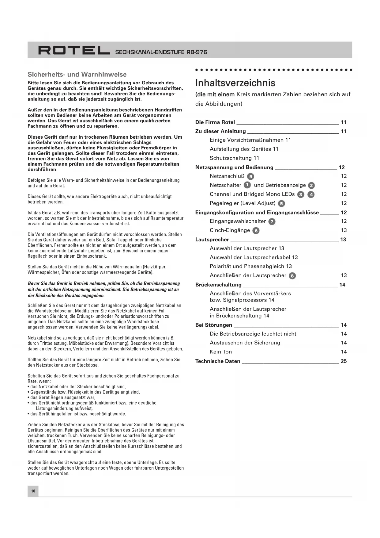 [siehe Anschlußdiagramm in Abb. 2] Die RB-976 verfügt an der Rückseite über sechs Paar farbig gekennzeichnete Anschlußklemmen. An diese Anschlußklemmen können blanke Drähte oder Kabelschuhe angeschlossen werden. Führen Sie das Kabel von der RB-976 zu den Lautsprechern. Lassen Sie sich genügend Raum, damit Sie die Komponenten bewegen können und so einen freien Zugang zu den Lautsprechern sicherstellen. Bei der Verwendung von Kabelschuhen verbinden Sie diese mit den Kabeln, stecken die Kabelschuhe hinten unter die Anschlußklemmen und drehen die Klemmen im Uhrzeigersinn fest. Sollten die Lautsprecherkabel direkt (ohne Kabelschuhe) an die Lautsprecherklemmen angeschlossen werden, so entfernen Sie an den Kabelenden ca. 15 mm der Isolation. Lösen Sie die Polklemmen durch Drehen gegen den Uhrzeigersinn. Verdrillen Sie die blanken Kabelenden, um ein Zerfasern zu vermeiden, und stecken Sie das verdrillte Kabel hinter die Polklemmen. Anschließend drehen Sie die Polklemmen im Uhrzeigersinn fest. Hinweis: Achten Sie bitte darauf, daß die blanken Kabelenden vollständig an den Polklemmen untergebracht sind und somit das Berühren benachbarter Drähte oder Anschlüsse ausgeschlossen ist.14 SECHSKANAL-ENDSTUFE RB-976 ○○○○○○○○○○○○○○○○○○○○○○○○○○○○○○○○○ Brückenschaltung [siehe Anschlußdiagramm in Abb. 3] Die Kanalpaare der RB-976 können „gebrückt“ werden. In Brückenschaltung liefert die RB-976 pro Kanal eine Ausgangsleistung von beeindruckenden 150 Watt! Durch Brückenschaltung und Anschließen einer zweiten, ebenfalls „gebrückten“ RB-976 können Sie die Gesamtausgangsleistung Ihres Systems steigern. Oder über ein „gebrücktes“ Kanalpaar der RB-976 einen Subwoofer kontrollieren. Beachten Sie, daß die Mindestimpedanz des an ein gebrücktes Kanalpaar angeschlossenen Lautsprechers 8 Ohm beträgt. Hinweis: Schalten Sie alle Systemkomponenten ab, bevor Sie Änderungen an den Anschlüssen bzw. an der Einstellung der Eingangswahlschalter vornehmen Um ein Kanalpaar der RB-976 in Brückschaltung zu setzen, setzen Sie den Eingangswahlschalter an der Rückseite in die Position „BRIDGED“. Anschließen des Vorverstärkers bzw. Signalprozessors Wird eines der Kanalpaare des RB-976 in Brückenschaltung gesetzt, so verbinden Sie den linken Ausgang des Vorverstärkers bzw. Signalprozessors mit dem linken Eingang des Kanalpaars. Der rechte Eingang wird nicht genutzt. Hinweis: Sie können die Eingänge B und/oder C miteinander verbinden und A in Brückenschaltung betreiben. Anschließen der Lautsprecher in Brückenschaltung In Brückenschaltung werden die negativen (–) Lautsprecheranschlußklemmen nicht genutzt. Verbinden Sie die mit „+“ gekennzeichneten Lautsprecheranschlußklemmen der linken Verstärkerkanäle mit den (+)-Anschlußklemmen der Lautsprecher und die mit „+“ gekennzeichnete Lautsprecheranschlußklemmen der rechten Verstärkerkanäle mit den (–)-Anschlußklemmen der Lautsprecher. ○○○○○○○○○○○○○○○○○○○○○○○○○○○○○○○○○ Bei Störungen Tritt eine scheinbare Fehlfunktion auf, sollten zuerst die nachstehend aufgeführten Punkte überprüft werden. Viele Probleme beruhen auf einfachen Bedienungsfehlern oder fehlerhaften Anschlüssen. Läßt sich das Problem nicht beheben, wenden Sie sich bitte an Ihren autorisierten Rotel-Fachhändler. Die Betriebsanzeige leuchtet nicht Die RB-976 bekommt keinen Strom. Prüfen Sie, ob der Netzschalter an der Gerätefront gedrückt wurde. Prüfen Sie die Netzanschlüsse an der Endstufe und der Wandsteckdose. Austauschen der Sicherung Sind alle Geräte korrekt angeschlossen und kann die Endstufe trotzdem nicht angeschaltet werden, kann es sein, daß die Sicherung im Geräteinnern durchgebrannt ist. Sind Sie der Meinung, daß dies der Fall ist, so lassen Sie die Sicherung von Ihrem autorisierten Rotel-Fachhändler austauschen. Kein Ton Bekommt die RB-976 Strom und ist trotzdem kein Ton zu hören, prüfen Sie die CHANNEL und BIDGED MONO LEDs an der Gerätefront. Prüfen Sie anschließend alle Ein- und Ausgangsanschlüsse und die Einstellungen der angeschlossenen Geräte.AVVERTENZA PER RIDURRE IL RISCHIO DI SCOSSA ELETTRICA NON ESPONETE L’APPARECCHIO A PIOGGIA O UMIDITA’ Italiano