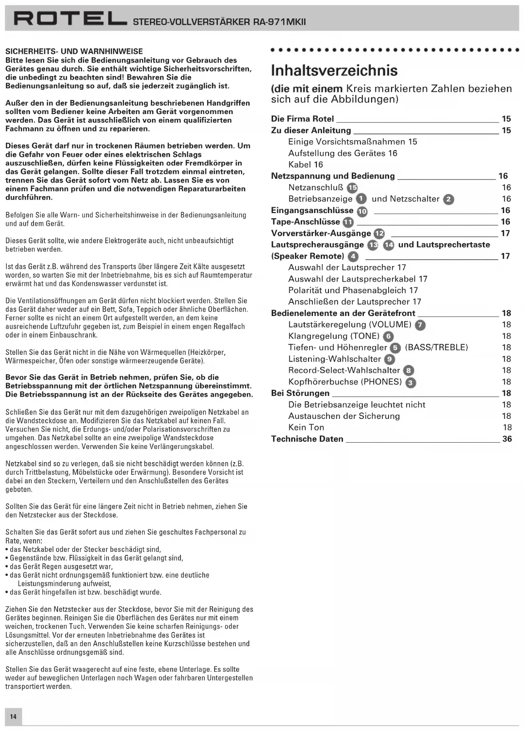 - das Gerät hingefallen ist bzw. beschädigt wurde. Ziehen Sie den Netzstecker aus der Steckdose, bevor Sie mit der Reinigung des Gerätes beginnen. Reinigen Sie die Oberflächen des Gerätes nur mit einem weichen, trockenen Tuch. Verwenden Sie keine scharfen Reinigungs- oder Lösungsmittel. Vor der erneuten Inbetriebnahme des Gerätes ist sicherzustellen, daß an den Anschlußstellen keine Kurzschlüsse bestehen und alle Anschlüsse ordnungsgemäß sind. Stellen Sie das Gerät waagerecht auf eine feste, ebene Unterlage. Es sollte weder auf beweglichen Unterlagen noch Wagen oder fahrbaren Untergestellen transportiert werden. ○○ ○○○○○○○○○○○○○○○○○○○○○○○○○○○○○○○ Inhaltsverzeichnis (die mit einem Kreis markierten Zahlen beziehen sich auf die Abbildungen) Die Firma Rotel ______________________________________ 15 Zu dieser Anleitung __________________________________ 15 Einige Vorsichtsmaßnahmen 15 Aufstellung des Gerätes 16 Kabel 16 Netzspannung und Bedienung _______________________ 16 Netzanschluß