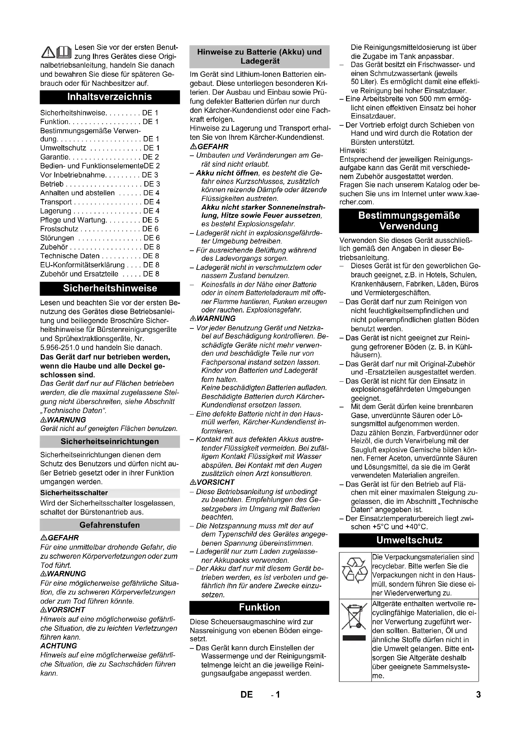2592- 1 Lesen Sie vor der ersten Benut- zung Ihres Gerätes diese Origi- nalbetriebsanleitung, handeln Sie danach und bewahren Sie diese für späteren Ge- brauch oder für Nachbesitzer auf. Lesen und beachten Sie vor der ersten Be- nutzung des Gerätes diese Betriebsanlei- tung und beiliegende Broschüre Sicher- heitshinweise für Bürstenreinigungsgeräte und Sprühextraktionsgeräte, Nr. 5.956-251.0 und handeln Sie danach. Das Gerät darf nur betrieben werden, wenn die Haube und alle Deckel ge- schlossen sind. Das Gerät darf nur auf Flächen betrieben werden, die die maximal zugelassene Stei- gung nicht überschreiten, siehe Abschnitt „Technische Daten“. 몇 WARNUNG Gerät nicht auf geneigten Flächen benutzen. Sicherheitseinrichtungen dienen dem Schutz des Benutzers und dürfen nicht au- ßer Betrieb gesetzt oder in ihrer Funktion umgangen werden. Wird der Sicherheitsschalter losgelassen, schaltet der Bürstenantrieb aus. GEFAHR Für eine unmittelbar drohende Gefahr, die zu schweren Körperverletzungen oder zum Tod führt. 몇 WARNUNG Für eine möglicherweise gefährliche Situa- tion, die zu schweren Körperverletzungen oder zum Tod führen könnte. 몇 VORSICHT Hinweis auf eine möglicherweise gefährli- che Situation, die zu leichten Verletzungen führen kann. ACHTUNG Hinweis auf eine möglicherweise gefährli- che Situation, die zu Sachschäden führen kann. Im Gerät sind Lithium-Ionen Batterien ein- gebaut. Diese unterliegen besonderen Kri- terien. Der Ausbau und Einbau sowie Prü- fung defekter Batterien dürfen nur durch den Kärcher-Kundendienst oder eine Fach- kraft erfolgen. Hinweise zu Lagerung und Transport erhal- ten Sie von Ihrem Kärcher-Kundendienst. GEFAHR – Umbauten und Veränderungen am Ge- rät sind nicht erlaubt. – Akku nicht öffnen, es besteht die Ge- fahr eines Kurzschlusses, zusätzlich können reizende Dämpfe oder ätzende Flüssigkeiten austreten. Akku nicht starker Sonneneinstrah- lung, Hitze sowie Feuer aussetzen, es besteht Explosionsgefahr. – Ladegerät nicht in explosionsgefährde- ter Umgebung betreiben. – Für ausreichende Belüftung während des Ladevorgangs sorgen. – Ladegerät nicht in verschmutztem oder nassem Zustand benutzen.