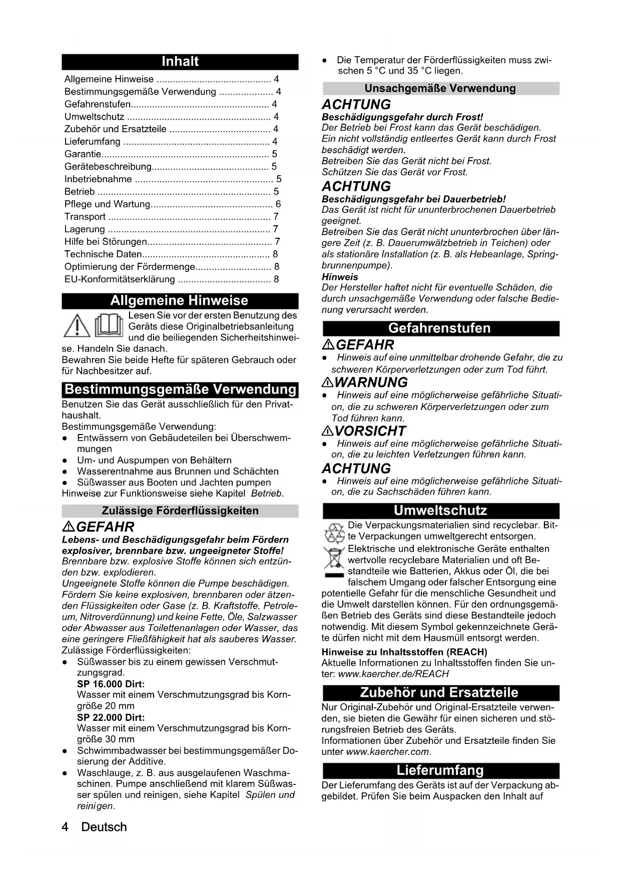 - 141AB C D E F G H4 Deutsch Inhalt Allgemeine Hinweise Lesen Sie vor der ersten Benutzung des Geräts diese Originalbetriebsanleitung und die beiliegenden Sicherheitshinwei- se. Handeln Sie danach. Bewahren Sie beide Hefte für späteren Gebrauch oder für Nachbesitzer auf. Bestimmungsgemäße Verwendung Benutzen Sie das Gerät ausschließlich für den Privat- haushalt. Bestimmungsgemäße Verwendung: ● Entwässern von Gebäudeteilen bei Überschwem- mungen ● Um- und Auspumpen von Behältern ● Wasserentnahme aus Brunnen und Schächten ● Süßwasser aus Booten und Jachten pumpen Hinweise zur Funktionsweise siehe Kapitel Betrieb. Zulässige Förderflüssigkeiten GEFAHR Lebens- und Beschädigungsgefahr beim Fördern explosiver, brennbare bzw. ungeeigneter Stoffe! Brennbare bzw. explosive Stoffe können sich entzün- den bzw. explodieren. Ungeeignete Stoffe können die Pumpe beschädigen. Fördern Sie keine explosiven, brennbaren oder ätzen- den Flüssigkeiten oder Gase (z. B. Kraftstoffe, Petrole- um, Nitroverdünnung) und keine Fette, Öle, Salzwasser oder Abwasser aus Toilettenanlagen oder Wasser, das eine geringere Fließfähigkeit hat als sauberes Wasser. Zulässige Förderflüssigkeiten: ● Süßwasser bis zu einem gewissen Verschmut- zungsgrad. SP 16.000 Dirt: Wasser mit einem Verschmutzungsgrad bis Korn- größe 20 mm SP 22.000 Dirt: Wasser mit einem Verschmutzungsgrad bis Korn- größe 30 mm ● Schwimmbadwasser bei bestimmungsgemäßer Do- sierung der Additive. ● Waschlauge, z. B. aus ausgelaufenen Waschma- schinen. Pumpe anschließend mit klarem Süßwas- ser spülen und reinigen, siehe Kapitel Spülen und reini gen. ● Die Temperatur der Förderflüssigkeiten muss zwi- schen 5 °C und 35 °C liegen. Unsachgemäße Verwendung ACHTUNG Beschädigungsgefahr durch Frost! Der Betrieb bei Frost kann das Gerät beschädigen. Ein nicht vollständig entleertes Gerät kann durch Frost beschädigt werden. Betreiben Sie das Gerät nicht bei Frost. Schützen Sie das Gerät vor Frost. ACHTUNG Beschädigungsgefahr bei Dauerbetrieb! Das Gerät ist nicht für ununterbrochenen Dauerbetrieb geeignet. Betreiben Sie das Gerät nicht ununterbrochen über län- gere Zeit (z. B. Dauerumwälzbetrieb in Teichen) oder als stationäre Installation (z. B. als Hebeanlage, Spring- brunnenpumpe). Hinweis Der Hersteller haftet nicht für eventuelle Schäden, die durch unsachgemäße Verwendung oder falsche Bedie- nung verursacht werden. Gefahrenstufen GEFAHR ● Hinweis auf eine unmittelbar drohende Gefahr, die zu schweren Körperverletzungen oder zum Tod führt. 몇 WARNUNG ● Hinweis auf eine möglicherweise gefährliche Situati- on, die zu schweren Körperverletzungen oder zum Tod führen kann. 몇 VORSICHT ● Hinweis auf eine möglicherweise gefährliche Situati- on, die zu leichten Verletzungen führen kann. ACHTUNG ● Hinweis auf eine möglicherweise gefährliche Situati- on, die zu Sachschäden führen kann. Umweltschutz Die Verpackungsmaterialien sind recyclebar. Bit- te Verpackungen umweltgerecht entsorgen. Elektrische und elektronische Geräte enthalten wertvolle recyclebare Materialien und oft Be- standteile wie Batterien, Akkus oder Öl, die bei falschem Umgang oder falscher Entsorgung eine potentielle Gefahr für die menschliche Gesundheit und die Umwelt darstellen können. Für den ordnungsgemä- ßen Betrieb des Geräts sind diese Bestandteile jedoch notwendig. Mit diesem Symbol gekennzeichnete Gerä- te dürfen nicht mit dem Hausmüll entsorgt werden. Hinweise zu Inhaltsstoffen (REACH) Aktuelle Informationen zu Inhaltsstoffen finden Sie un- ter: www.kaercher.de/REACH Zubehör und Ersatzteile Nur Original-Zubehör und Original-Ersatzteile verwen- den, sie bieten die Gewähr für einen sicheren und stö- rungsfreien Betrieb des Geräts. Informationen über Zubehör und Ersatzteile finden Sie unter www.kaercher.com. Lieferumfang Der Lieferumfang des Geräts ist auf der Verpackung ab- gebildet. Prüfen Sie beim Auspacken den Inhalt auf Allgemeine Hinweise p. 4