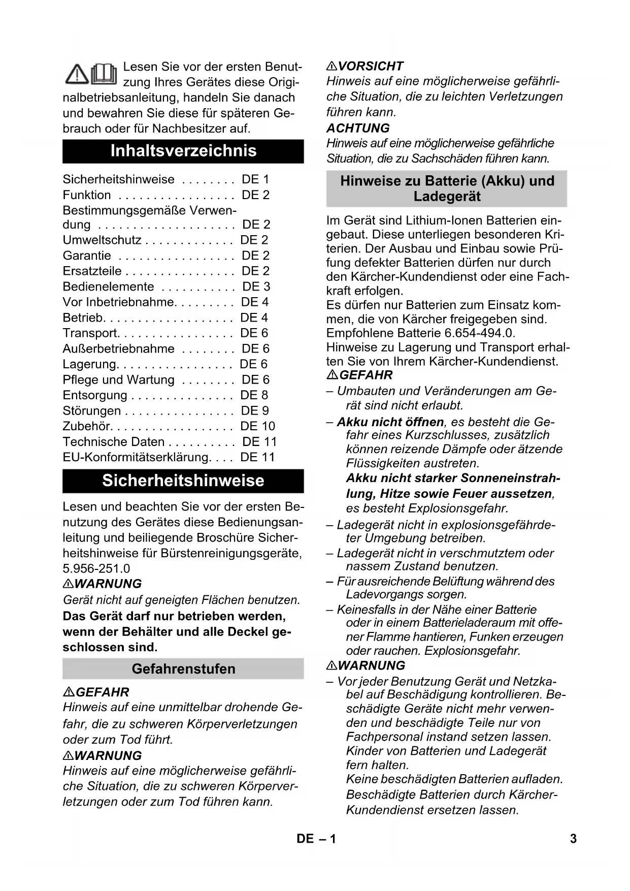 3192– 1 Lesen Sie vor der ersten Benut- zung Ihres Gerätes diese Origi- nalbetriebsanleitung, handeln Sie danach und bewahren Sie diese für späteren Ge- brauch oder für Nachbesitzer auf. Lesen und beachten Sie vor der ersten Be- nutzung des Gerätes diese Bedienungsan- leitung und beiliegende Broschüre Sicher- heitshinweise für Bürstenreinigungsgeräte, 5.956-251.0 몇 WARNUNG Gerät nicht auf geneigten Flächen benutzen. Das Gerät darf nur betrieben werden, wenn der Behälter und alle Deckel ge- schlossen sind. GEFAHR Hinweis auf eine unmittelbar drohende Ge- fahr, die zu schweren Körperverletzungen oder zum Tod führt. 몇 WARNUNG Hinweis auf eine möglicherweise gefährli- che Situation, die zu schweren Körperver- letzungen oder zum Tod führen kann. 몇 VORSICHT Hinweis auf eine möglicherweise gefährli- che Situation, die zu leichten Verletzungen führen kann. ACHTUNG Hinweis auf eine möglicherweise gefährliche Situation, die zu Sachschäden führen kann. Im Gerät sind Lithium-Ionen Batterien ein- gebaut. Diese unterliegen besonderen Kri- terien. Der Ausbau und Einbau sowie Prü- fung defekter Batterien dürfen nur durch den Kärcher-Kundendienst oder eine Fach- kraft erfolgen. Es dürfen nur Batterien zum Einsatz kom- men, die von Kärcher freigegeben sind. Empfohlene Batterie 6.654-494.0. Hinweise zu Lagerung und Transport erhal- ten Sie von Ihrem Kärcher-Kundendienst. GEFAHR – Umbauten und Veränderungen am Ge- rät sind nicht erlaubt. – Akku nicht öffnen, es besteht die Ge- fahr eines Kurzschlusses, zusätzlich können reizende Dämpfe oder ätzende Flüssigkeiten austreten. Akku nicht starker Sonneneinstrah- lung, Hitze sowie Feuer aussetzen, es besteht Explosionsgefahr. – Ladegerät nicht in explosionsgefährde- ter Umgebung betreiben. – Ladegerät nicht in verschmutztem oder nassem Zustand benutzen. – Für ausreichende Belüftung während des Ladevorgangs sorgen. – Keinesfalls in der Nähe einer Batterie oder in einem Batterieladeraum mit offe- ner Flamme hantieren, Funken erzeugen oder rauchen. Explosionsgefahr. 몇 WARNUNG – Vor jeder Benutzung Gerät und Netzka- bel auf Beschädigung kontrollieren. Be- schädigte Geräte nicht mehr verwen- den und beschädigte Teile nur von Fachpersonal instand setzen lassen. Kinder von Batterien und Ladegerät fern halten. Keine beschädigten Batterien aufladen. Beschädigte Batterien durch Kärcher- Kundendienst ersetzen lassen. Inhaltsverzeichnis Sicherheitshinweise ... DE 1 Funktion ... DE 2 Bestimmungsgemäße Verwen- dung ... DE 2 Umweltschutz ... DE 2 Garantie ... DE 2 Ersatzteile ... DE 2 Bedienelemente ... DE 3 Vor Inbetriebnahme... DE 4 Betrieb... DE 4 Transport... DE 6 Außerbetriebnahme ... DE 6 Lagerung... DE 6 Pflege und Wartung ... DE 6 Entsorgung ... DE 8 Störungen ... DE 9 Zubehör... DE 10 Technische Daten ... DE 11 EU-Konformitätserklärung... DE 11 Sicherheitshinweise Gefahrenstufen Hinweise zu Batterie (Akku) und Ladegerät 3DE– 2 – Eine defekte Batterie nicht in den Haus- müll werfen, Kärcher-Kundendienst in- formieren. – Kontakt mit aus defekten Akkus austre- tender Flüssigkeit vermeiden. Bei zufäl- ligem Kontakt Flüssigkeit mit Wasser abspülen. Bei Kontakt mit den Augen zusätzlich einen Arzt konsultieren. 몇 VORSICHT
