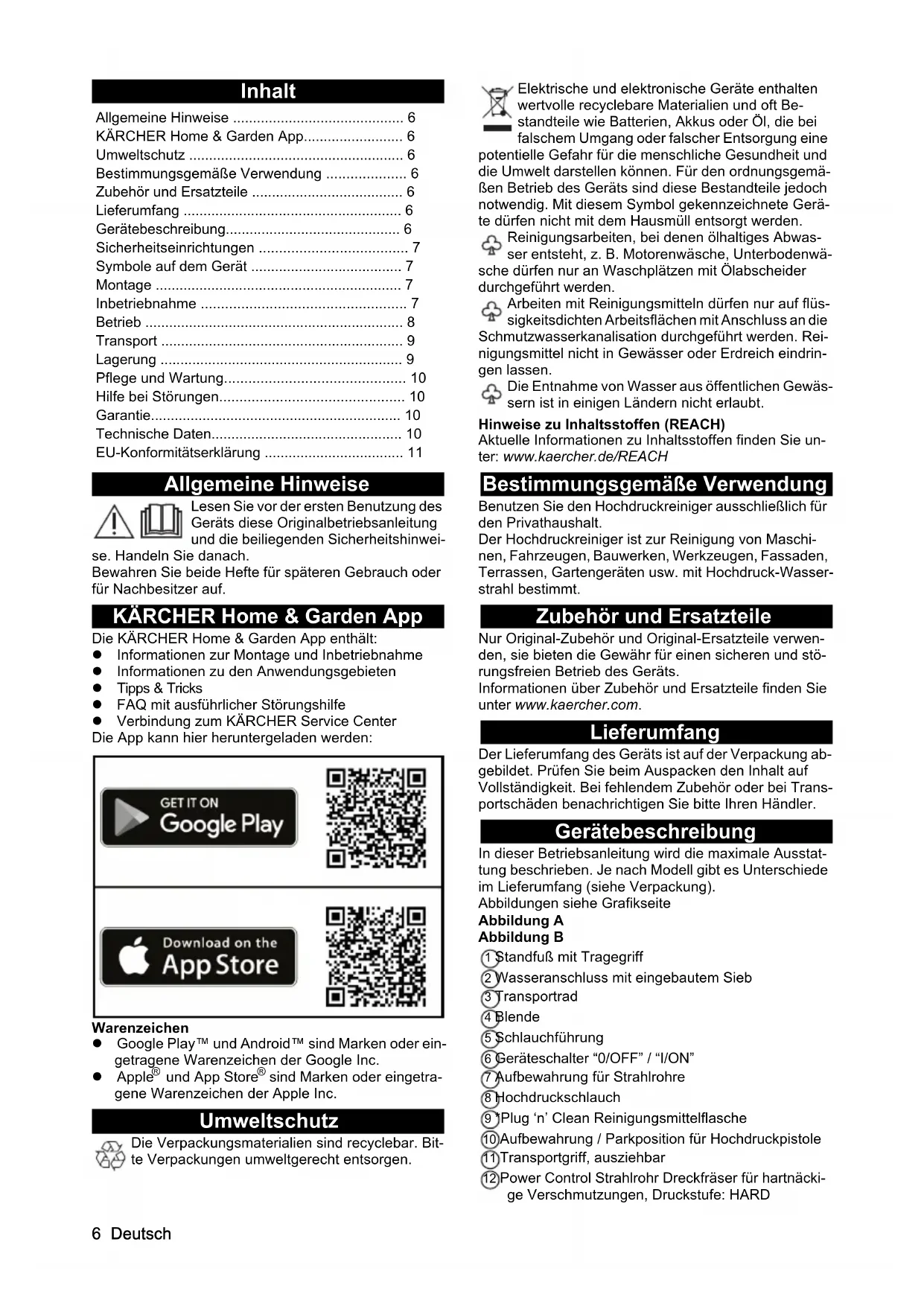 3C D E F G H I J 4K L M N O P Q R 56 Deutsch Inhalt Allgemeine Hinweise Lesen Sie vor der ersten Benutzung des Geräts diese Originalbetriebsanleitung und die beiliegenden Sicherheitshinwei- se. Handeln Sie danach. Bewahren Sie beide Hefte für späteren Gebrauch oder für Nachbesitzer auf. KÄRCHER Home & Garden App Die KÄRCHER Home & Garden App enthält: Informationen zur Montage und Inbetriebnahme Informationen zu den Anwendungsgebieten Tipps & Tricks FAQ mit ausführlicher Störungshilfe Verbindung zum KÄRCHER Service Center Die App kann hier heruntergeladen werden: Warenzeichen Google Play™ und Android™ sind Marken oder ein- getragene Warenzeichen der Google Inc. Apple