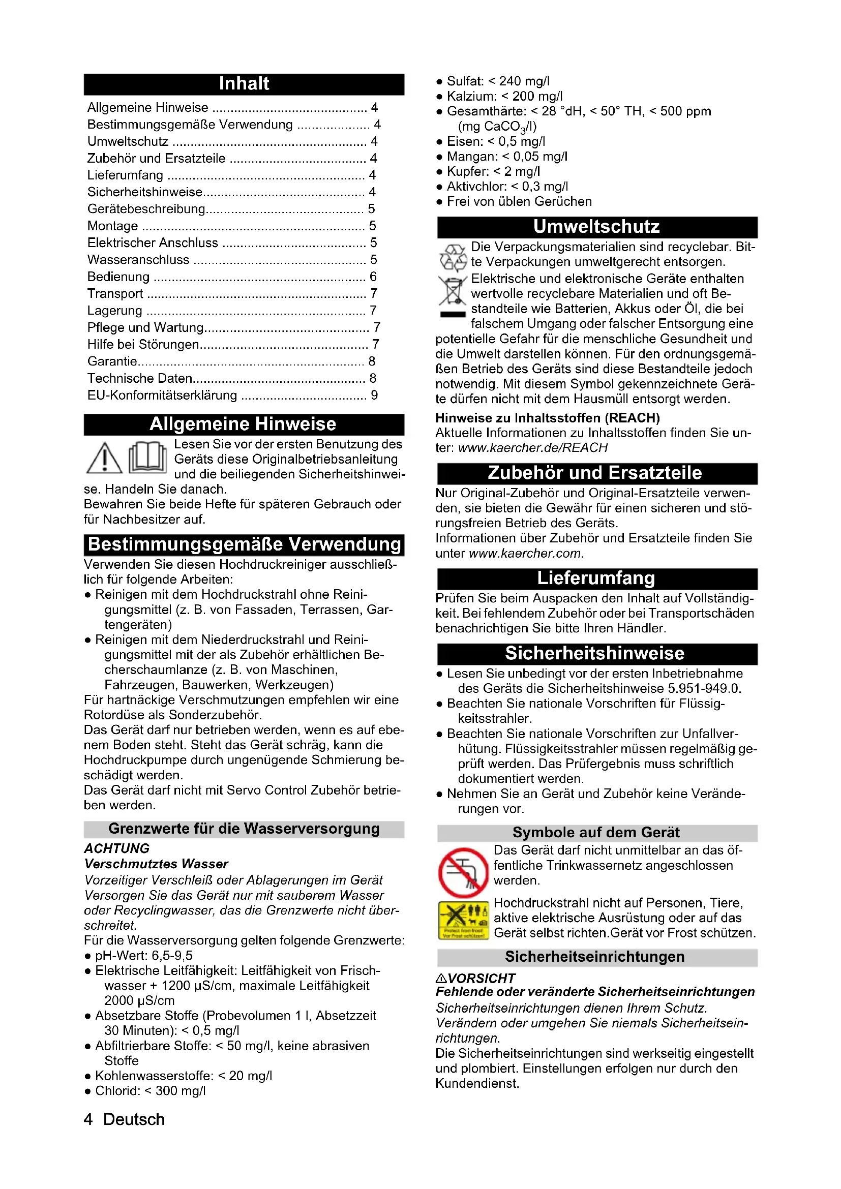 • /l) ● Eisen: < 0,5 mg/l ● Mangan: < 0,05 mg/l ● Kupfer: < 2 mg/l ● Aktivchlor: < 0,3 mg/l ● Frei von üblen Gerüchen Umweltschutz Die Verpackungsmaterialien sind recyclebar. Bit- te Verpackungen umweltgerecht entsorgen. Elektrische und elektronische Geräte enthalten wertvolle recyclebare Materialien und oft Be- standteile wie Batterien, Akkus oder Öl, die bei falschem Umgang oder falscher Entsorgung eine potentielle Gefahr für die menschliche Gesundheit und die Umwelt darstellen können. Für den ordnungsgemä- ßen Betrieb des Geräts sind diese Bestandteile jedoch notwendig. Mit diesem Symbol gekennzeichnete Gerä- te dürfen nicht mit dem Hausmüll entsorgt werden. Hinweise zu Inhaltsstoffen (REACH) Aktuelle Informationen zu Inhaltsstoffen finden Sie un- ter: www.kaercher.de/REACH Zubehör und Ersatzteile Nur Original-Zubehör und Original-Ersatzteile verwen- den, sie bieten die Gewähr für einen sicheren und stö- rungsfreien Betrieb des Geräts. Informationen über Zubehör und Ersatzteile finden Sie unter www.kaercher.com. Lieferumfang Prüfen Sie beim Auspacken den Inhalt auf Vollständig- keit. Bei fehlendem Zubehör oder bei Transportschäden benachrichtigen Sie bitte Ihren Händler. Sicherheitshinweise ● Lesen Sie unbedingt vor der ersten Inbetriebnahme des Geräts die Sicherheitshinweise 5.951-949.0. ● Beachten Sie nationale Vorschriften für Flüssig- keitsstrahler. ● Beachten Sie nationale Vorschriften zur Unfallver- hütung. Flüssigkeitsstrahler müssen regelmäßig ge- prüft werden. Das Prüfergebnis muss schriftlich dokumentiert werden. ● Nehmen Sie an Gerät und Zubehör keine Verände- rungen vor. Symbole auf dem Gerät Das Gerät darf nicht unmittelbar an das öf- fentliche Trinkwassernetz angeschlossen werden. Hochdruckstrahl nicht auf Personen, Tiere, aktive elektrische Ausrüstung oder auf das Gerät selbst richten.Gerät vor Frost schützen. Sicherheitseinrichtungen 몇 VORSICHT Fehlende oder veränderte Sicherheitseinrichtungen Sicherheitseinrichtungen dienen Ihrem Schutz. Verändern oder umgehen Sie niemals Sicherheitsein- richtungen. Die Sicherheitseinrichtungen sind werkseitig eingestellt und plombiert. Einstellungen erfolgen nur durch den Kundendienst. Allgemeine Hinweise p. 4