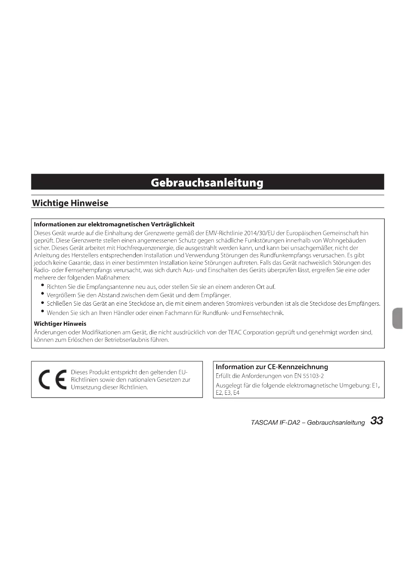 - Wenden Sie sich an Ihren Händler oder einen Fachmann für Rundfunk- und Fernsehtechnik. Wichtiger Hinweis Änderungen oder Modifikationen am Gerät, die nicht ausdrücklich von der TEAC Corporation geprüft und genehmigt worden sind, können zum Erlöschen der Betriebserlaubnis führen.Dieses Produkt entspricht den geltenden EU-Richtlinien sowie den nationalen Gesetzen zur Umsetzung dieser Richtlinien. Information zur CE-Kennzeichnung Erfüllt die Anforderungen von EN 55103-2Ausgelegt für die folgende elektromagnetische Umgebung: E1, E2, E3, E434 TASCAM IF-DA2 – Gebrauchsanleitung Wichtige Hinweise Bei Problemen mit diesem Produkt wenden Sie sich bitte an den Kundendienst. Benutzen Sie das Gerät nicht mehr, bis es repariert wurde. Informationen zur Entsorgung von Altgeräten Wenn dieses Symbol eines durchgestrichenen Abfalleimers auf einem Produkt angebracht ist, unterliegt dieses Produkt den europäischen Richtlinien 2012/19/EU und/oder 2006/66/EC sowie nationalen Gesetzen zur Umsetzung dieser Richtlinien. Richtlinien und Gesetze schreiben vor, dass Elektro- und Elektronik-Altgeräte nicht in den Hausmüll (Restmüll) gelangen dürfen. Um die fachgerechte Entsorgung, Aufbereitung und Wiederverwertung sicherzustellen, sind Sie verpflichtet, Altgeräte über staatlich dafür vorgesehene Stellen zu entsorgen. Mit der ordnungsgemäßen Entsorgung von Altgeräten vermeiden Sie Umweltschäden und eine Gefährdung der persönlichen Gesundheit. Die Entsorgung ist für Sie kostenlos. Weitere Informationen zur Entsorgung von Altgeräten erhalten Sie bei Ihrer Stadtverwaltung, beim Entsorgungsamt oder in dem Geschäft, in dem Sie das Produkt erworben haben. Inhaltsverzeichnis Wichtige Hinweise p. 33