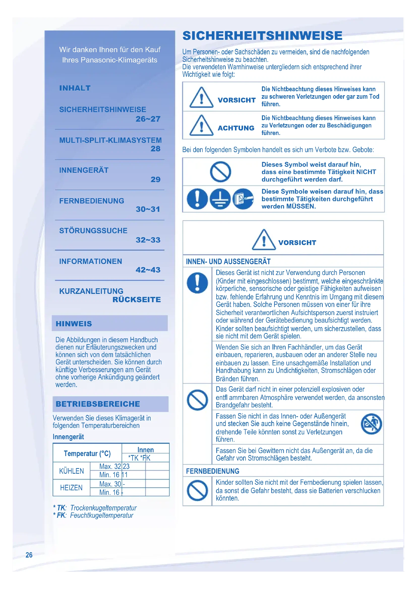Dieses Gerät ist nicht zur Verwendung durch Personen (Kinder mit eingeschlossen) bestimmt, welche eingeschränkte körperliche, sensorische oder geistige Fähigkeiten aufweisen bzw. fehlende Erfahrung und Kenntnis im Umgang mit diesem Gerät haben. Solche Personen müssen von einer für ihre Sicherheit verantwortlichen Aufsichtsperson zuerst instruiert oder während der Gerätebedienung beaufsichtigt werden. Kinder sollten beaufsichtigt werden, um sicherzustellen, dass sie nicht mit dem Gerät spielen. Wenden Sie sich an Ihren Fachhändler, um das Gerät einbauen, reparieren, ausbauen oder an anderer Stelle neu einbauen zu lassen. Eine unsachgemäße Installation und Handhabung kann zu Undichtigkeiten, Stromschlägen oder Bränden führen. Das Gerät darf nicht in einer potenziell explosiven oder entfl ammbaren Atmosphäre verwendet werden, da ansonsten Brandgefahr besteht. Fassen Sie nicht in das Innen- oder Außengerät und stecken Sie auch keine Gegenstände hinein, drehende Teile könnten sonst zu Verletzungen führen. Fassen Sie bei Gewittern nicht das Außengerät an, da die Gefahr von Stromschlägen besteht. FERNBEDIENUNG Kinder sollten Sie nicht mit der Fernbedienung spielen lassen, da sonst die Gefahr besteht, dass sie Batterien verschlucken könnten. Wir danken Ihnen für den Kauf Ihres Panasonic-Klimageräts INHALT INHALT SICHERHEITSHINWEISE 26~27 MULTI-SPLIT-KLIMASYSTEM