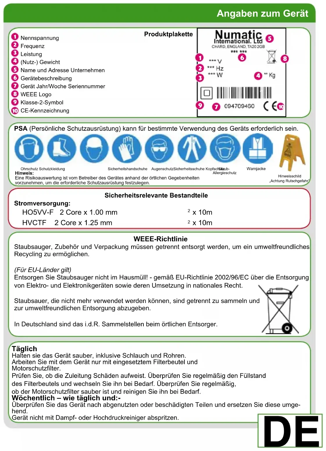 NennspannungFrequenzLeistung(Nutz-) GewichtName und Adresse UnternehmenGerätebeschreibungGerät Jahr/Woche SeriennummerWEEE LogoKlasse-2-SymbolCE-KennzeichnungWarnjacke PSA (Persönliche Schutzausrüstung) kann für bestimmte Verwendung des Geräts erforderlich sein. AugenschutzSicherheitsschuhe KopfschutzSicherheitshandschuheStaub-AllergieschutzOhrschutz SchutzkleidungHinweis:Eine Risikoauswertung ist vom Betreiber des Gerätes anhand der örtlichen Gegebenheiten vorzunehmen, um die erforderliche Schutzausrüstung festzulegen.Hinweisschild „Achtung Rutschgefahr” Täglich Halten sie das Gerät sauber, inklusive Schlauch und Rohren. Arbeiten Sie mit dem Gerät nur mit eingesetztem Filterbeutel und Motorschutzlter. Prüfen Sie, ob die Zuleitung Schäden aufweist. Überprüfen Sie regelmäßig den Füllstand des Filterbeutels und wechseln Sie ihn bei Bedarf. Überprüfen Sie regelmäßig, ob der Motorschutzlter sauber ist und reinigen Sie ihn bei Bedarf. Wöchentlich – wie täglich und:- Überprüfen Sie das Gerät nach abgenutzten oder beschädigten Teilen und ersetzen Sie diese umge- hend. Gerät nicht mit Dampf- oder Hochdruckreiniger abspritzen.