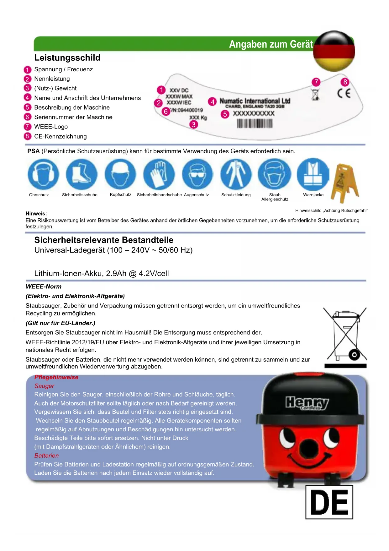 Leistungsschild OhrschutzSicherheitsschuheKopfschutzSicherheitshandschuheAugenschutzSchutzkleidungHinweis: Eine Risikoauswertung ist vom Betreiber des Gerätes anhand der örtlichen Gegebenheiten vorzunehmen, um die erforderliche Schutzausrüstung festzulegen.StaubAllergieschutzHinweisschild „Achtung Rutschgefahr”WarnjackePSA (Persönliche Schutzausrüstung) kann für bestimmte Verwendung des Geräts erforderlich sein. Universal-Ladegerät (100 – 240V ~ 50/60 Hz) Lithium-Ionen-Akku, 2.9Ah @ 4.2V/cell Sicherheitsrelevante Bestandteile WEEE-Norm (Elektro- und Elektronik-Altgeräte)Staubsauger, Zubehör und Verpackung müssen getrennt entsorgt werden, um ein umweltfreundliches Recycling zu ermöglichen.(Gilt nur für EU-Länder.)Entsorgen Sie Staubsauger nicht im Hausmüll! Die Entsorgung muss entsprechend der.WEEE-Richtlinie 2012/19/EU über Elektro- und Elektronik-Altgeräte und ihrer jeweiligen Umsetzung in nationales Recht erfolgen.Staubsauger oder Batterien, die nicht mehr verwendet werden können, sind getrennt zu sammeln und zur umweltfreundlichen Wiederverwertung abzugeben. PegehinweiseSaugerReinigen Sie den Sauger, einschließlich der Rohre und Schläuche, täglich. Auch der Motorschutzlter sollte täglich oder nach Bedarf gereinigt werden. Vergewissern Sie sich, dass Beutel und Filter stets richtig eingesetzt sind. Wechseln Sie den Staubbeutel regelmäßig. Alle Gerätekomponenten sollten regelmäßig auf Abnutzungen und Beschädigungen hin untersucht werden. Beschädigte Teile bitte sofort ersetzen. Nicht unter Druck (mit Dampfstrahlgeräten oder Ähnlichem) reinigen.BatterienPrüfen Sie Batterien und Ladestation regelmäßig auf ordnungsgemäßen Zustand.Laden Sie die Batterien nach jedem Einsatz wieder vollständig auf.Spannung / FrequenzNennleistung(Nutz-) GewichtName und Anschrift des UnternehmensBeschreibung der MaschineSeriennummer der MaschineWEEE-LogoCE-Kennzeichnung
