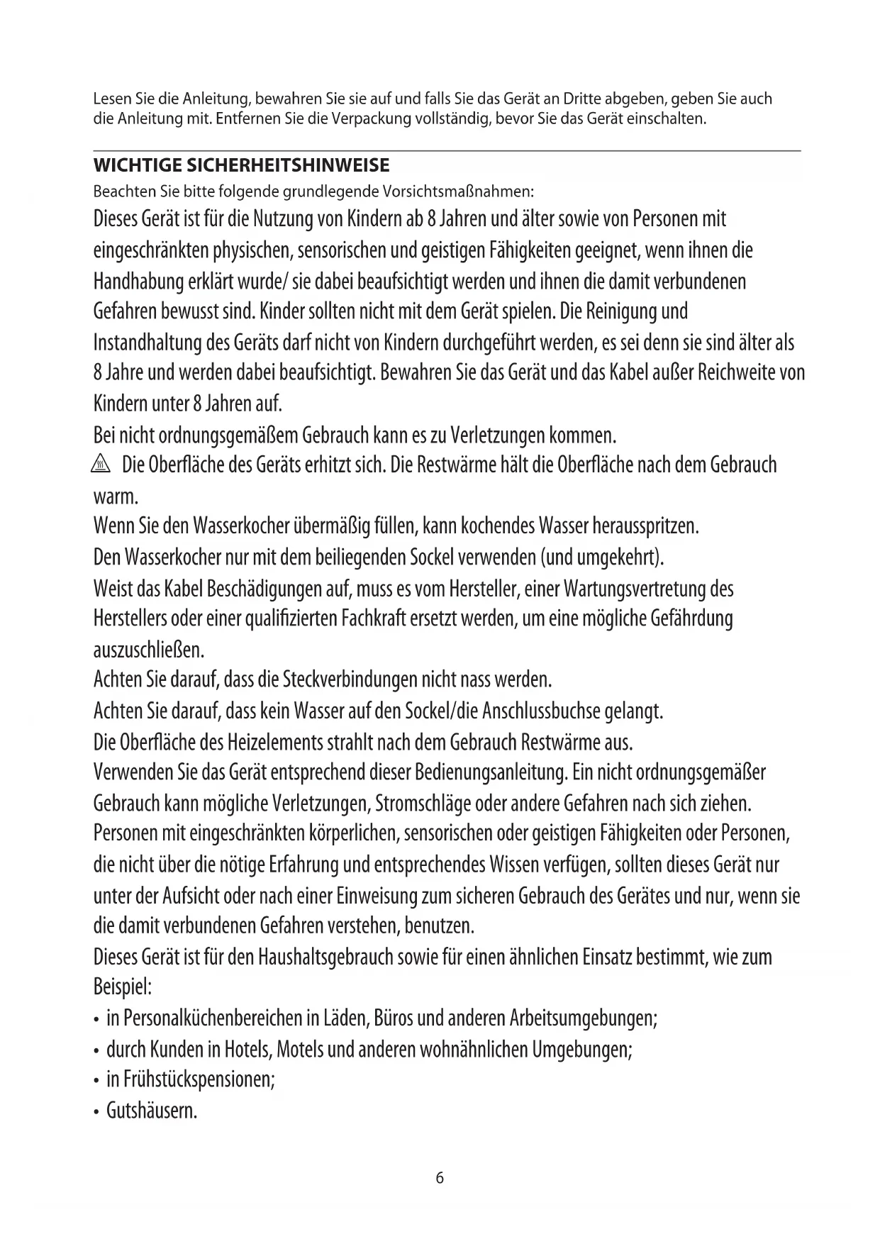 AE6 Lesen Sie die Anleitung, bewahren Sie sie auf und falls Sie das Gerät an Dritte abgeben, geben Sie auch die Anleitung mit. Entfernen Sie die Verpackung vollständig, bevor Sie das Gerät einschalten. WICHTIGE SICHERHEITSHINWEISE Beachten Sie bitte folgende grundlegende Vorsichtsmaßnahmen: Dieses Gerät ist für die Nutzung von Kindern ab 8 Jahren und älter sowie von Personen mit eingeschränkten physischen, sensorischen und geistigen Fähigkeiten geeignet, wenn ihnen die Handhabung erklärt wurde/ sie dabei beaufsichtigt werden und ihnen die damit verbundenen Gefahren bewusst sind. Kinder sollten nicht mit dem Gerät spielen. Die Reinigung und Instandhaltung des Geräts darf nicht von Kindern durchgeführt werden, es sei denn sie sind älter als 8 Jahre und werden dabei beaufsichtigt. Bewahren Sie das Gerät und das Kabel außer Reichweite von Kindern unter 8 Jahren auf. Bei nicht ordnungsgemäßem Gebrauch kann es zu Verletzungen kommen. h Die Oberfläche des Geräts erhitzt sich. Die Restwärme hält die Oberfläche nach dem Gebrauch warm. Wenn Sie den Wasserkocher übermäßig füllen, kann kochendes Wasser herausspritzen. Den Wasserkocher nur mit dem beiliegenden Sockel verwenden (und umgekehrt). Weist das Kabel Beschädigungen auf, muss es vom Hersteller, einer Wartungsvertretung des Herstellers oder einer qualifizierten Fachkraft ersetzt werden, um eine mögliche Gefährdung auszuschließen. Achten Sie darauf, dass die Steckverbindungen nicht nass werden. Achten Sie darauf, dass kein Wasser auf den Sockel/die Anschlussbuchse gelangt. Die Oberfläche des Heizelements strahlt nach dem Gebrauch Restwärme aus. Verwenden Sie das Gerät entsprechend dieser Bedienungsanleitung. Ein nicht ordnungsgemäßer Gebrauch kann mögliche Verletzungen, Stromschläge oder andere Gefahren nach sich ziehen. Personen mit eingeschränkten körperlichen, sensorischen oder geistigen Fähigkeiten oder Personen, die nicht über die nötige Erfahrung und entsprechendes Wissen verfügen, sollten dieses Gerät nur unter der Aufsicht oder nach einer Einweisung zum sicheren Gebrauch des Gerätes und nur, wenn sie die damit verbundenen Gefahren verstehen, benutzen. Dieses Gerät ist für den Haushaltsgebrauch sowie für einen ähnlichen Einsatz bestimmt, wie zum Beispiel: