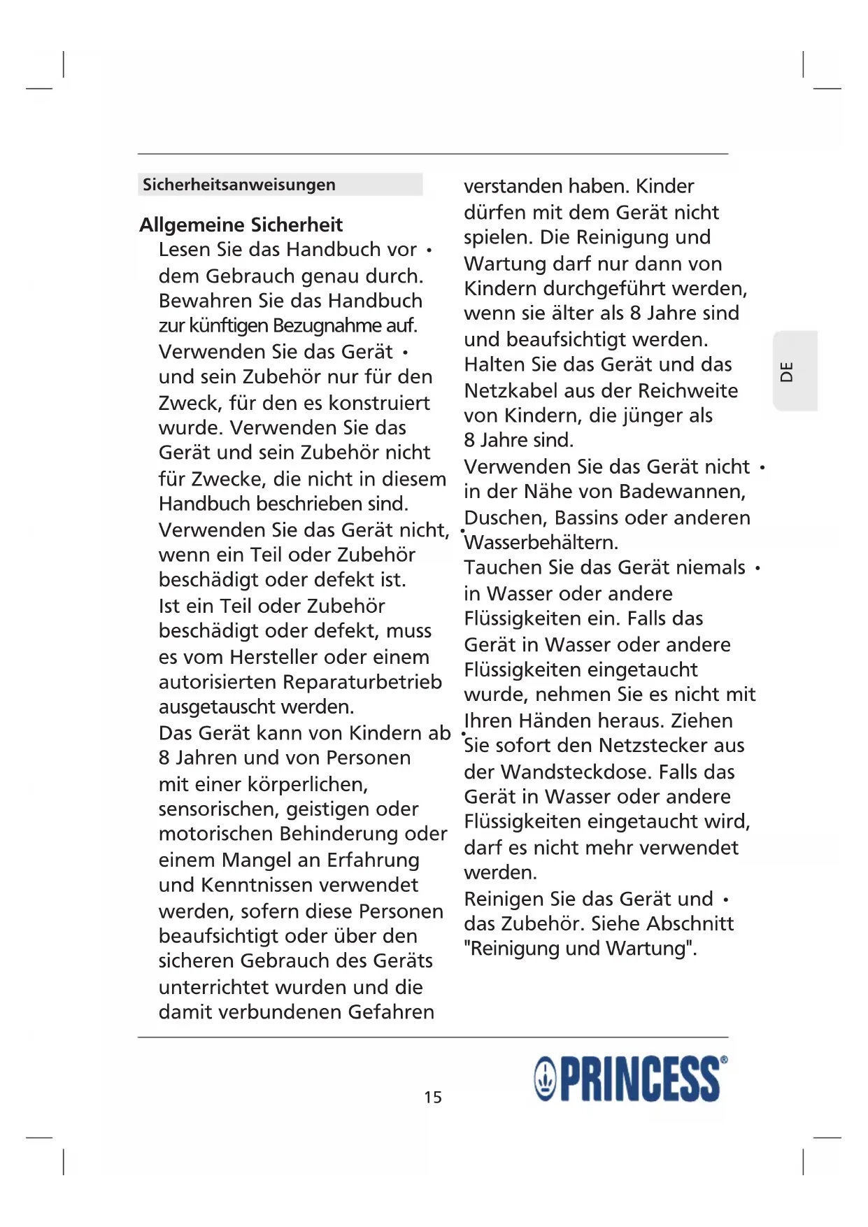 Bewegen Sie das Gerät nicht, • solange es eingeschaltet oder noch heiß ist. Ziehen Sie den Netzstecker aus der Wand- steckdose und warten Sie, bis das Gerät abgekühlt ist. Reinigung und Wartung Das Gerät muss nach jedem Gebrauch gereinigt werden. Achtung! - Schalten Sie das Gerät vor der Reinigung und Wartung aus, ziehen Sie den Netzstecker aus der Wandsteckdose und warten Sie, bis das Gerät abgekühlt ist. - Tauchen Sie das Gerät niemals in Wasser oder andere Flüssigkeiten ein. Vorsicht! - Verwenden Sie keine aggressiven oder scheuernden Mittel, um das Gerät zu reinigen. - Verwenden Sie keine scharfen Gegenstände, um das Gerät zu reinigen. - Reinigen Sie das Zubehör nicht in der Geschirrspülmaschine. Reinigen Sie das Gerät und die Heizelemente • mit einem weichen feuchten Lappen. Trocknen Sie das Gerät und die Heizelemente gründlich mit einem sauberen, trockenen Lappen. Reinigen Sie die Heizelemente mit einem • weichen, feuchten Lappen. Trocknen Sie die Heizelemente gründlich mit einem sauberen, trockenen Lappen. Reinigen Sie den Innentopf in Seifenwasser. • Spülen Sie den Innentopf unter fließendem Wasser. Trocknen Sie den Innentopf gründlich ab. Reinigen Sie den Reislöffel und den • Messbecher in Seifenwasser. Spülen Sie den Reislöffel und den Messbecher unter fließendem Wasser. Trocknen Sie den Reislöffel und den Messbecher gründlich. Beschreibung (Abb. A) Ihr 271940 Princess Reiskocher wurde zum Kochen von Reis konstruiert. Das Gerät ist nur für den Gebrauch in geschlossenen Räumen geeignet. Das Gerät ist nur für den Hausgebrauch geeignet.
