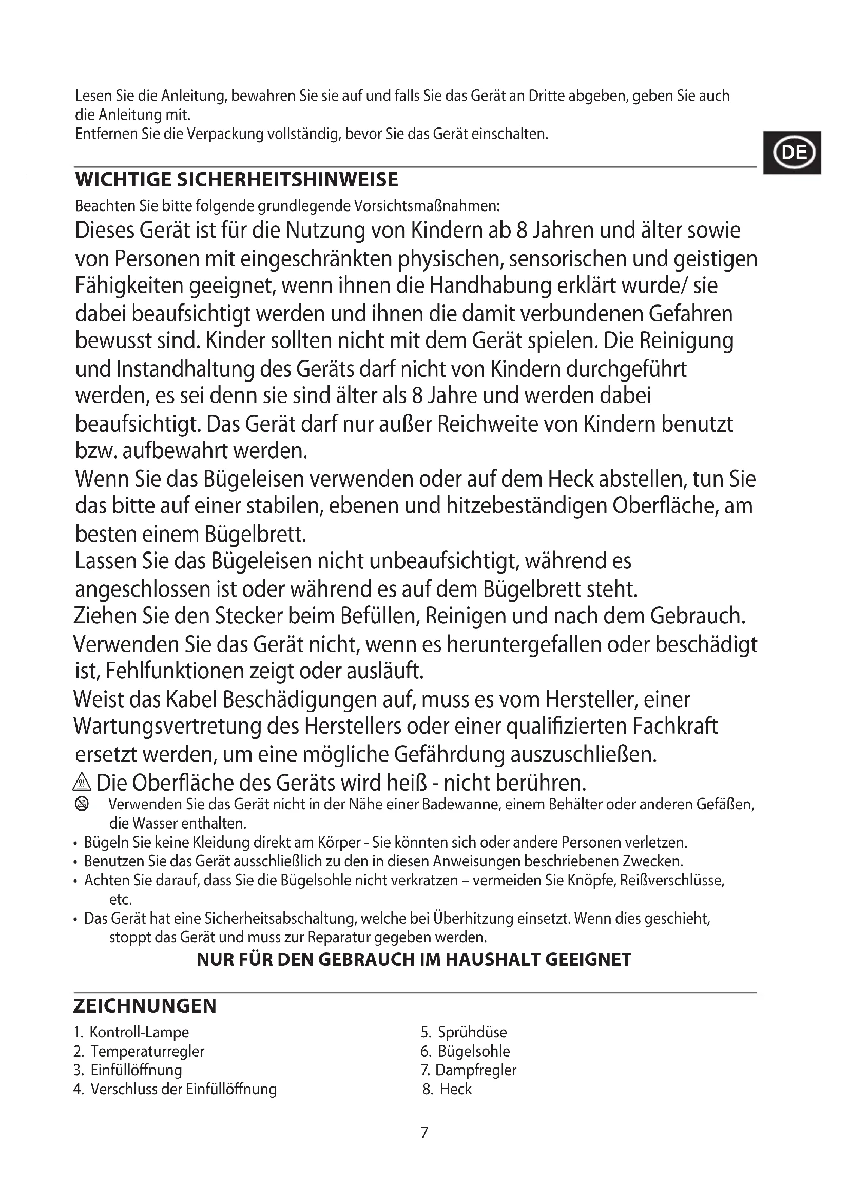 To avoid environmental and health problems due to hazardous substances, appliances and rechargeable and non-rechargeable batteries marked with one of these symbols must not be disposed of with unsorted municipal waste. Always dispose of electrical and electronic products and, where applicable, rechargeable and non-rechargeable batteries, at an appropriate official recycling/collection point.7 Lesen Sie die Anleitung, bewahren Sie sie auf und falls Sie das Gerät an Dritte abgeben, geben Sie auch die Anleitung mit. Entfernen Sie die Verpackung vollständig, bevor Sie das Gerät einschalten. WICHTIGE SICHERHEITSHINWEISE Beachten Sie bitte folgende grundlegende Vorsichtsmaßnahmen: Dieses Gerät ist für die Nutzung von Kindern ab 8 Jahren und älter sowie von Personen mit eingeschränkten physischen, sensorischen und geistigen Fähigkeiten geeignet, wenn ihnen die Handhabung erklärt wurde/ sie dabei beaufsichtigt werden und ihnen die damit verbundenen Gefahren bewusst sind. Kinder sollten nicht mit dem Gerät spielen. Die Reinigung und Instandhaltung des Geräts darf nicht von Kindern durchgeführt werden, es sei denn sie sind älter als 8 Jahre und werden dabei beaufsichtigt. Das Gerät darf nur außer Reichweite von Kindern benutzt bzw. aufbewahrt werden. Wenn Sie das Bügeleisen verwenden oder auf dem Heck abstellen, tun Sie das bitte auf einer stabilen, ebenen und hitzebeständigen Oberfläche, am besten einem Bügelbrett. Lassen Sie das Bügeleisen nicht unbeaufsichtigt, während es angeschlossen ist oder während es auf dem Bügelbrett steht. Ziehen Sie den Stecker beim Befüllen, Reinigen und nach dem Gebrauch. Verwenden Sie das Gerät nicht, wenn es heruntergefallen oder beschädigt ist, Fehlfunktionen zeigt oder ausläuft. Weist das Kabel Beschädigungen auf, muss es vom Hersteller, einer Wartungsvertretung des Herstellers oder einer qualifizierten Fachkraft ersetzt werden, um eine mögliche Gefährdung auszuschließen. h Die Oberfläche des Geräts wird heiß - nicht berühren. b Verwenden Sie das Gerät nicht in der Nähe einer Badewanne, einem Behälter oder anderen Gefäßen, die Wasser enthalten.