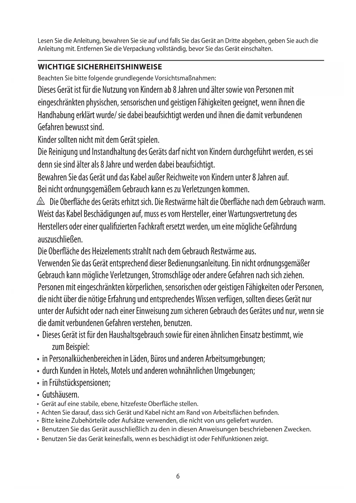 Die Oberäche des Geräts erhitzt sich. Die Restwärme hält die Oberäche nach dem Gebrauch warm. Weist das Kabel Beschädigungen auf, muss es vom Hersteller, einer Wartungsvertretung des Herstellers oder einer qualizierten Fachkraft ersetzt werden, um eine mögliche Gefährdung auszuschließen. Die Oberäche des Heizelements strahlt nach dem Gebrauch Restwärme aus. Verwenden Sie das Gerät entsprechend dieser Bedienungsanleitung. Ein nicht ordnungsgemäßer Gebrauch kann mögliche Verletzungen, Stromschläge oder andere Gefahren nach sich ziehen. Personen mit eingeschränkten körperlichen, sensorischen oder geistigen Fähigkeiten oder Personen, die nicht über die nötige Erfahrung und entsprechendes Wissen verfügen, sollten dieses Gerät nur unter der Aufsicht oder nach einer Einweisung zum sicheren Gebrauch des Gerätes und nur, wenn sie die damit verbundenen Gefahren verstehen, benutzen.