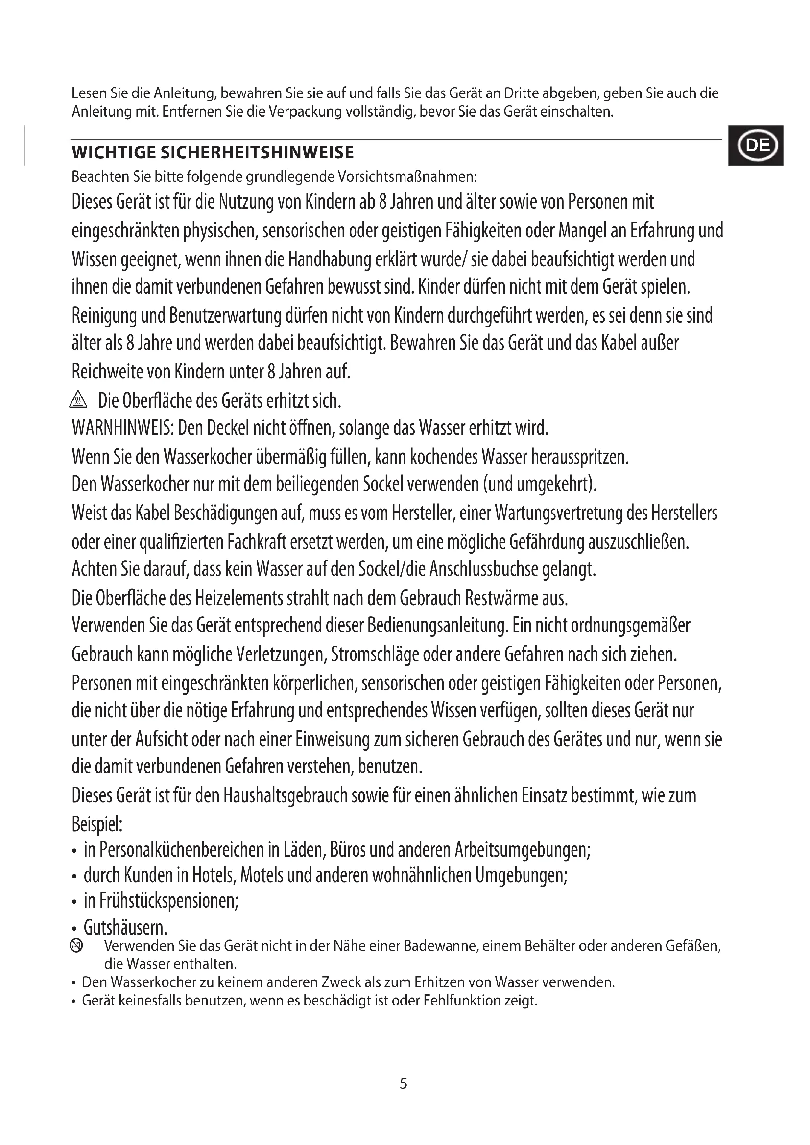 To avoid environmental and health problems due to hazardous substances, appliances and rechargeable and non-rechargeable batteries marked with one of these symbols must not be disposed of with unsorted municipal waste. Always dispose of electrical and electronic products and, where applicable, rechargeable and non-rechargeable batteries, at an appropriate ocial recycling/collection point.5 Lesen Sie die Anleitung, bewahren Sie sie auf und falls Sie das Gerät an Dritte abgeben, geben Sie auch die Anleitung mit. Entfernen Sie die Verpackung vollständig, bevor Sie das Gerät einschalten. WICHTIGE SICHERHEITSHINWEISE Beachten Sie bitte folgende grundlegende Vorsichtsmaßnahmen: Dieses Gerät ist für die Nutzung von Kindern ab 8 Jahren und älter sowie von Personen mit eingeschränkten physischen, sensorischen oder geistigen Fähigkeiten oder Mangel an Erfahrung und Wissen geeignet, wenn ihnen die Handhabung erklärt wurde/ sie dabei beaufsichtigt werden und ihnen die damit verbundenen Gefahren bewusst sind. Kinder dürfen nicht mit dem Gerät spielen. Reinigung und Benutzerwartung dürfen nicht von Kindern durchgeführt werden, es sei denn sie sind älter als 8 Jahre und werden dabei beaufsichtigt. Bewahren Sie das Gerät und das Kabel außer Reichweite von Kindern unter 8 Jahren auf. h Die Oberäche des Geräts erhitzt sich. WARNHINWEIS: Den Deckel nicht önen, solange das Wasser erhitzt wird. Wenn Sie den Wasserkocher übermäßig füllen, kann kochendes Wasser herausspritzen. Den Wasserkocher nur mit dem beiliegenden Sockel verwenden (und umgekehrt). Weist das Kabel Beschädigungen auf, muss es vom Hersteller, einer Wartungsvertretung des Herstellers oder einer qualizierten Fachkraft ersetzt werden, um eine mögliche Gefährdung auszuschließen. Achten Sie darauf, dass kein Wasser auf den Sockel/die Anschlussbuchse gelangt. Die Oberäche des Heizelements strahlt nach dem Gebrauch Restwärme aus. Verwenden Sie das Gerät entsprechend dieser Bedienungsanleitung. Ein nicht ordnungsgemäßer Gebrauch kann mögliche Verletzungen, Stromschläge oder andere Gefahren nach sich ziehen. Personen mit eingeschränkten körperlichen, sensorischen oder geistigen Fähigkeiten oder Personen, die nicht über die nötige Erfahrung und entsprechendes Wissen verfügen, sollten dieses Gerät nur unter der Aufsicht oder nach einer Einweisung zum sicheren Gebrauch des Gerätes und nur, wenn sie die damit verbundenen Gefahren verstehen, benutzen. Dieses Gerät ist für den Haushaltsgebrauch sowie für einen ähnlichen Einsatz bestimmt, wie zum Beispiel: