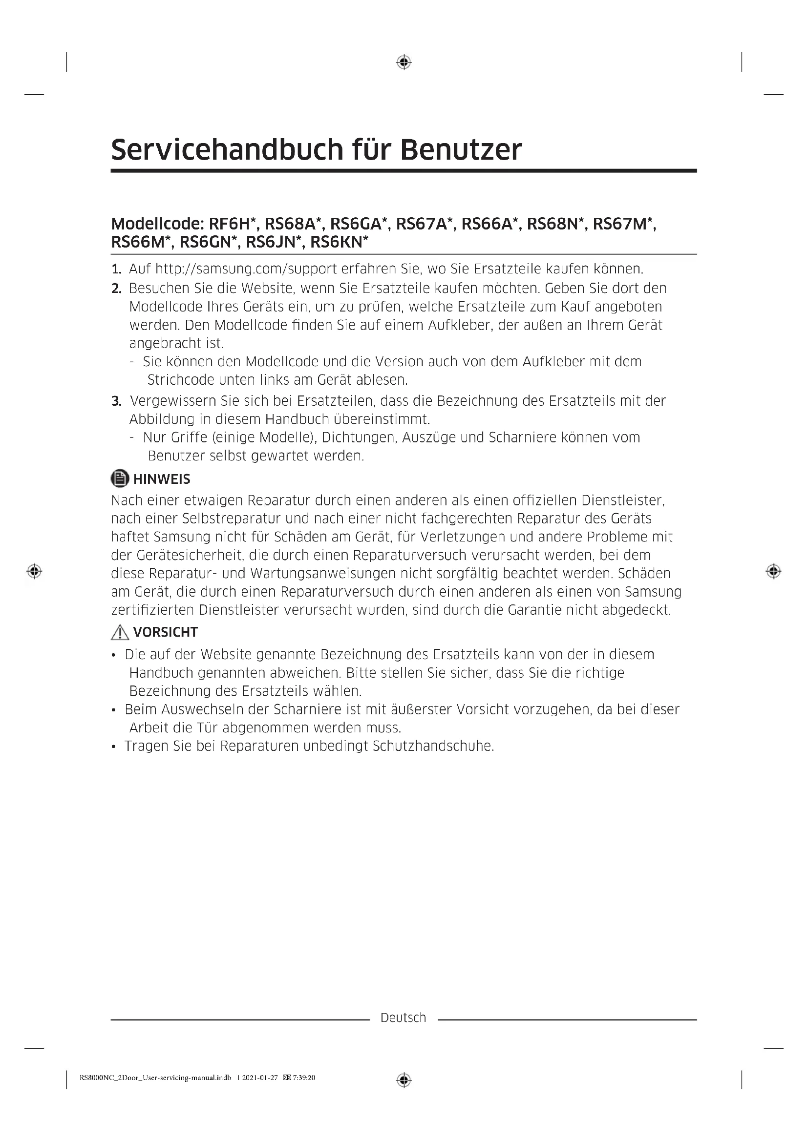 Abbildung in diesem Handbuch übereinstimmt. - Nur Griffe (einige Modelle), Dichtungen, Auszüge und Scharniere können vom Benutzer selbst gewartet werden. HINWEIS Nach einer etwaigen Reparatur durch einen anderen als einen ofziellen Dienstleister, nach einer Selbstreparatur und nach einer nicht fachgerechten Reparatur des Geräts haftet Samsung nicht für Schäden am Gerät, für Verletzungen und andere Probleme mit der Gerätesicherheit, die durch einen Reparaturversuch verursacht werden, bei dem diese Reparatur- und Wartungsanweisungen nicht sorgfältig beachtet werden. Schäden am Gerät, die durch einen Reparaturversuch durch einen anderen als einen von Samsung zertizierten Dienstleister verursacht wurden, sind durch die Garantie nicht abgedeckt. VORSICHT