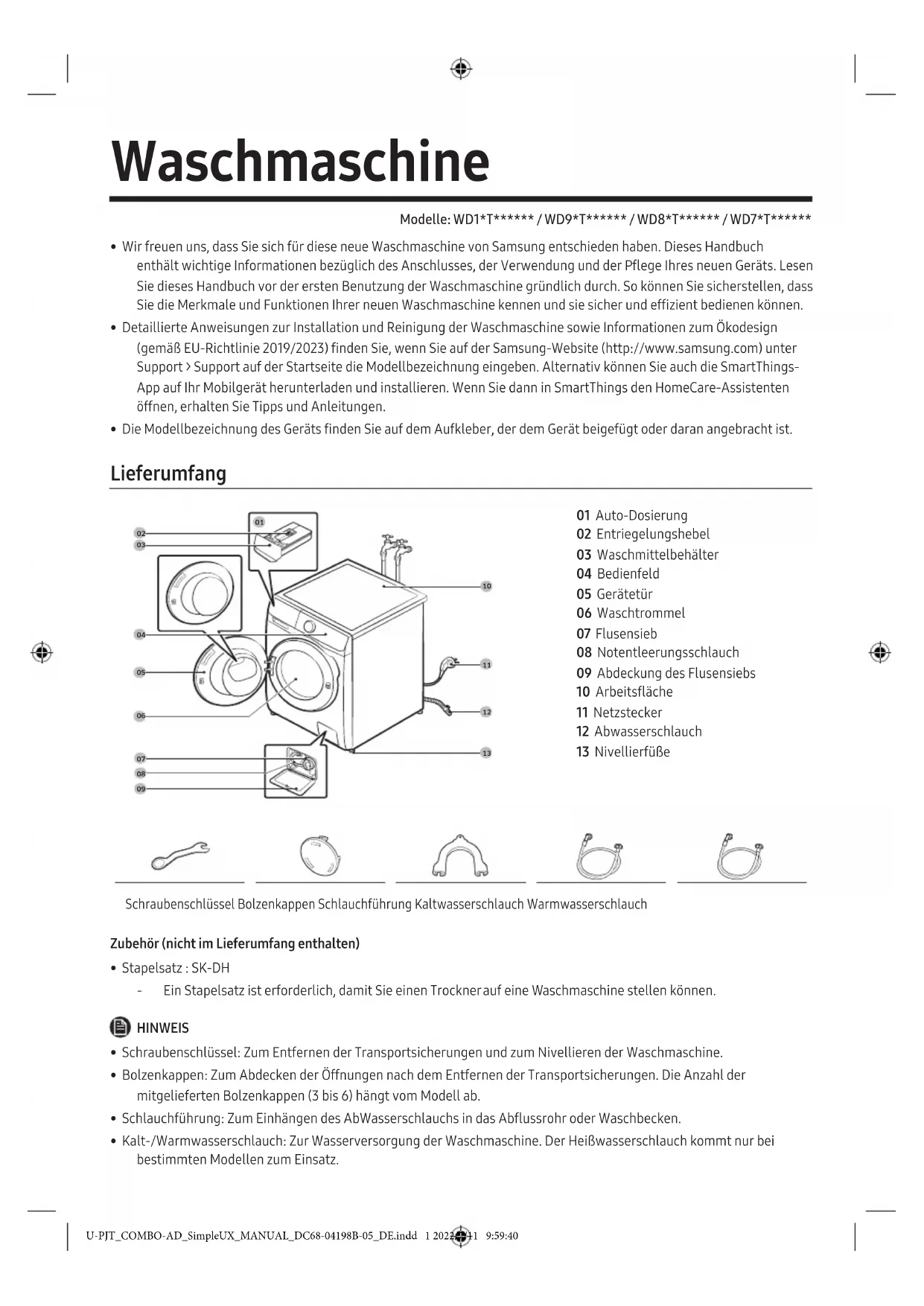 690 mm (WD**T*8****, WD**T*5****) 680 mm (WD**T*3****, WD**T*0****) 690 mm (WD**T*8****, WD**T*5****) 680 mm (WD**T*3****, WD**T*0****) E 1120 mm 1120 mm Wasserdruck 50-1000 kPa 50-1000 kPa Nettogewicht 86 kg 68 kg Maximale Füllmenge Waschen und Drehen 8,0 kg 8,0 kg Trocknen 5,0 kg 5,0 kg Leistungsaufnahme Waschen und Schleudern 220-240 V AC bei 50 Hz 2000-2300 W 1900-2300 W Trocknen 1600-1900 W 1600-1900 W Schleuderdrehzahl 1400 RPM 1400 RPM U-PJT_COMBO-AD_SimpleUX_MANUAL_DC68-04198B-05_DE.indd 31 2022/7/11 9:59:45DC68-04198B-05 Die Sternchen „*“ kennzeichnen Modellvarianten und können für Ziffern (0-9) oder Buchstaben (A-Z) stehen. Typ Frontlader-Waschtrockner Modellname WD7*T****** Abmessungen A (Breite) 600 mm B (Höhe) 850 mm C (Tiefe) 550 mm