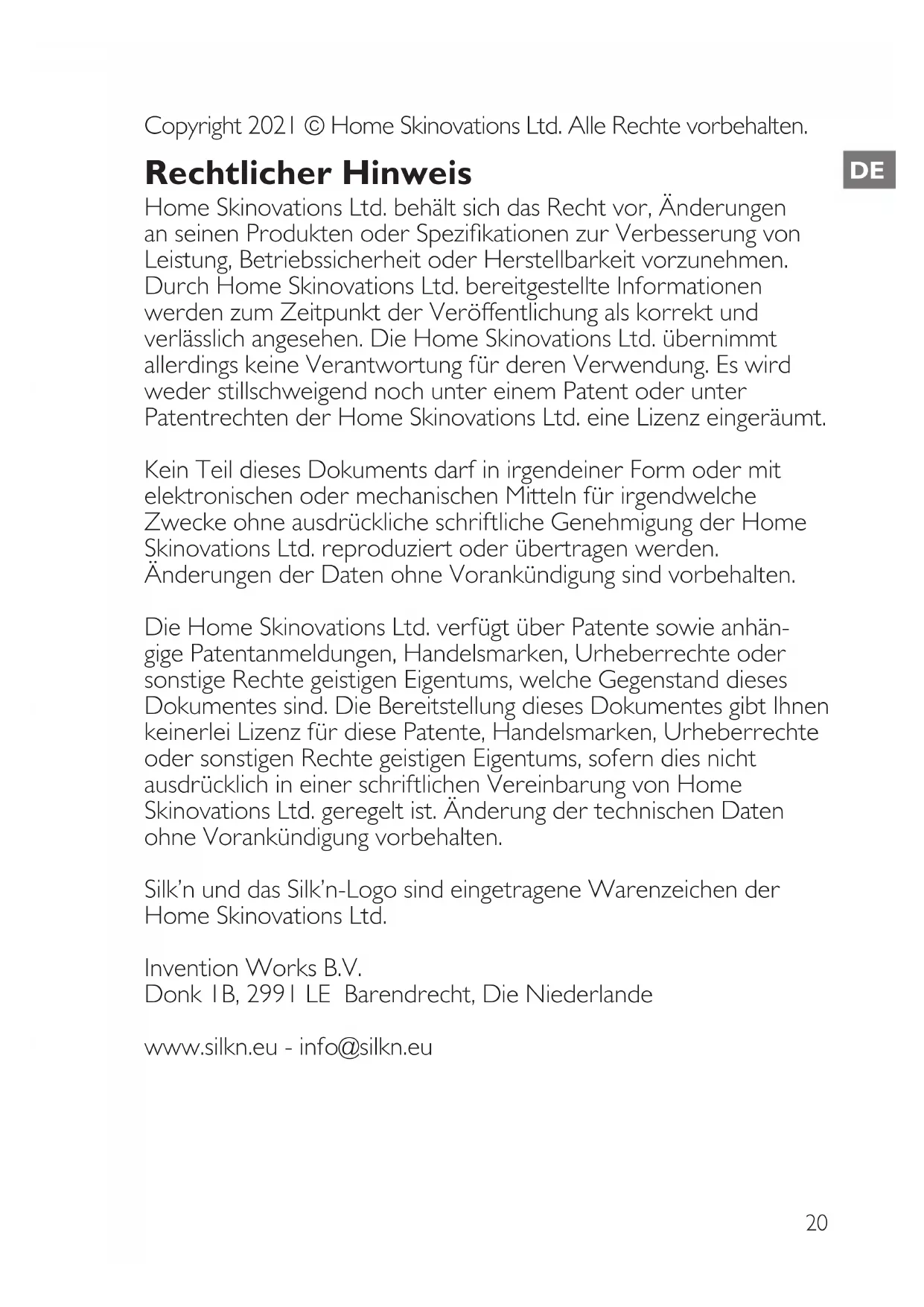 Copyright 2021 © Home Skinovations Ltd. Alle Rechte vorbehalten. Rechtlicher Hinweis Home Skinovations Ltd. behält sich das Recht vor, Änderungen an seinen Produkten oder Spezifikationen zur Verbesserung von Leistung, Betriebssicherheit oder Herstellbarkeit vorzunehmen. Durch Home Skinovations Ltd. bereitgestellte Informationen werden zum Zeitpunkt der Veröentlichung als korrekt und verlässlich angesehen. Die Home Skinovations Ltd. übernimmt allerdings keine Verantwortung für deren Verwendung. Es wird weder stillschweigend noch unter einem Patent oder unter Patentrechten der Home Skinovations Ltd. eine Lizenz eingeräumt. Kein Teil dieses Dokuments darf in irgendeiner Form oder mit elektronischen oder mechanischen Mitteln für irgendwelche Zwecke ohne ausdrückliche schriftliche Genehmigung der Home Skinovations Ltd. reproduziert oder übertragen werden. Änderungen der Daten ohne Vorankündigung sind vorbehalten. Die Home Skinovations Ltd. verfügt über Patente sowie anhän- gige Patentanmeldungen, Handelsmarken, Urheberrechte oder sonstige Rechte geistigen Eigentums, welche Gegenstand dieses Dokumentes sind. Die Bereitstellung dieses Dokumentes gibt Ihnen keinerlei Lizenz für diese Patente, Handelsmarken, Urheberrechte oder sonstigen Rechte geistigen Eigentums, sofern dies nicht ausdrücklich in einer schriftlichen Vereinbarung von Home Skinovations Ltd. geregelt ist. Änderung der technischen Daten ohne Vorankündigung vorbehalten. Silk’n und das Silk’n-Logo sind eingetragene Warenzeichen der Home Skinovations Ltd. Invention Works B.V. Donk 1B, 2991 LE Barendrecht, Die Niederlande www.silkn.eu - info@silkn.eu21