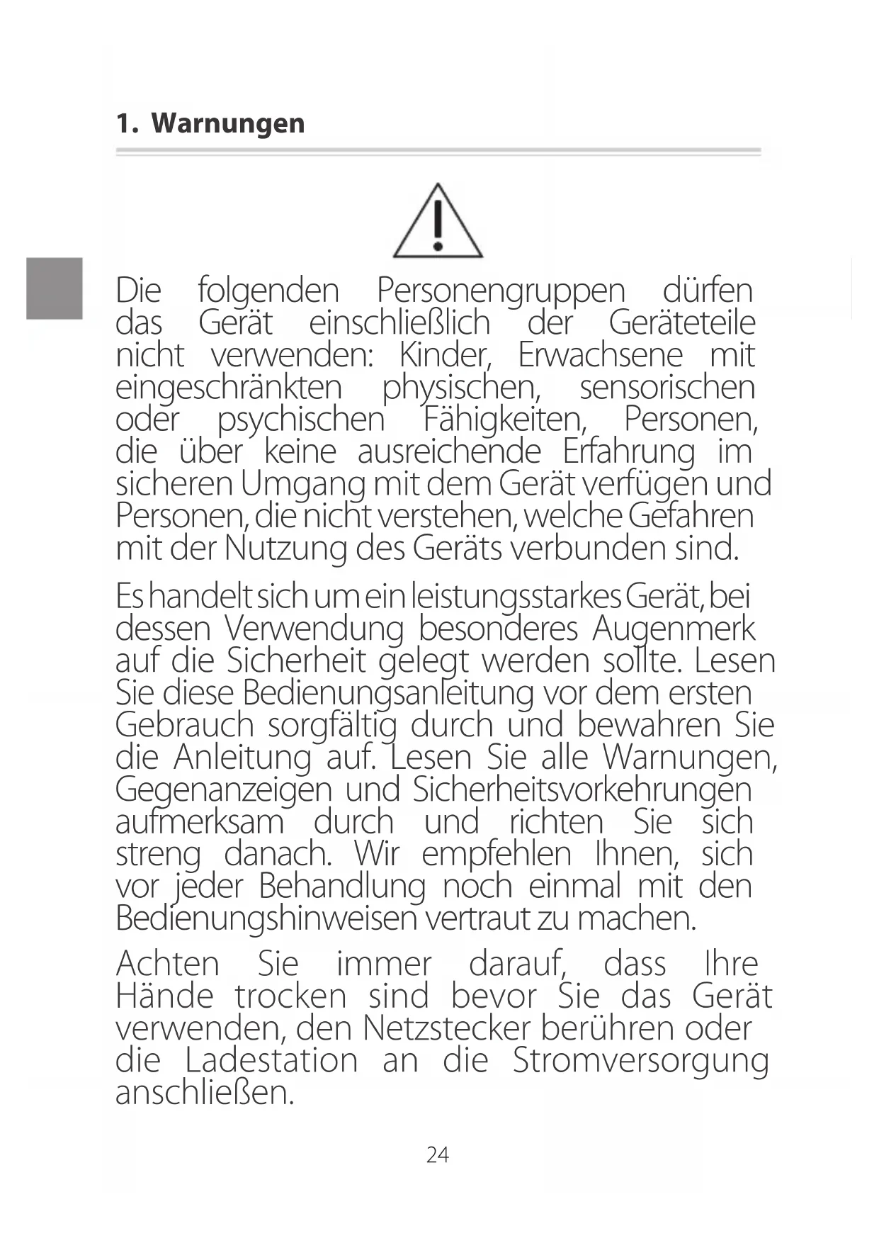 Die folgenden Personengruppen dürfen das Gerät einschließlich der Geräteteile nicht verwenden: Kinder, Erwachsene mit eingeschränkten physischen, sensorischen oder psychischen Fähigkeiten, Personen, die über keine ausreichende Erfahrung im sicheren Umgang mit dem Gerät verfügen und Personen, die nicht verstehen, welche Gefahren mit der Nutzung des Geräts verbunden sind. Es handelt sich um ein leistungsstarkes Gerät, bei dessen Verwendung besonderes Augenmerk auf die Sicherheit gelegt werden sollte. Lesen Sie diese Bedienungsanleitung vor dem ersten Gebrauch sorgfältig durch und bewahren Sie die Anleitung auf. Lesen Sie alle Warnungen, Gegenanzeigen und Sicherheitsvorkehrungen aufmerksam durch und richten Sie sich streng danach. Wir empfehlen Ihnen, sich vor jeder Behandlung noch einmal mit den Bedienungshinweisen vertraut zu machen. Achten Sie immer darauf, dass Ihre Hände trocken sind bevor Sie das Gerät verwenden, den Netzstecker berühren oder die Ladestation an die Stromversorgung anschließen. FaceTite 3.0 EU124 ALL ED514-21 PB118056A-21 release.indd 24FaceTite 3.0 EU124 ALL ED514-21 PB118056A-21 release.indd 24 24/01/2021 12:42:5924/01/2021 12:42:59DEDE