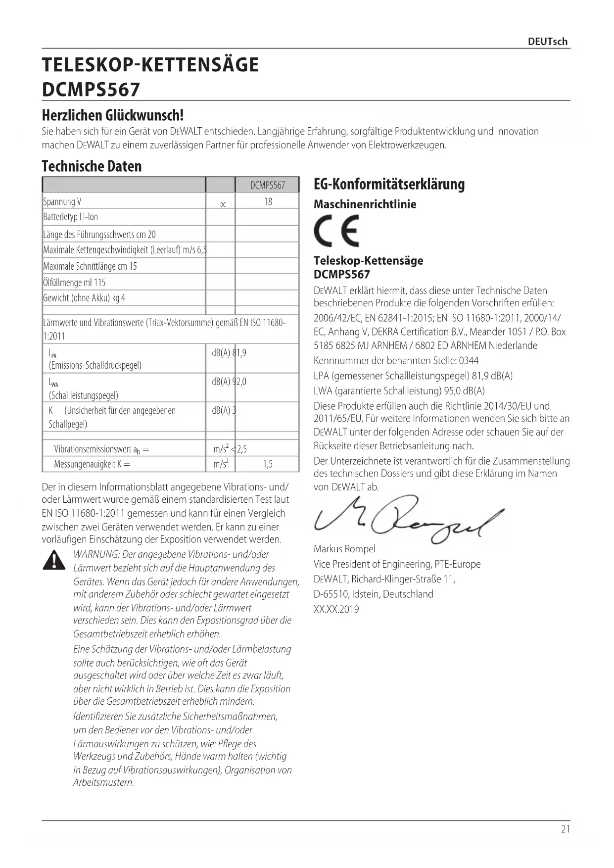 WARNUNG: Der angegebene Vibrations- und/oder Lärmwert bezieht sich auf die Hauptanwendung des Gerätes. Wenn das Gerät jedoch für andere Anwendungen, mit anderem Zubehör oder schlecht gewartet eingesetzt wird, kann der Vibrations- und/oder Lärmwert verschieden sein. Dies kann den Expositionsgrad über die Gesamtbetriebszeit erheblich erhöhen. Eine Schätzung der Vibrations- und/oder Lärmbelastung sollte auch berücksichtigen, wie oft das Gerät ausgeschaltet wird oder über welche Zeit es zwar läuft, aber nicht wirklich in Betrieb ist. Dies kann die Exposition über die Gesamtbetriebszeit erheblich mindern. Identifizieren Sie zusätzliche Sicherheitsmaßnahmen, um den Bediener vor den Vibrations- und/oder Lärmauswirkungen zu schützen, wie: Pflege des Werkzeugs und Zubehörs, Hände warm halten (wichtig in Bezug auf Vibrationsauswirkungen), Organisation von Arbeitsmustern. EG-Konformitätserklärung Maschinenrichtlinie Teleskop-Kettensäge DCMPS567 DeWALT erklärt hiermit, dass diese unter Technische Daten beschriebenen Produkte die folgenden Vorschriften erfüllen: