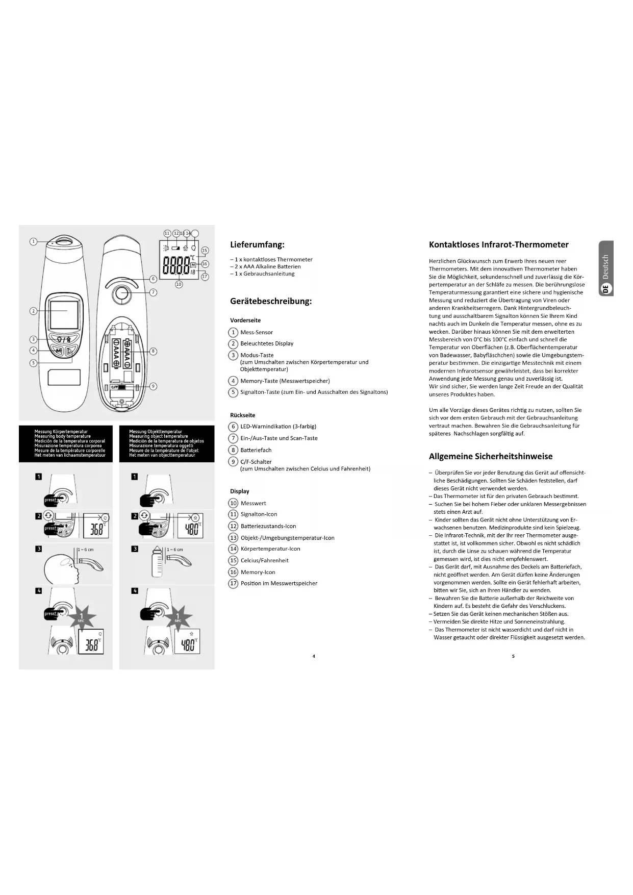 Wissenswertes zur Temperaturmessung an der Schläfe Das kontaktlose Thermometer misst die von der Haut aus- gestrahlte Infrarotenergie der Schläfe. Dabei wird der Wert der abgestrahlten Energie an der Schläfe gemessen und mit der Umgebungstemperatur in einen Körpertemperaturwert umgewandelt. Das Messergebnis wird innerhalb einer Sekun- de angezeigt. Von Fieber spricht man, wenn die Körpertemperatur über 38 Grad Celsius steigt. Das Fieber ist ein Zeichen dafür, dass unser Körper sich mit Krankheitserregern auseinandersetzt. Messergebnisse von verschiedenen Körperstellen sollten nicht miteinander verglichen werden, da auch im eber- freien Zustand eine Temperaturverteilung im menschlichen Körper normal ist. Je nach Tageszeit und Alter der Person können ebenfalls Schwankungen bei der Körpertemperatur aureten. Grundsätzlich wird zwischen der Körperkerntem- peratur und der Oberächentemperatur entschieden. Die gemessene Körperkerntemperatur (rektal gemessen) kann verglichen mit der Oberächentemperatur (an der Schläfe gemessen) je nach Fieberverlauf durchaus höher liegen. Im Stadium des Aueberns konserviert der Körper die Wärme im Inneren. Dies führt zu einer vorübergehenden Abkühlung der Haut bei bereits vorhandenem Fieber. In diesem Fall kann die mit dem kontaktlosen Thermometer gemessene Oberächentemperatur außergewöhnlich niedrig sein. Hier empehlt sich eine Kontrollmessung mit einem herkömmlichen Fieberthermometer, das sich für die rektale Messung eignet. Eine Messung der Körperkerntemperatur mit einem rektalen Fieberthermometer ist empfehlenswert: – Wenn das Messergebnis überraschend niedrig ist – Bei Neugeborenen innerhalb der ersten 100 Tage – Bei Kindern unter 3 Jahren, die ein gefährdetes Immun- system haben oder bei Aureten bzw. Nicht-Aureten von Fieber bedenklich reagieren. Wenn Sie sich bei der Interpretaon der Ergebnisse unsicher sind, oder abnorme Werte (z.B. Fieber) aureten, sollten Sie einen Arzt aufsuchen. Inbetriebnahme Bei Erstbetrieb müssen die Baerien in das Thermometer eingesetzt werden. Achten Sie beim Einsetzen auf die rich- ge Polarität (+/–) der Baerien. Messung der Körpertemperatur Das Thermometer wurde so entwickelt, dass es die Körpertem- peratur über der Augenbraue, im Verlauf zwischen Srn und Schläfe misst. Wird an einer anderen Körperstelle gemessen, können ungenaue Messdaten dabei herauskommen. – Vergewissern Sie sich vor jeder Messung, dass der Sensor sauber ist. Ist dies nicht der Fall, nehmen Sie bie eine Reini- gung entsprechend Seite 10 vor. – Prüfen Sie ob die Srn feucht ist (Cool Skin Eekt). Diese muss absolut trocken sein. – Achten Sie darauf, dass die Schläfen frei von Verschmutzung und Kosmek sind. Vermeiden Sie die Messung auf eventuell vorhandenen Narben. – Gefäßverengende Medikamente können den Messwert beeinussen. – Tragbare und mobile Kommunikaonsgeräte können das Gerät beeinussen. – Warten Sie mindestens 30 Minuten nach sportlichen Betä- gungen, nach dem Baden oder nach dem Essen mit einer Messung. – Verwenden Sie das Thermometer wenn möglich nicht im Außenbereich, sondern nur in geschlossenen Räumen. Die äußeren Einüsse wie z.B. Wind und Außentemperatur können das Messergebnis beeinussen. – Wenn das Gerät aus einer Umgebung mit extremer Tempe- ratur kommt, bewahren Sie es mindestens eine Stunde bei Raumtemperatur auf, bevor Sie eine Messung durchführen. – Wird das Thermometer vor der Messung zu lange in der Hand gehalten, führt dies zur Erwärmung des Gerätes. Dadurch kann das Messergebnis verfälscht werden. DE Deutsch DE Deutsch Verbrauchte Baerien gehören nicht in den Hausmüll. Die beiliegenden Baerien dürfen nicht geladen oder mit anderen Mieln reakviert, nicht auseinandergenom- men, in ein Feuer oder kurzgeschlossen werden. Baeri- en müssen umweltgerecht entsorgt werden. Enernen Sie die Baerien aus dem Gerät, wenn es längere Zeit nicht benutzt wird.8 9 Fieberalarm Das Thermometer hat eine eingebaute opsche LED- Warnindikaon bei erhöhter Körpertemperatur. Messung der Objekt-/ Umgebungstemperatur Die Messung von Flüssigkeiten sollte, wenn möglich, außerhalb des Gefäßes erfolgen, um einen Feuchgkeitsniederschlag auf dem Sensor zu vermeiden. LED-Farbe Grün Orange Rot Gemessene KörpertemperaturNormale Körpertemperatur: 36,3°C – 37,3°C (97,3 – 99,1°F)Leicht erhöhte Körpertemperatur: 37,4°C – 37,9°C (99,2 – 100,2°F)Erhöhte Körpertemperatur: ≥ 38°C (100,3°F) Sonsges Automasche Abschaltung Das Gerät schaltet automasch nach ungefähr 30 Sekunden des Nichtgebrauchs aus. Messwertspeicher Das Thermometer speichert automasch die Tempe- raturwerte der letzten 19 Messungen. Werden die 19 Speicherplätze überschrien, wird der jeweils älteste Wert überschrieben. Signalton Umschalten °C auf °F