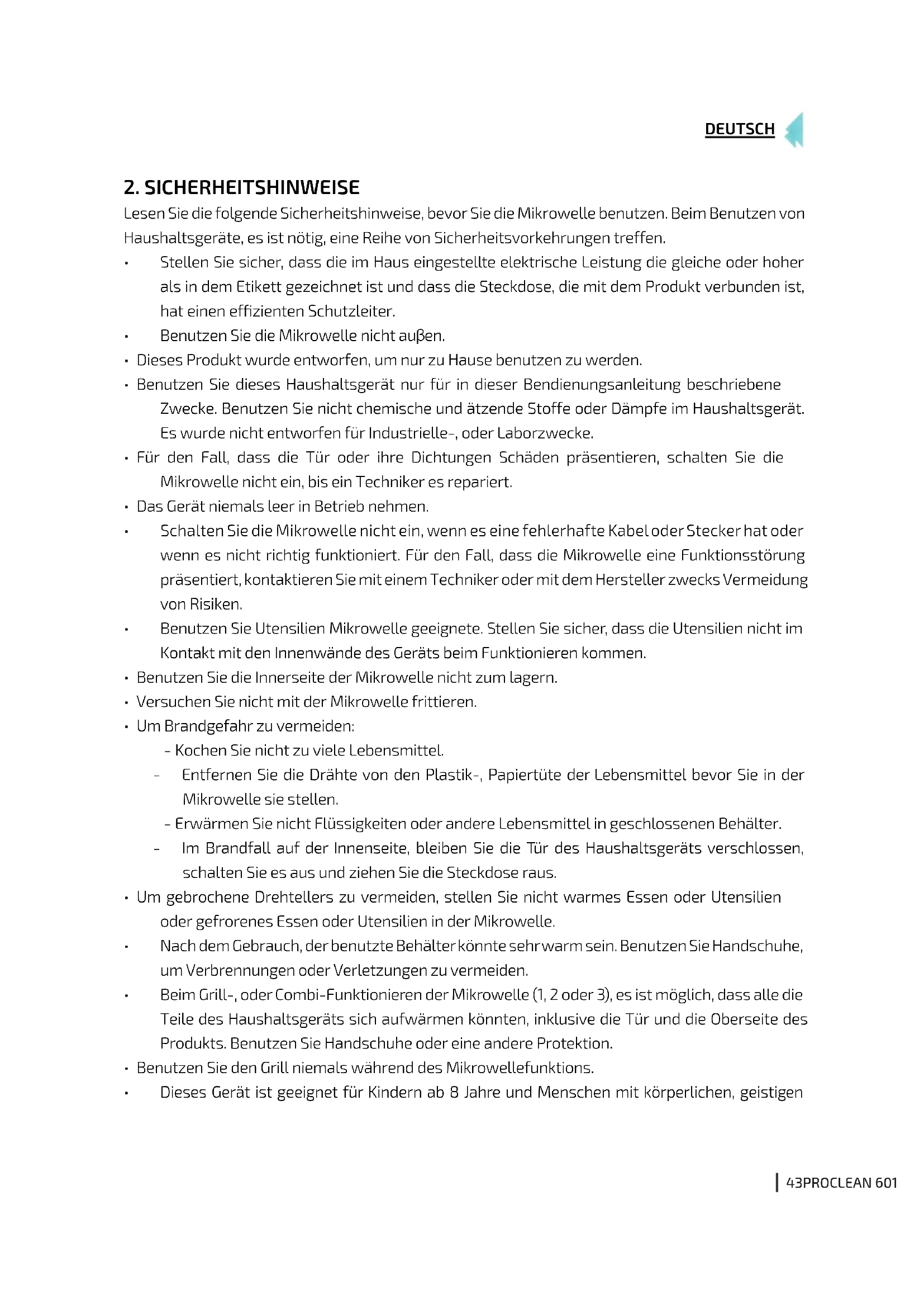 - Dieses Produkt gehört zu ISM Gruppe 2 Klasse B. Die Denition von Gruppe 2 umfasst alle ISM-Geräte, in denen Energie im Funkfrequenzbereich absichtlich erzeugt und/oder in Form von elektromagnetischer Strahlung oder mittels induktiver oder kapazitiver Kopplung zur Behandlung von Material oder zu Materialprüfungs- oder -analysezwecken verwendet wird. HINWEIS: Reparatur oder Warnung, die eine Entfernung von den Decken der Kabeln brauchen, müssen bei einem qualizierten Techniker durchgeführt sein. HINWEIS: Es ist wichtig, vereinbare Materialien und Behälter benutzen, um mit Sicherheit mit der Mikrowelle zu benutzen. In der folgenden Tabelle wurden die geeignete Materialien beschrieben: Material des Behälters Grill Combi Mikrowelle Notizen Hitzebeständige Keramik Ja Ja Ja Benutzen Sie niemals dekorierte Keramik mit Glas oder Verzierungen. Hitzebeständiges Plastik Nein Nein Ja Erwärmen Sie es niemals für lange Zeit. Hitzebeständiges Glas Ja Ja Ja Transparentfolie Nein Nein Ja Benutzen Sie es nicht für Fleisch. Die hohe Temperatur könnte es schaden. Grill Ja Ja Nein Metallischer Behälter Nein Nein Nein Die Strahlungen können nicht den Metal durchstechen. Lackierter Behälter Nein Nein Nein Etwas hitzebeständig. Bambus oder Papier Nein Nein Nein Etwas hitzebeständig. 01536_ProClean 6010_Manual_PE.indd 44 24/4/18 9:17DEUTSCH 45PROCLEAN 6010