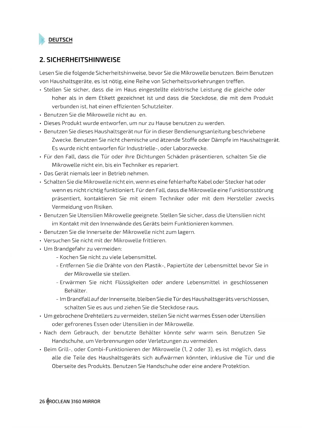 von diesen Gerüche loswerden, gehen wie nachfolgend beschrieben vor: - Stellen Sie ein Glas mit verschiedenen Zitronenscheiben im Inneren der Mikrowelle und erwärmen Sie es mit hoher Leistung für 2 oder 3 Minuten. - Stellen Sie ein Glas mit Rotblatttee im Inneren der Mikrowelle und erwärmen Sie es mit hoher Leistung. - Stellen Sie Orangenschale im Inneren der Mikrowelle und erwärmen Sie es mit hoher Leistung für eine Minute.DEUTSCH 31PROCLEAN 3160 MIRROR