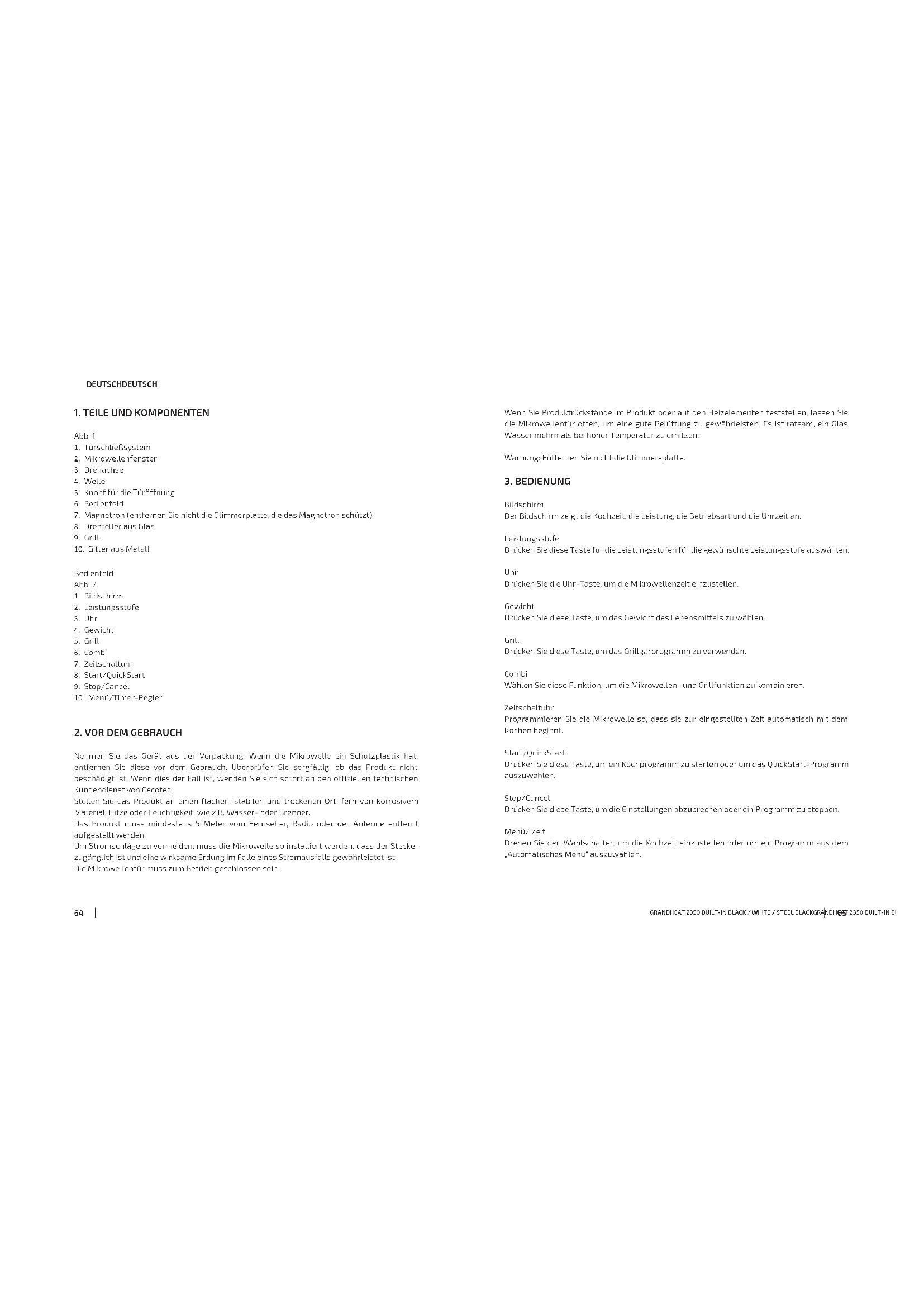 Bildschirm Der Bildschirm zeigt die Kochzeit, die Leistung, die Betriebsart und die Uhrzeit an.. Leistungsstufe Drücken Sie diese Taste für die Leistungsstufen für die gewünschte Leistungsstufe auswählen. Uhr Drücken Sie die Uhr-Taste, um die Mikrowellenzeit einzustellen. Gewicht Drücken Sie diese Taste, um das Gewicht des Lebensmittels zu wählen. Grill Drücken Sie diese Taste, um das Grillgarprogramm zu verwenden. Combi Wählen Sie diese Funktion, um die Mikrowellen- und Grillfunktion zu kombinieren. Zeitschaltuhr Programmieren Sie die Mikrowelle so, dass sie zur eingestellten Zeit automatisch mit dem Kochen beginnt. Start/QuickStart Drücken Sie diese Taste, um ein Kochprogramm zu starten oder um das QuickStart-Programm auszuwählen. Stop/Cancel Drücken Sie diese Taste, um die Einstellungen abzubrechen oder ein Programm zu stoppen. Menü/ Zeit Drehen Sie den Wahlschalter, um die Kochzeit einzustellen oder um ein Programm aus dem „Automatisches Menü“ auszuwählen. 01387_01388_01389_GrandHeat 2350 Built-In Black_White_Steel black_Manual_YV_01200623.indd 64-6501387_01388_01389_GrandHeat 2350 Built-In Black_White_Steel black_Manual_YV_01200623.indd 64-65 26/6/20 14:2026/6/20 14:20GRANDHEAT 2350 BUILT-IN BLACK / WHITE / STEEL BLACKGRANDHEAT 2350 BUILT-IN BLACK / WHITE / STEEL BLACK