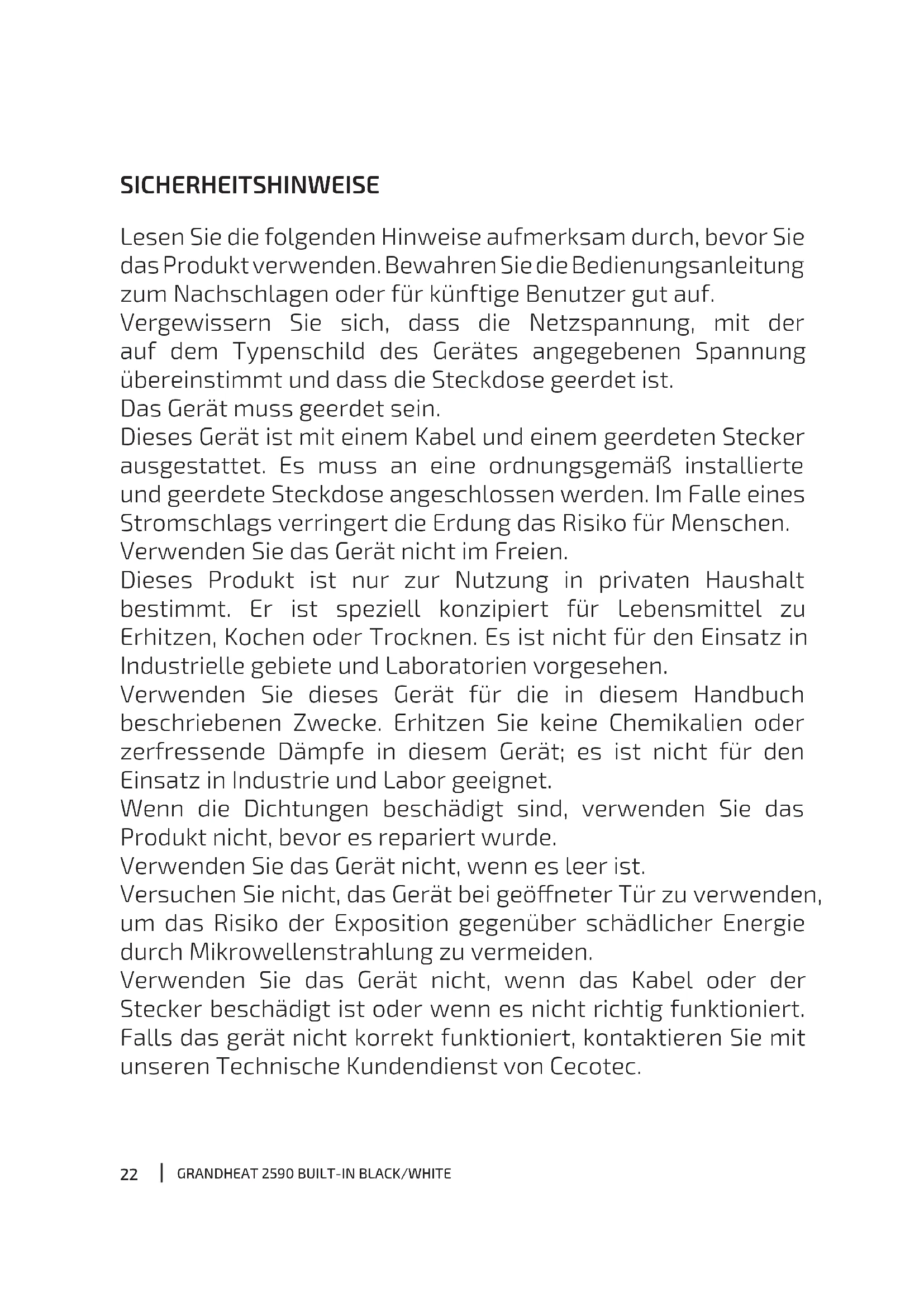 SICHERHEITSHINWEISE Lesen Sie die folgenden Hinweise aufmerksam durch, bevor Sie das Produkt verwenden. Bewahren Sie die Bedienungsanleitung zum Nachschlagen oder für künftige Benutzer gut auf. Vergewissern Sie sich, dass die Netzspannung, mit der auf dem Typenschild des Gerätes angegebenen Spannung übereinstimmt und dass die Steckdose geerdet ist. Das Gerät muss geerdet sein. Dieses Gerät ist mit einem Kabel und einem geerdeten Stecker ausgestattet. Es muss an eine ordnungsgemäß installierte und geerdete Steckdose angeschlossen werden. Im Falle eines Stromschlags verringert die Erdung das Risiko für Menschen. Verwenden Sie das Gerät nicht im Freien. Dieses Produkt ist nur zur Nutzung in privaten Haushalt bestimmt. Er ist speziell konzipiert für Lebensmittel zu Erhitzen, Kochen oder Trocknen. Es ist nicht für den Einsatz in Industrielle gebiete und Laboratorien vorgesehen. Verwenden Sie dieses Gerät für die in diesem Handbuch beschriebenen Zwecke. Erhitzen Sie keine Chemikalien oder zerfressende Dämpfe in diesem Gerät; es ist nicht für den Einsatz in Industrie und Labor geeignet. Wenn die Dichtungen beschädigt sind, verwenden Sie das Produkt nicht, bevor es repariert wurde. Verwenden Sie das Gerät nicht, wenn es leer ist. Versuchen Sie nicht, das Gerät bei geöneter Tür zu verwenden, um das Risiko der Exposition gegenüber schädlicher Energie durch Mikrowellenstrahlung zu vermeiden. Verwenden Sie das Gerät nicht, wenn das Kabel oder der Stecker beschädigt ist oder wenn es nicht richtig funktioniert. Falls das gerät nicht korrekt funktioniert, kontaktieren Sie mit unseren Technische Kundendienst von Cecotec.23