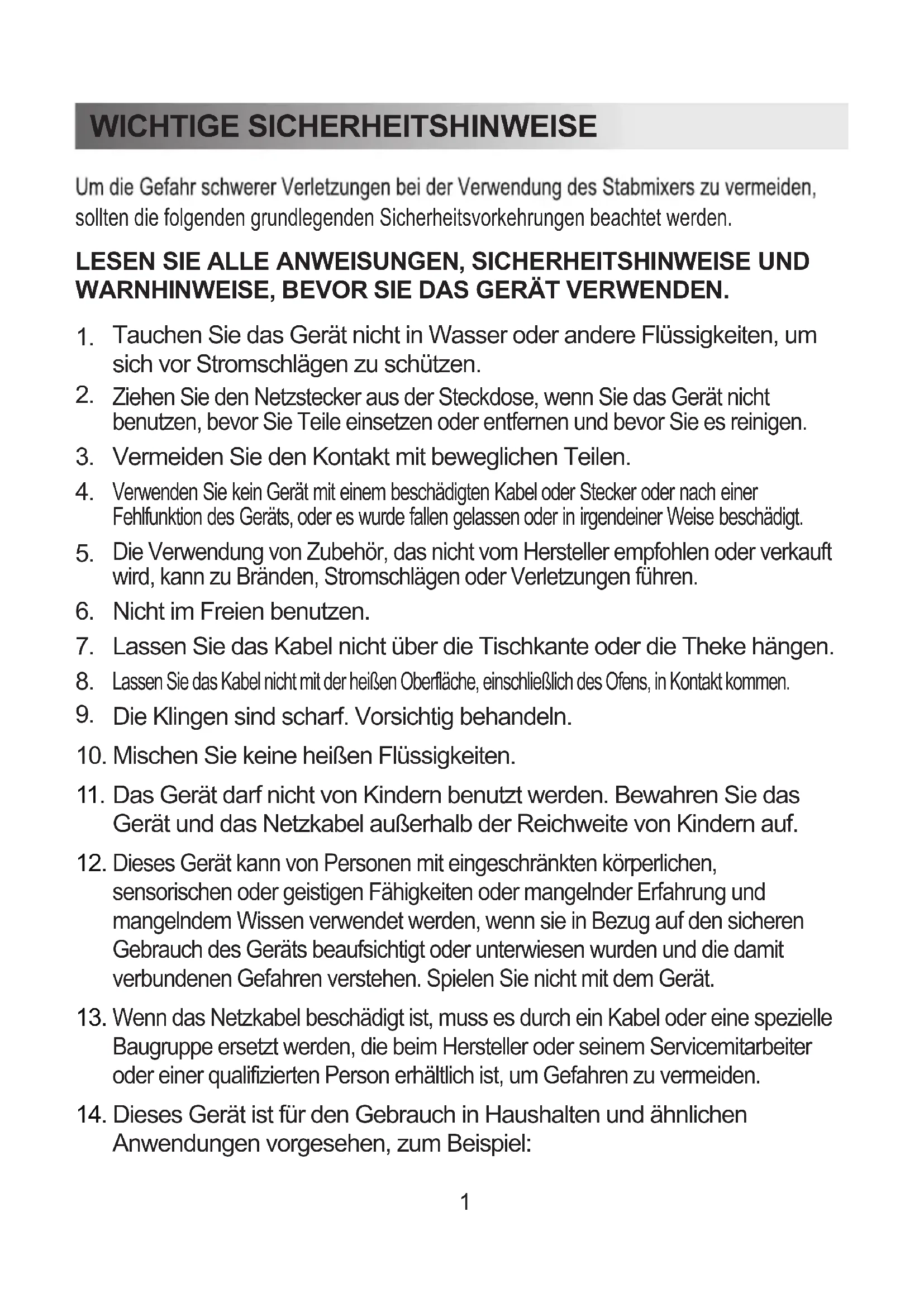 WARNHINWEISE, BEVOR SIE DAS GERÄT VERWENDEN. Tauchen Sie das Gerät nicht in Wasser oder andere Flüssigkeiten, um sich vor Stromschlägen zu schützen. Ziehen Sie den Netzstecker aus der Steckdose, wenn Sie das Gerät nicht benutzen, bevor Sie Teile einsetzen oder entfernen und bevor Sie es reinigen. Vermeiden Sie den Kontakt mit beweglichen Teilen. Verwenden Sie kein Gerät mit einem beschädigten Kabel oder Stecker oder nach einer Fehlfunktion des Geräts, oder es wurde fallen gelassen oder in irgendeiner Weise beschädigt. Die Verwendung von Zubehör, das nicht vom Hersteller empfohlen oder verkauft wird, kann zu Bränden, Stromschlägen oder Verletzungen führen. Nicht im Freien benutzen. Lassen Sie das Kabel nicht über die Tischkante oder die Theke hängen. Lassen Sie das Kabel nicht mit der heißen Oberfläche, einschließlich des Ofens, in Kontakt kommen. Die Klingen sind scharf. Vorsichtig behandeln. Mischen Sie keine heißen Flüssigkeiten. Das Gerät darf nicht von Kindern benutzt werden. Bewahren Sie das Gerät und das Netzkabel außerhalb der Reichweite von Kindern auf. Dieses Gerät kann von Personen mit eingeschränkten körperlichen, sensorischen oder geistigen Fähigkeiten oder mangelnder Erfahrung und mangelndem Wissen verwendet werden, wenn sie in Bezug auf den sicheren Gebrauch des Geräts beaufsichtigt oder unterwiesen wurden und die damit verbundenen Gefahren verstehen. Spielen Sie nicht mit dem Gerät. Wenn das Netzkabel beschädigt ist, muss es durch ein Kabel oder eine spezielle Baugruppe ersetzt werden, die beim Hersteller oder seinem Servicemitarbeiter oder einer qualifizierten Person erhältlich ist, um Gefahren zu vermeiden. Dieses Gerät ist für den Gebrauch in Haushalten und ähnlichen Anwendungen vorgesehen, zum Beispiel: