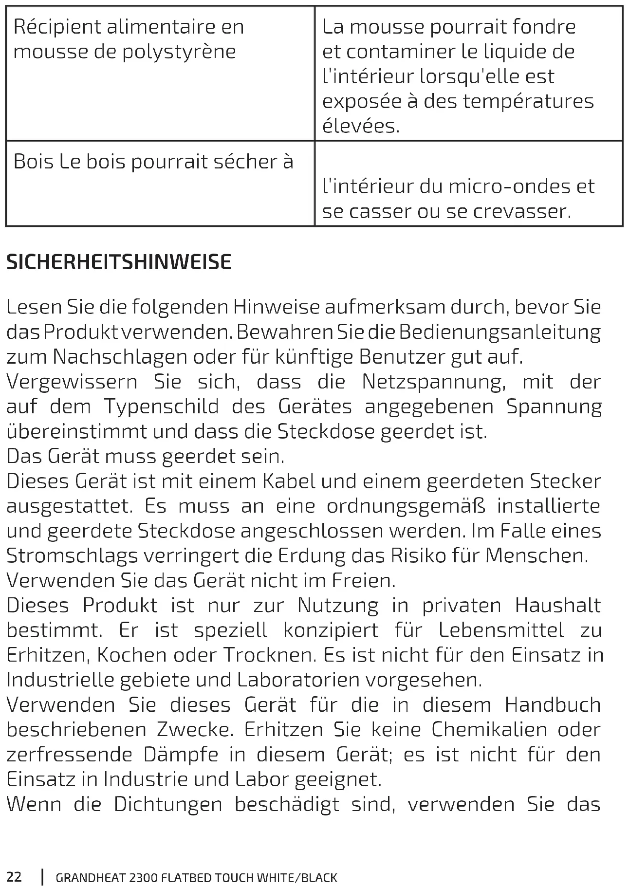 Récipient alimentaire en mousse de polystyrène La mousse pourrait fondre et contaminer le liquide de l’intérieur lorsqu'elle est exposée à des températures élevées. Bois Le bois pourrait sécher à l’intérieur du micro-ondes et se casser ou se crevasser. SICHERHEITSHINWEISE Lesen Sie die folgenden Hinweise aufmerksam durch, bevor Sie das Produkt verwenden. Bewahren Sie die Bedienungsanleitung zum Nachschlagen oder für künftige Benutzer gut auf. Vergewissern Sie sich, dass die Netzspannung, mit der auf dem Typenschild des Gerätes angegebenen Spannung übereinstimmt und dass die Steckdose geerdet ist. Das Gerät muss geerdet sein. Dieses Gerät ist mit einem Kabel und einem geerdeten Stecker ausgestattet. Es muss an eine ordnungsgemäß installierte und geerdete Steckdose angeschlossen werden. Im Falle eines Stromschlags verringert die Erdung das Risiko für Menschen. Verwenden Sie das Gerät nicht im Freien. Dieses Produkt ist nur zur Nutzung in privaten Haushalt bestimmt. Er ist speziell konzipiert für Lebensmittel zu Erhitzen, Kochen oder Trocknen. Es ist nicht für den Einsatz in Industrielle gebiete und Laboratorien vorgesehen. Verwenden Sie dieses Gerät für die in diesem Handbuch beschriebenen Zwecke. Erhitzen Sie keine Chemikalien oder zerfressende Dämpfe in diesem Gerät; es ist nicht für den Einsatz in Industrie und Labor geeignet. Wenn die Dichtungen beschädigt sind, verwenden Sie das23