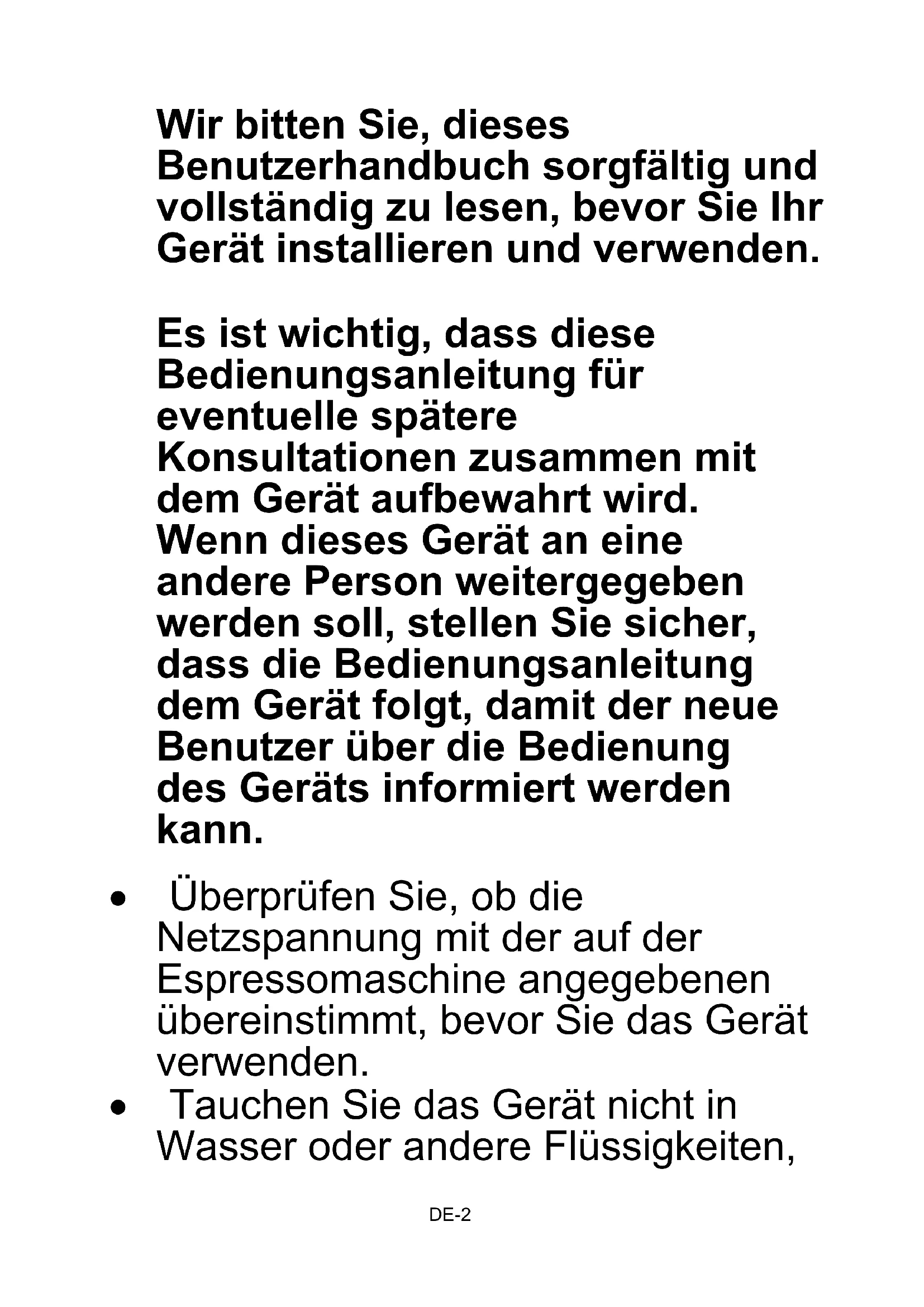 - Überprüfen Sie, ob die Netzspannung mit der auf der Espressomaschine angegebenen übereinstimmt, bevor Sie das Gerät verwenden.