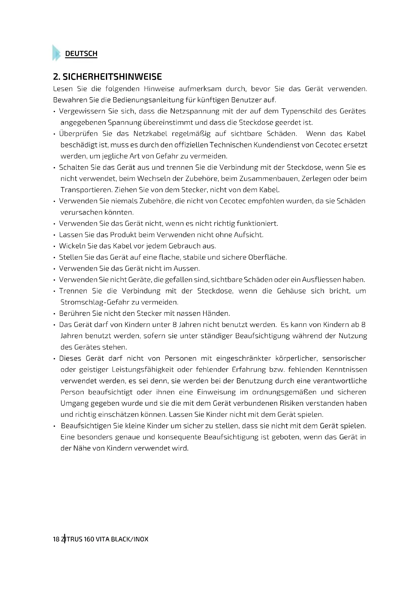 Dieses Produkt hat 2 Jahre Garantie. Die Garantiezeit beginnt mit dem Kaufdatum bzw. Lieferdatum, soweit der hierfür vorhandene und sorgfältig aufbewahrte Kaufbeleg rechtzeitig eingereicht wird, und das Produkt unter angemessener und sachgemäßer Behandlung, wie es in dieser Bedienungsanleitung beschrieben wurde, sich in einem hierfür entsprechenden, optimalen Zustand befindet. Die Garantie deckt keine Schäden bei denen: Das Produkt über seine Kapazität oder Anwendbarkeit hinaus missbraucht, geschlagen, nicht ordnungsgemäß behandelt wurde oder mit ätzenden bzw. Korrosiven Substanzen oder Flüssigkeiten in Kontakt geraten ist oder die jeweilige Störung, Fehler, Schaden bzw. Defekt dem Verbraucher zugerechnet werden kann. Das Produkt von Personen demontiert, repariert oder modifiziert wurde, die nicht vom offiziellen Technischen Kundendienst durch Cecotec autorisiert worden sind. Der Grund hierfür durch die normale Abnutzung und Verschleiß der Teile und des Zubehörs entstanden ist. Die Garantieleistung deckt alle Herstellungsbedingten Schäden und Fehler Ihres Produktes für die Dauer von 2 Jahren, nach geltendem Recht Diese eingeschränkte Gewährleistung gilt nicht für Mängel, die sich aus Unfällen, Missbrauch, unsachgemäße Wartung oder normale Abnutzung ergeben. Sollte unerwartet eine Störung auftreten oder haben Sie Fragen über Ihrem Produkt, dann können Sie sich mit der Auskunftstelle in Verbindung setzen über die Telefonnummer: +34 963210728.ITALIANO
