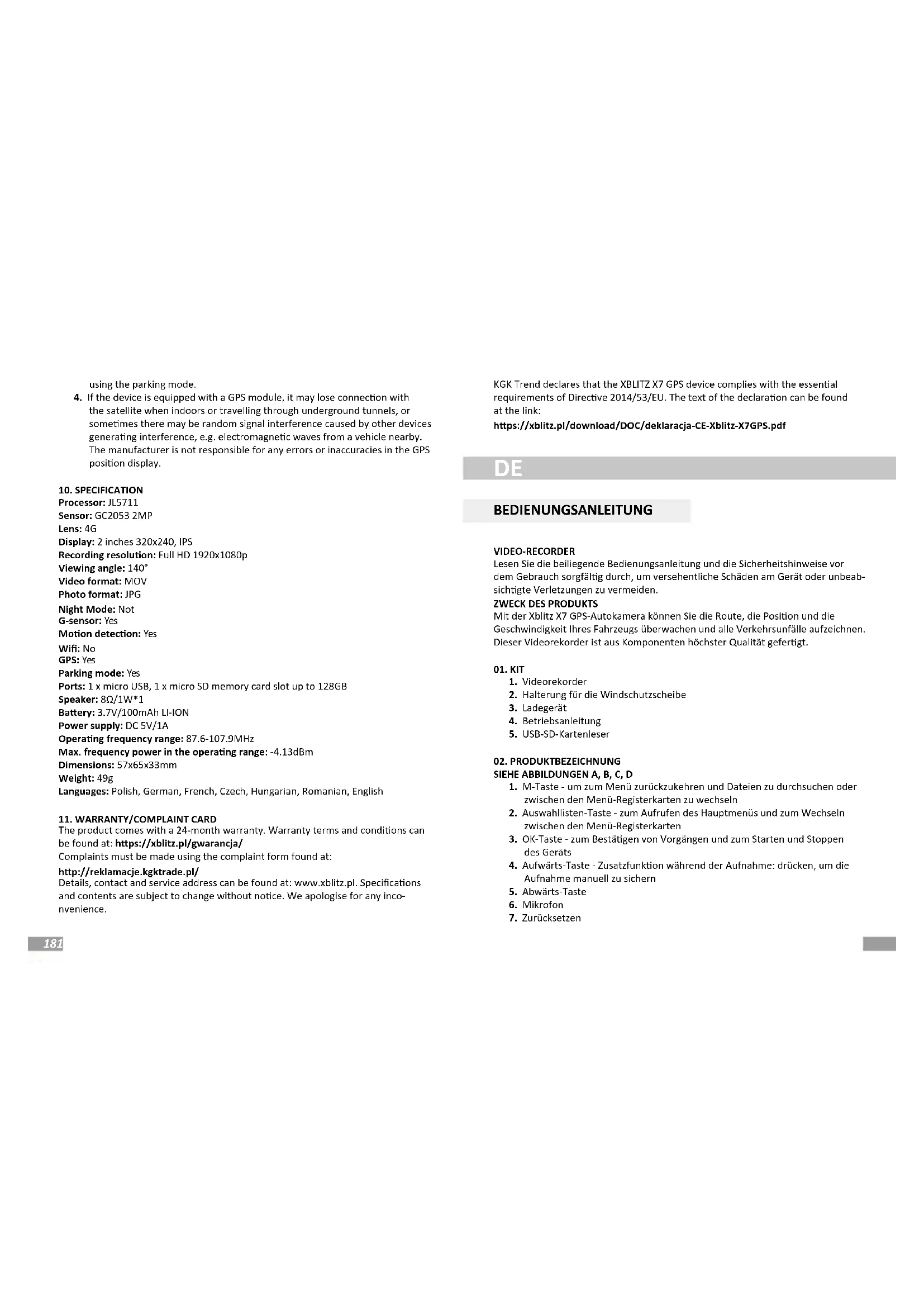 Das Produkt wird mit einer 24-monagen Garane geliefert. Die Garanebedingun- gen nden Sie unter: hps://xblitz.pl/gwarancja/ Beschwerden müssen mit dem Beschwerdeformular eingereicht werden, das unter folgender Adresse zu nden ist: hp://reklamacje.kgktrade.pl/ Details, Kontakt und Serviceadresse nden Sie unter: www.xblitz.pl. Änderungen der technischen Daten und des Inhalts sind ohne Vorankündigung möglich. Wir entschuldigen uns für etwaige Unannehmlichkeiten. KGK Trend erklärt, dass das XBLITZ X7 GPS-Gerät die grundlegenden Anforderungen der Richtlinie 2014/53/EU erfüllt. Der Text der Erklärung kann unter dem Link gefunden werden: hps://xblitz.pl/download/DOC/deklaracja-CE-Xblitz-X7GPS.pdf