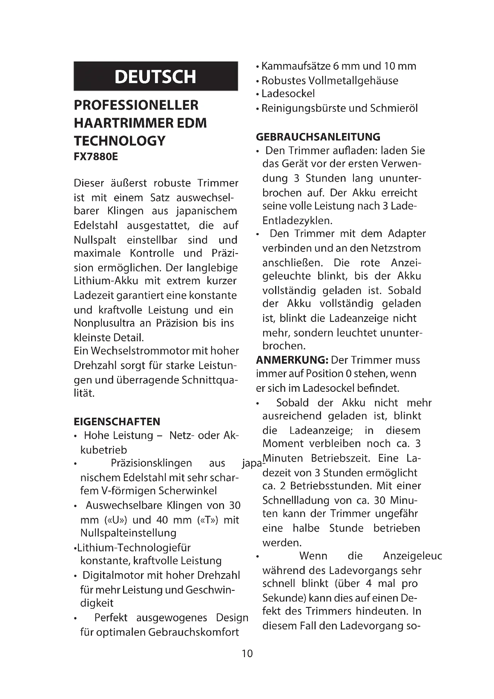 - After cleaning click the blade frame back in place.10 PROFESSIONELLER HAARTRIMMER EDM TECHNOLOGY FX7880E Dieser äußerst robuste Trimmer ist mit einem Satz auswechsel- barer Klingen aus japanischem Edelstahl ausgestattet, die auf Nullspalt einstellbar sind und maximale Kontrolle und Präzi- sion ermöglichen. Der langlebige Lithium-Akku mit extrem kurzer Ladezeit garantiert eine konstante und kraftvolle Leistung und ein Nonplusultra an Präzision bis ins kleinste Detail. Ein Wechselstrommotor mit hoher Drehzahl sorgt für starke Leistun- gen und überragende Schnittqua- lität. EIGENSCHAFTEN