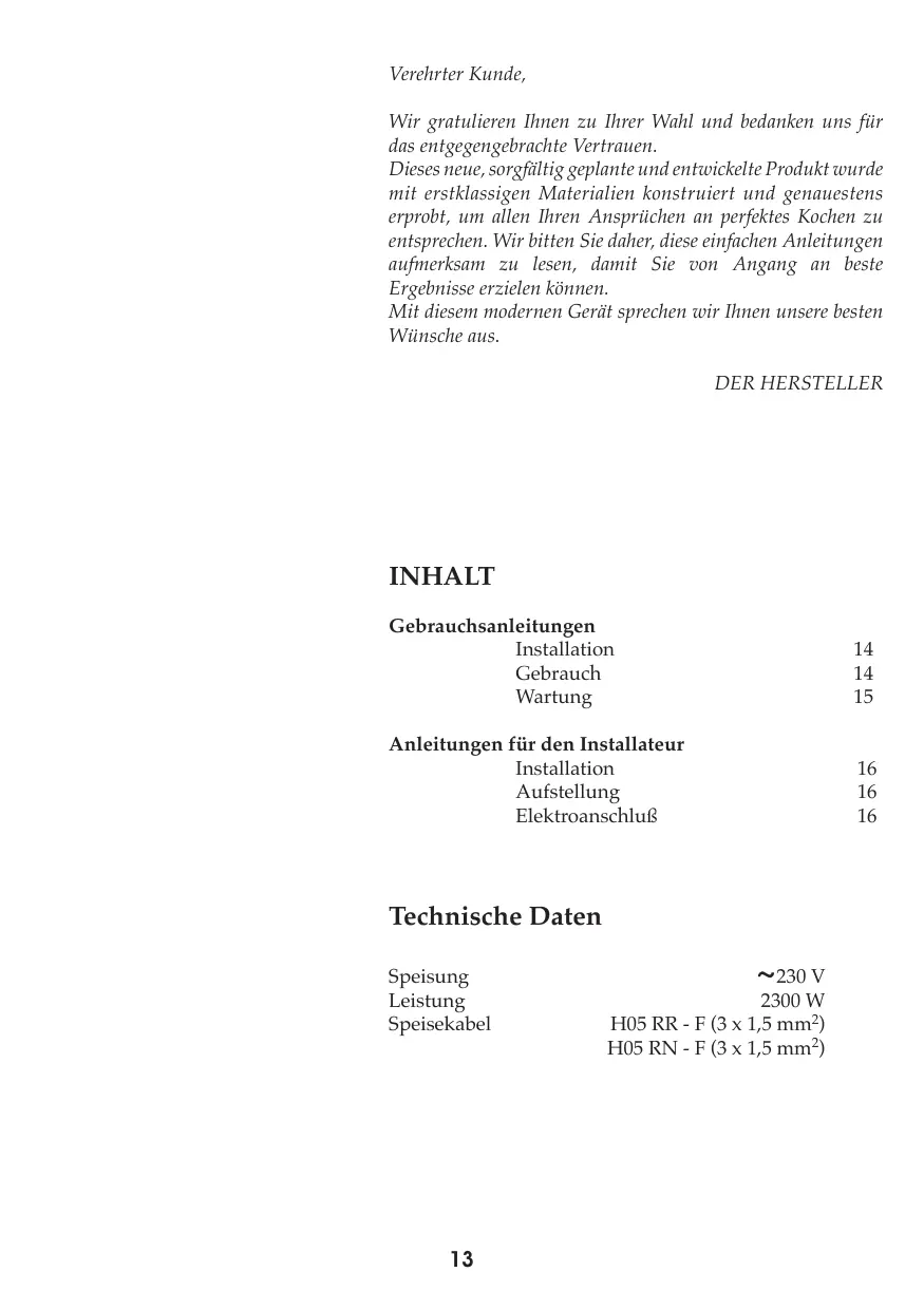 Verehrter Kunde, Wir gratulieren Ihnen zu Ihrer Wahl und bedanken uns für das entgegengebrachte Vertrauen. Dieses neue, sorgfältig geplante und entwickelte Produkt wurde mit erstklassigen Materialien konstruiert und genauestens erprobt, um allen Ihren Ansprüchen an perfektes Kochen zu entsprechen. Wir bitten Sie daher, diese einfachen Anleitungen aufmerksam zu lesen, damit Sie von Angang an beste Ergebnisse erzielen können. Mit diesem modernen Gerät sprechen wir Ihnen unsere besten Wünsche aus. DER HERSTELLER INHALT Gebrauchsanleitungen Installation Gebrauch Wartung