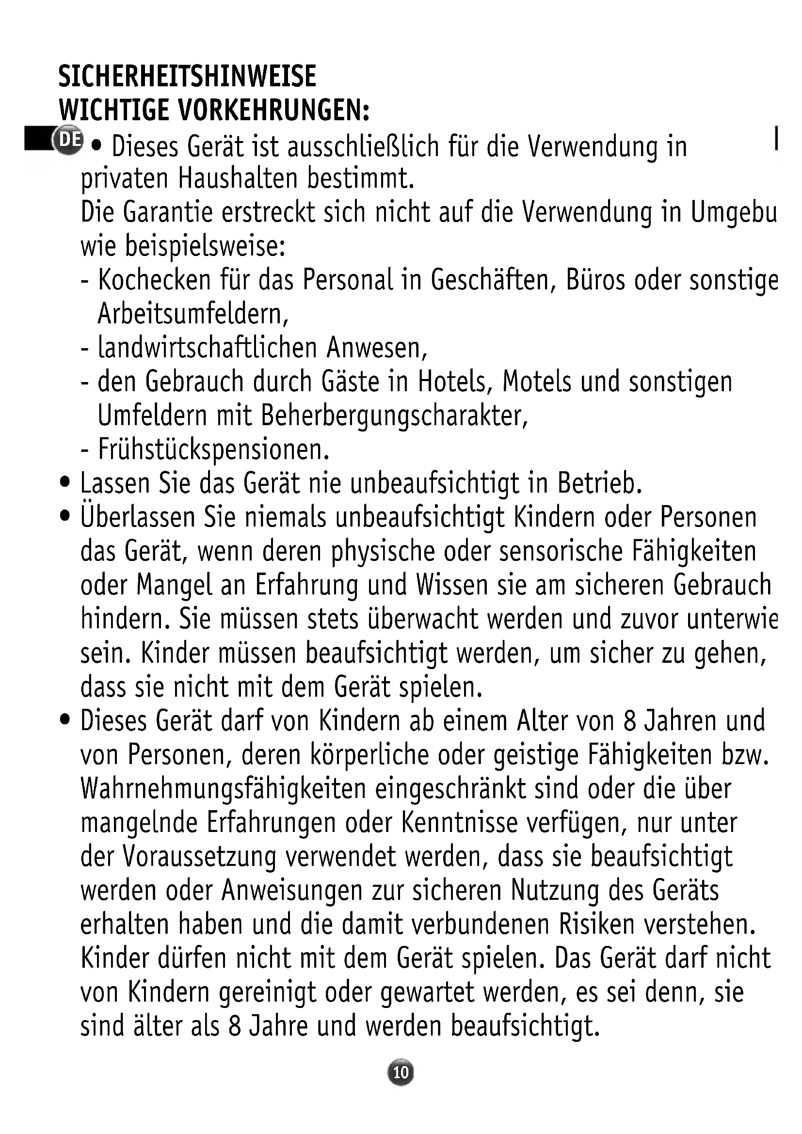- Dieses Gerät ist ausschließlich für die Verwendung in privaten Haushalten bestimmt. Die Garantie erstreckt sich nicht auf die Verwendung in Umgebungen wie beispielsweise: - Kochecken für das Personal in Geschäften, Büros oder sonstigen Arbeitsumfeldern, - landwirtschaftlichen Anwesen, - den Gebrauch durch Gäste in Hotels, Motels und sonstigen Umfeldern mit Beherbergungscharakter, - Frühstückspensionen.