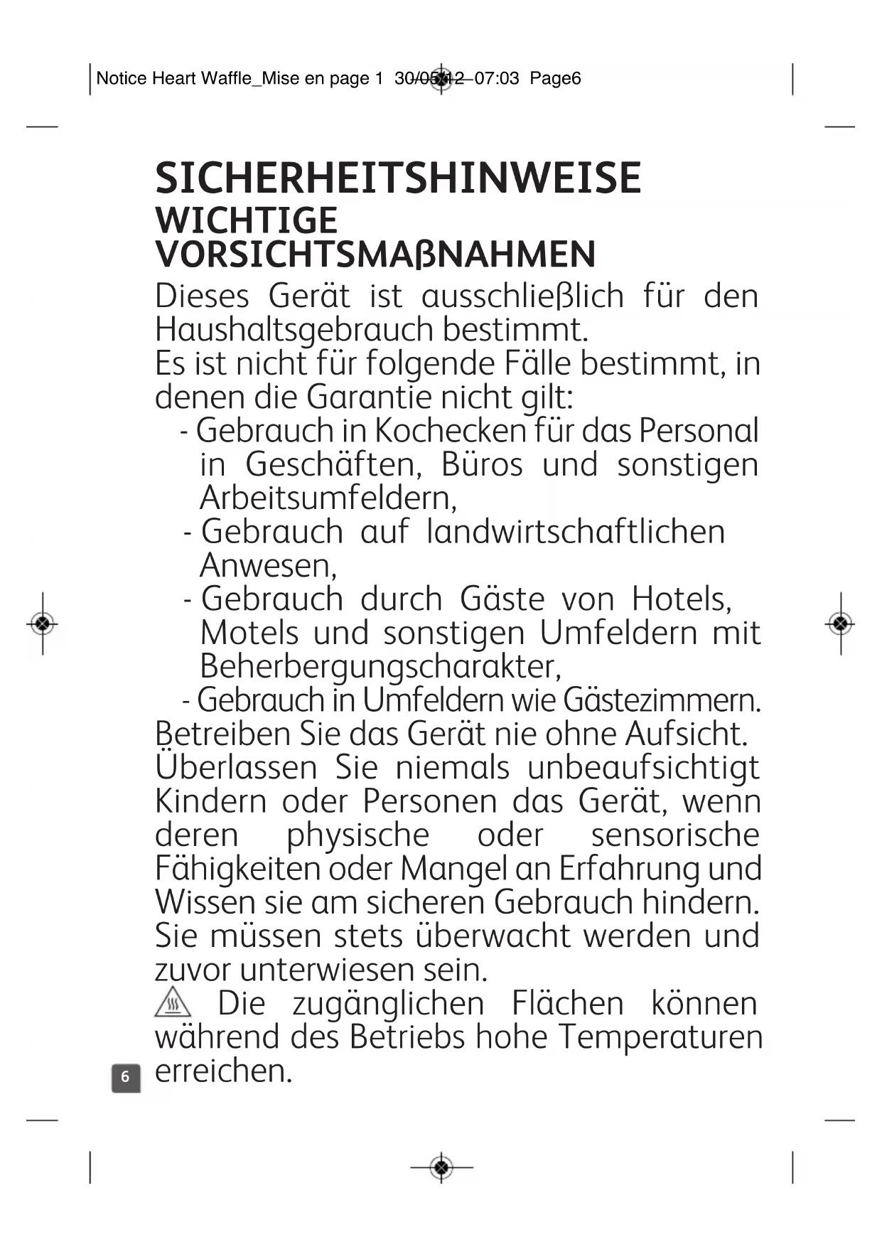 Notice Heart Waffle_Mise en page 1 30/05/12 07:03 Page56 SICHERHEITSHINWEISE WICHTIGE VORSICHTSMAßNAHMEN Dieses Gerät ist ausschließlich für den Haushaltsgebrauch bestimmt. Es ist nicht für folgende Fälle bestimmt, in denen die Garantie nicht gilt: - Gebrauch in Kochecken für das Personal in Geschäften, Büros und sonstigen Arbeitsumfeldern, - Gebrauch auf landwirtschaftlichen Anwesen, - Gebrauch durch Gäste von Hotels, Motels und sonstigen Umfeldern mit Beherbergungscharakter, - Gebrauch in Umfeldern wie Gästezimmern. Betreiben Sie das Gerät nie ohne Aufsicht. Überlassen Sie niemals unbeaufsichtigt Kindern oder Personen das Gerät, wenn deren physische oder sensorische Fähigkeiten oder Mangel an Erfahrung und Wissen sie am sicheren Gebrauch hindern. Sie müssen stets überwacht werden und zuvor unterwiesen sein. Die zugänglichen Flächen können während des Betriebs hohe Temperaturen erreichen. Notice Heart Waffle_Mise en page 1 30/05/12 07:03 Page67