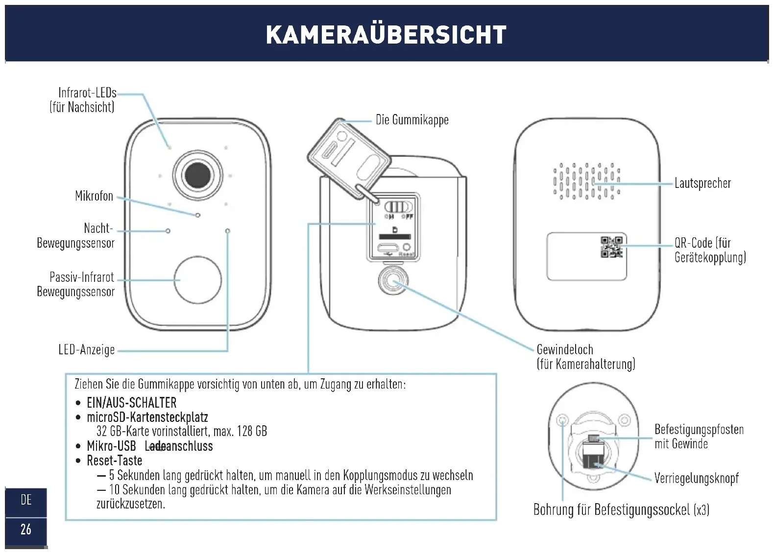 - Reset-Taste — 5 Sekunden lang gedrückt halten, um manuell in den Kopplungsmodus zu wechseln — 10 Sekunden lang gedrückt halten, um die Kamera auf die Werkseinstellungen zurückzusetzen. Mikrofon Lautsprecher QR-Code (für Gerätekopplung) Die Gummikappe Passiv-Infrarot Bewegungssensor LED-Anzeige Nacht- Bewegungssensor Infrarot-LEDs (für Nachsicht) Befestigungspfosten mit Gewinde Verriegelungsknopf Bohrung für Befestigungssockel (x3)27