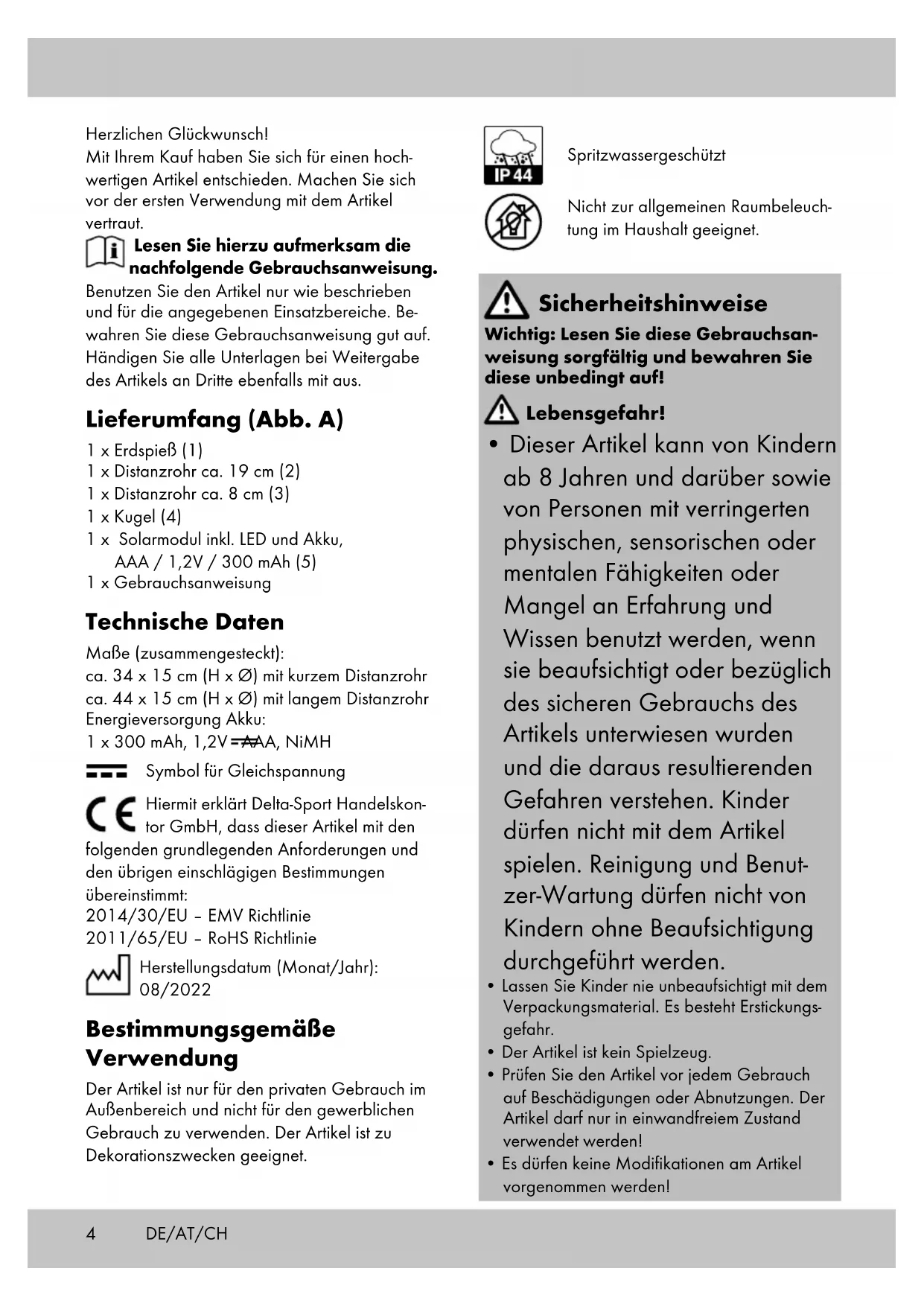 Herzlichen Glückwunsch! Mit Ihrem Kauf haben Sie sich für einen hoch- wertigen Artikel entschieden. Machen Sie sich vor der ersten Verwendung mit dem Artikel vertraut. Lesen Sie hierzu aufmerksam die nachfolgende Gebrauchsanweisung. Benutzen Sie den Artikel nur wie beschrieben und für die angegebenen Einsatzbereiche. Be- wahren Sie diese Gebrauchsanweisung gut auf. Händigen Sie alle Unterlagen bei Weitergabe des Artikels an Dritte ebenfalls mit aus. Lieferumfang (Abb. A) 1 x Erdspieß (1) 1 x Distanzrohr ca. 19 cm (2) 1 x Distanzrohr ca. 8 cm (3) 1 x Kugel (4) 1 x Solarmodul inkl. LED und Akku, AAA / 1,2V / 300 mAh (5) 1 x Gebrauchsanweisung Technische Daten Maße (zusammengesteckt): ca. 34 x 15 cm (H x Ø) mit kurzem Distanzrohr ca. 44 x 15 cm (H x Ø) mit langem Distanzrohr Energieversorgung Akku: 1 x 300 mAh, 1,2V AAA, NiMH Symbol für Gleichspannung Hiermit erklärt Delta-Sport Handelskon- tor GmbH, dass dieser Artikel mit den folgenden grundlegenden Anforderungen und den übrigen einschlägigen Bestimmungen übereinstimmt: 2014/30/EU – EMV Richtlinie 2011/65/EU – RoHS Richtlinie Herstellungsdatum (Monat/Jahr): 08/2022 Bestimmungsgemäße Verwendung Der Artikel ist nur für den privaten Gebrauch im Außenbereich und nicht für den gewerblichen Gebrauch zu verwenden. Der Artikel ist zu Dekorationszwecken geeignet. Spritzwassergeschützt Nicht zur allgemeinen Raumbeleuch- tung im Haushalt geeignet. Sicherheitshinweise Wichtig: Lesen Sie diese Gebrauchsan- weisung sorgfältig und bewahren Sie diese unbedingt auf! Lebensgefahr!