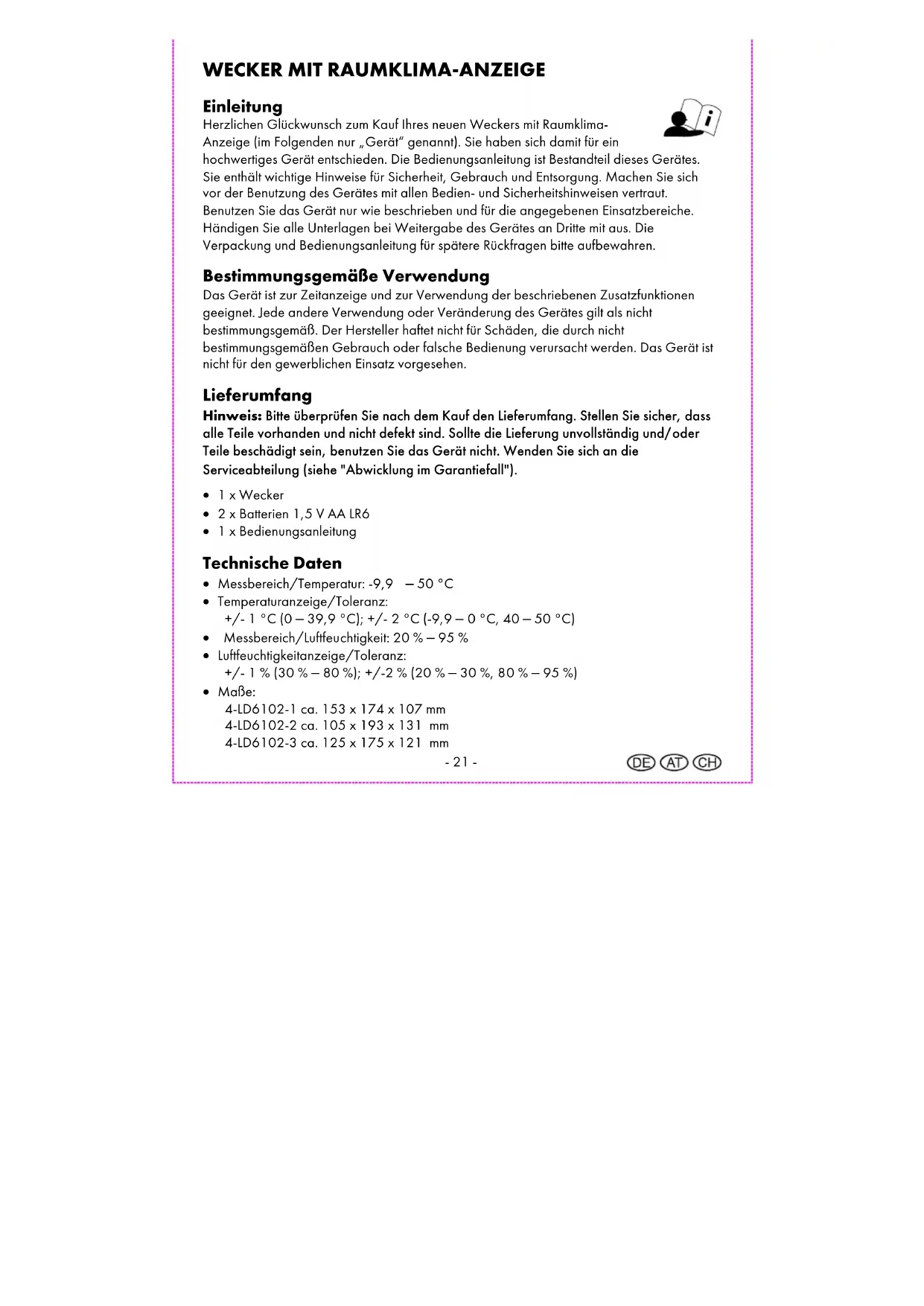 Einleitung Herzlichen Glückwunsch zum Kauf Ihres neuen Weckers mit Raumklima- Anzeige (im Folgenden nur „Gerät“ genannt). Sie haben sich damit für ein hochwertiges Gerät entschieden. Die Bedienungsanleitung ist Bestandteil dieses Gerätes. Sie enthält wichtige Hinweise für Sicherheit, Gebrauch und Entsorgung. Machen Sie sich vor der Benutzung des Gerätes mit allen Bedien- und Sicherheitshinweisen vertraut. Benutzen Sie das Gerät nur wie beschrieben und für die angegebenen Einsatzbereiche. Händigen Sie alle Unterlagen bei Weitergabe des Gerätes an Dritte mit aus. Die Verpackung und Bedienungsanleitung für spätere Rückfragen bitte aufbewahren. Bestimmungsgemäße Verwendung Das Gerät ist zur Zeitanzeige und zur Verwendung der beschriebenen Zusatzfunktionen geeignet. Jede andere Verwendung oder Veränderung des Gerätes gilt als nicht bestimmungsgemäß. Der Hersteller haftet nicht für Schäden, die durch nicht bestimmungsgemäßen Gebrauch oder falsche Bedienung verursacht werden. Das Gerät ist nicht für den gewerblichen Einsatz vorgesehen. Lieferumfang Hinweis: Bitte überprüfen Sie nach dem Kauf den Lieferumfang. Stellen Sie sicher, dass alle Teile vorhanden und nicht defekt sind. Sollte die Lieferung unvollständig und/oder Teile beschädigt sein, benutzen Sie das Gerät nicht. Wenden Sie sich an die Serviceabteilung (siehe "Abwicklung im Garantiefall"). 1 x Wecker 2 x Batterien 1,5 V AA LR6 1 x Bedienungsanleitung Technische Daten Messbereich/Temperatur: -9,9 ‒ 50 °C Temperaturanzeige/Toleranz: +/- 1 °C (0 ‒ 39,9 °C); +/- 2 °C (-9,9 ‒ 0 °C, 40 ‒ 50 °C) Messbereich/Luftfeuchtigkeit: 20 % ‒ 95 % Luftfeuchtigkeitanzeige/Toleranz: +/- 1 % (30 % ‒ 80 %); +/-2 % (20 % ‒ 30 %, 80 % ‒ 95 %) Maße: 4-LD6102-1 ca. 153 x 174 x 107 mm 4-LD6102-2 ca. 105 x 193 x 131 mm 4-LD6102-3 ca. 125 x 175 x 121 mm- 22 - Gewicht: 4-LD6102-1 ca. 210 g (exkl. Batterie) 4-LD6102-2 ca. 188 g (exkl. Batterie) 4-LD6102-3 ca. 188 g (exkl. Batterie) Betrieb mit zwei 1,5 V AA LR6/R6P Batterien Batterie - Kennzeichen für Gleichspannung Zeichenerklärung