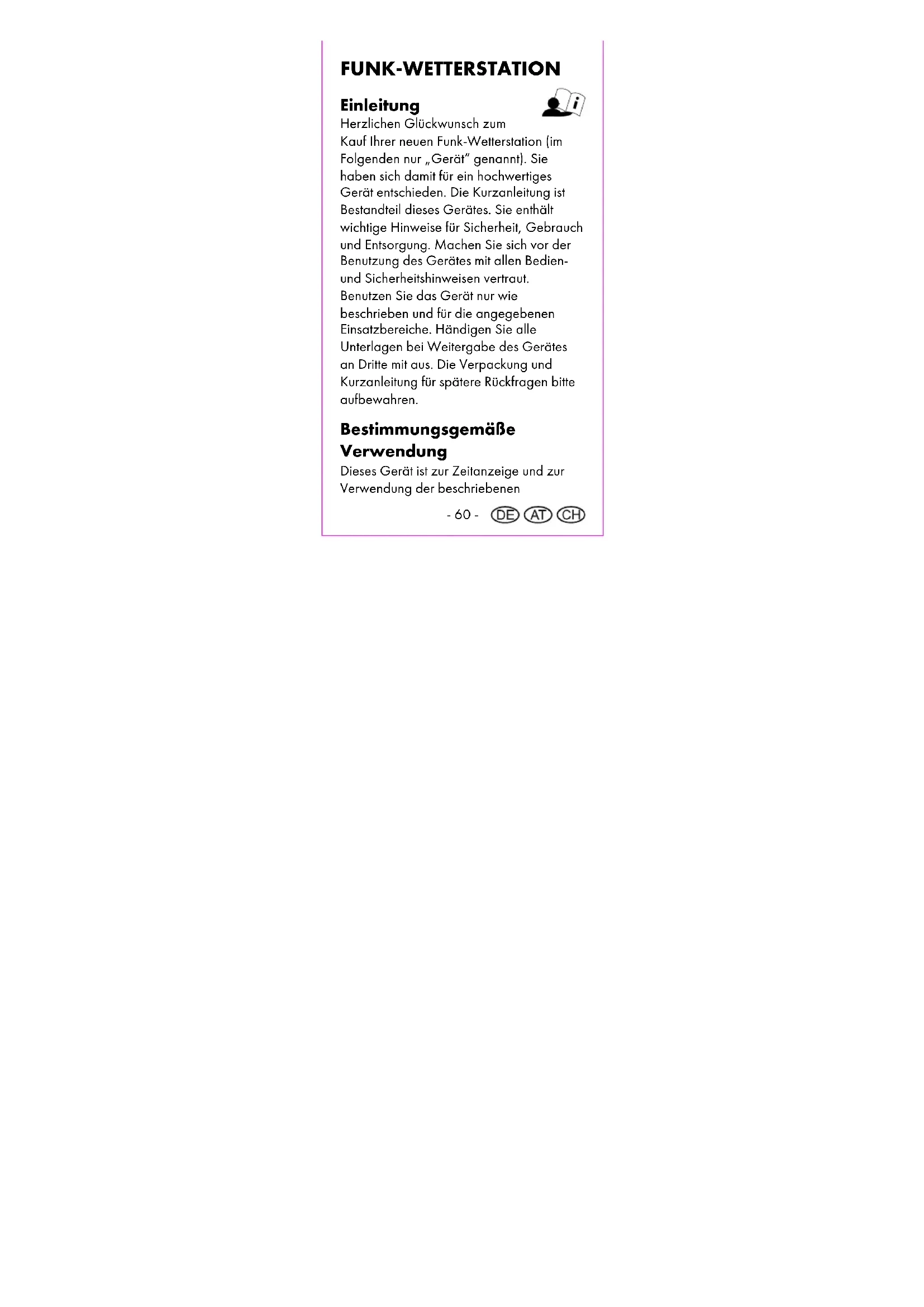 Supplier Please note that the following address is not a service address. Please first contact the service address (see above). digi-tech gmbh Valterweg 27A 65817 Eppstein GERMANY- 57 - Bedienungs- und Sicherheitshinweise Inhaltsverzeichnis Inhaltsverzeichnis ................................. - 57 - Einleitung ............................................... - 60 - Bestimmungsgemäße Verwendung .... - 60 - Lieferumfang ......................................... - 61 - Technische Daten ................................. - 62 - Gerät ............................................... - 62 - Funksensoren .................................. - 62 - Zeichenerklärung ................................. - 64 - Wichtige Sicherheitshinweise Wichtige SicherheitshinweiseWichtige Sicherheitshinweise Wichtige Sicherheitshinweise........... - 67 - Sicherheitshinweise für Benutzer ... - 67 - Sicherheitshinweise zu den Batterien .................................. - 68 - Das Gerät sicher aufhängen oder -stellen .......................................... - 72 - Die Funksensoren sicher aufhängen oder -stellen .......................................... - 74 - Display .................................................. - 76 - Bedienfelder ......................................... - 78 - Funksensoren ........................................ - 79 - Inbetriebnahme .................................... - 80 - Zeitzonenanpassung ............................ - 83 -- 58 - Empfangsstörung .................................. - 84 - DCF77-Funkempfang aus- und einschalten ............................................ - 85 - Schnelleinstellung ................................. - 87 - Grundeinstellung .................................. - 87 - Licht ........................................................ - 88 - 12-/24-Stunden-Zeitformat ................ - 88 - Alarm ..................................................... - 89 - Alarm aktivieren oder deaktivieren .................................... - 89 - Alarm einstellen .............................. - 90 - Schlummerfunktion (SNOOZE) .... - 90 - Temperaturformat ................................. - 91 - Tendenzen ............................................ - 91 - Maximal- und Minimalwerte ............... - 92 - Batteriestandsanzeige .......................... - 93 - Kanaleinstellung der Funksensoren 1-3 .......................... - 93 - Funksensorendaten abrufen .......... - 94 - Benennung der Funksensoren ............. - 95 - Voreingestellte Namen vergeben ......................................... - 96 - Eigene Namen vergeben .............. - 97 - Persönliche Daten ................................. - 98 - Neustart (RESET) .................................. - 98 - Reinigungshinweis ................................ - 99 -- 59 - Lagerung ............................................... - 99 - Vereinfachte EU-Konformitätserklärung ................ - 100 - Entsorgung ......................................... - 100 - Entsorgung des Elektrogeräts ..... - 101 - Entsorgung der Batterien ............ - 105 - Recycling ..................................... - 109 - Müllentsorgung ........................... - 109 - Garantie der digi-tech gmbh............ - 109 - Garantiebedingungen ................ - 110 - Garantiezeit und gesetzliche Mängelansprüche ....................... - 111 - Garantieumfang .......................... - 111 - Abwicklung im Garantiefall ....... - 112 - Service ................................................ - 114 - Lieferant .............................................. - 116 -- 60 - FUNK-WETTERSTATION Einleitung Herzlichen Glückwunsch zum Kauf Ihrer neuen Funk-Wetterstation (im Folgenden nur „Gerät“ genannt). Sie haben sich damit für ein hochwertiges Gerät entschieden. Die Kurzanleitung ist Bestandteil dieses Gerätes. Sie enthält wichtige Hinweise für Sicherheit, Gebrauch und Entsorgung. Machen Sie sich vor der Benutzung des Gerätes mit allen Bedien- und Sicherheitshinweisen vertraut. Benutzen Sie das Gerät nur wie beschrieben und für die angegebenen Einsatzbereiche. Händigen Sie alle Unterlagen bei Weitergabe des Gerätes an Dritte mit aus. Die Verpackung und Kurzanleitung für spätere Rückfragen bitte aufbewahren. Bestimmungsgemäße Verwendung Dieses Gerät ist zur Zeitanzeige und zur Verwendung der beschriebenen- 61 - Zusatzfunktionen geeignet. Jede andere Verwendung oder Veränderung des Gerätes gilt als nicht bestimmungsgemäß. Der Hersteller haftet nicht für Schäden, die durch nicht bestimmungsgemäßen Gebrauch oder falsche Bedienung verursacht werden. Das Gerät ist nicht für den gewerblichen Einsatz vorgesehen. Lieferumfang Hinweis: Bitte überprüfen Sie nach dem Kauf den Lieferumfang. Stellen Sie sicher, dass alle Teile vorhanden und nicht defekt sind. Sollte die Lieferung unvollständig und/oder Teile beschädigt sein, benutzen Sie das Gerät nicht. Wenden Sie sich an die Serviceabteilung (siehe "Abwicklung im Garantiefall").