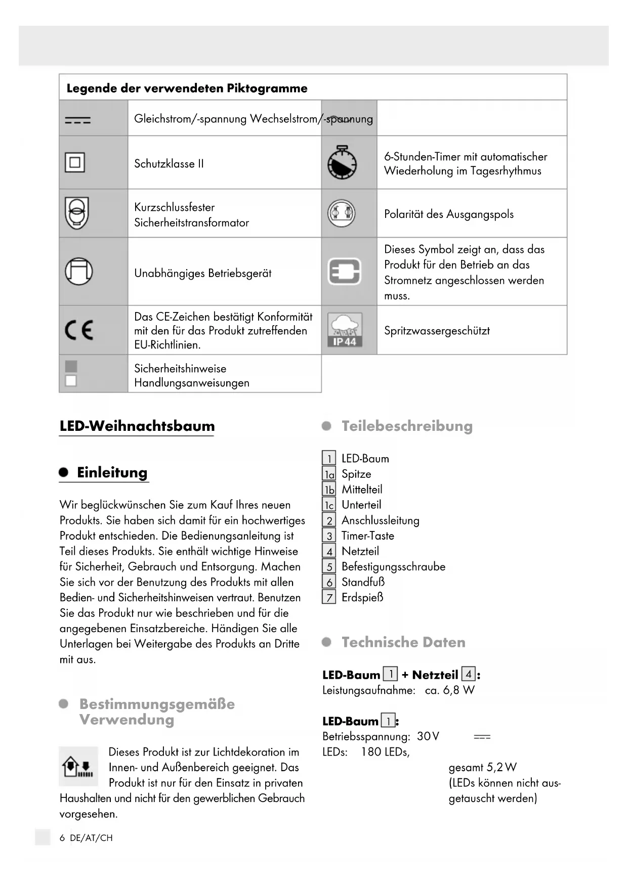 55 DE/AT/CH Legende der verwendeten Piktogramme ........................................................... Seite 6 Einleitung ......................................................................................................................................... Seite 6 Bestimmungsgemäße Verwendung ....................................................................................................Seite 6 Teilebeschreibung ...............................................................................................................................Seite 6 Technische Daten ................................................................................................................................Seite 6 Lieferumfang ........................................................................................................................................ Seite 7 Sicherheitshinweise ................................................................................................................Seite 7 Montage ...........................................................................................................................................Seite 8 Timer-Funktion ............................................................................................................................Seite 9 Reinigung und Pflege ............................................................................................................Seite 9 Entsorgung .....................................................................................................................................Seite 9 Garantie ........................................................................................................................................... Seite 9 Abwicklung im Garantiefall ................................................................................................................Seite 10 Service .................................................................................................................................................Seite 106 DE/AT/CH Legende der verwendeten Piktogramme Gleichstrom/-spannung Wechselstrom/-spannung Schutzklasse II 6-Stunden-Timer mit automatischer Wiederholung im Tagesrhythmus Kurzschlussfester Sicherheitstrans formator Polarität des Ausgangspols Unabhängiges Betriebsgerät Dieses Symbol zeigt an, dass das Produkt für den Betrieb an das Stromnetz angeschlossen werden muss. Das CE-Zeichen bestätigt Konformität mit den für das Produkt zutreffenden EU-Richtlinien. Spritzwassergeschützt Sicherheitshinweise Handlungsanweisungen LED-Weihnachtsbaum Einleitung Wir beglückwünschen Sie zum Kauf Ihres neuen Produkts. Sie haben sich damit für ein hochwertiges Produkt entschieden. Die Bedienungsanleitung ist Teil dieses Produkts. Sie enthält wichtige Hinweise für Sicherheit, Gebrauch und Entsorgung. Machen Sie sich vor der Benutzung des Produkts mit allen Bedien- und Sicherheitshinweisen vertraut. Benutzen Sie das Produkt nur wie beschrieben und für die angegebenen Einsatzbereiche. Händigen Sie alle Unterlagen bei Weitergabe des Produkts an Dritte mit aus. Bestimmungsgemäße Verwendung Dieses Produkt ist zur Lichtdekoration im Innen- und Außenbereich geeignet. Das Produkt ist nur für den Einsatz in privaten Haushalten und nicht für den gewerblichen Gebrauch vorgesehen. Teilebeschreibung