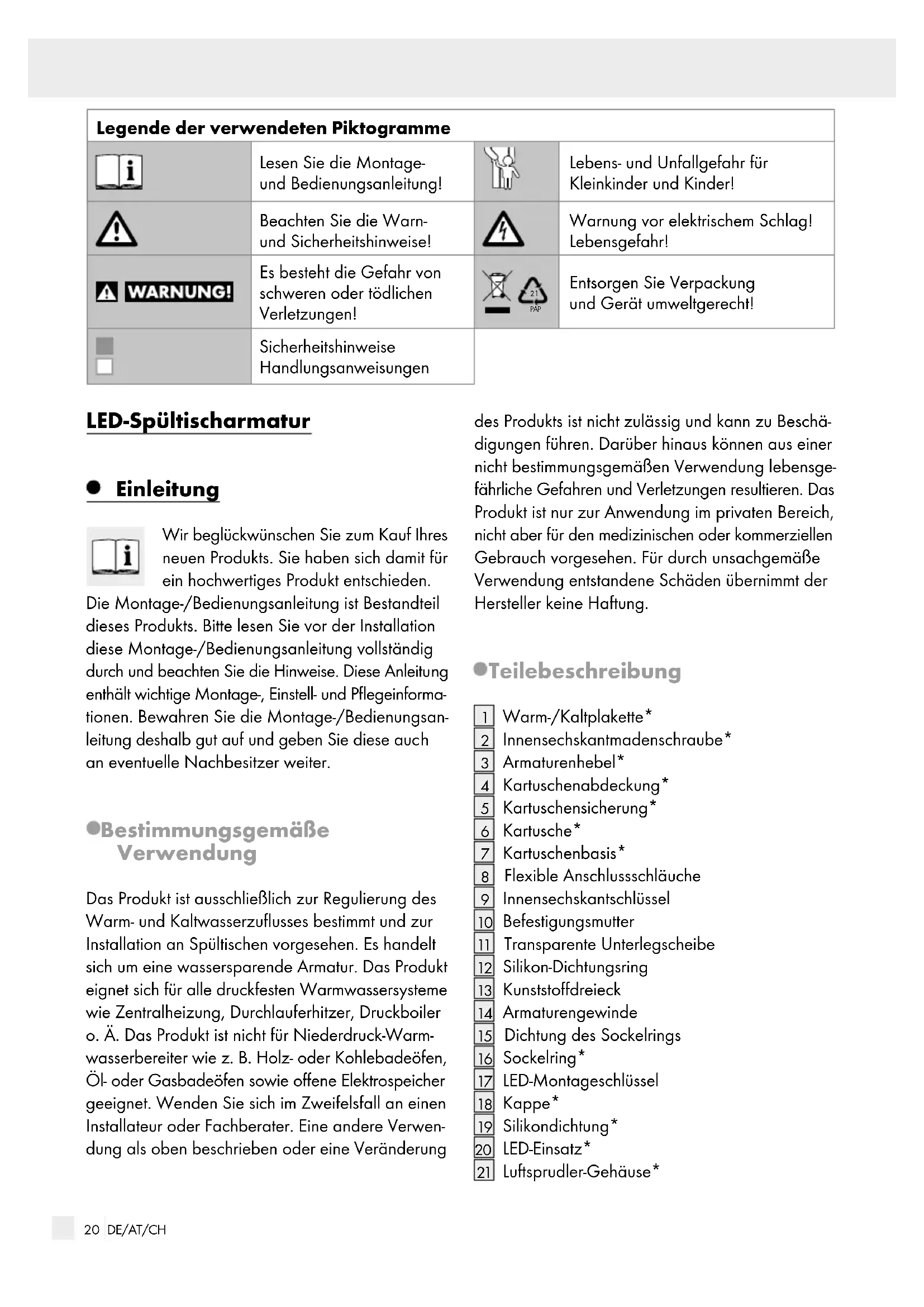PAP Entsorgen Sie Verpackung und Gerät umweltgerecht! Sicherheitshinweise Handlungsanweisungen LED-Spültischarmatur Einleitung Wir beglückwünschen Sie zum Kauf Ihres neuen Produkts. Sie haben sich damit für ein hochwertiges Produkt entschieden. Die Montage-/Bedienungsanleitung ist Bestandteil dieses Produkts. Bitte lesen Sie vor der Installation diese Montage-/Bedienungsanleitung vollständig durch und beachten Sie die Hinweise. Diese Anleitu