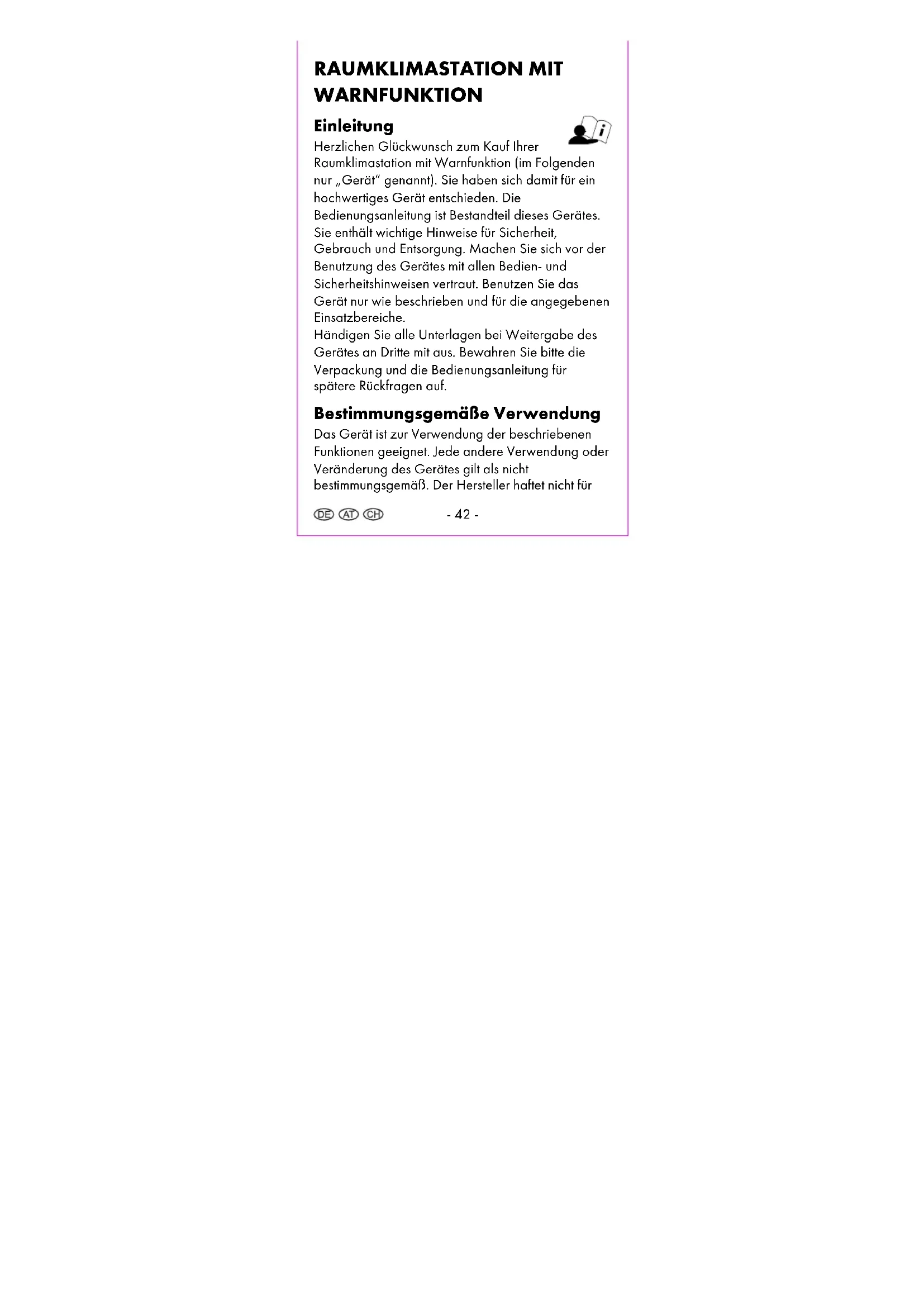 Supplier Please note that the following address is not a service address. Contact the service point named above first. digi-tech gmbh Valterweg 27A 65817 Eppstein GERMANY- 40 - Bedienungs- und Sicherheitshinweise Inhaltsverzeichnis Inhaltsverzeichnis ................................................. - 40 - Einleitung .............................................................. - 42 - Bestimmungsgemäße Verwendung .................... - 42 - Lieferumfang ......................................................... - 43 - Technische Daten ................................................. - 43 - Erklärung der Batteriesymbole ........................... - 46 - Wichtige Sicherheitshinweise Wichtige SicherheitshinweiseWichtige Sicherheitshinweise Wichtige Sicherheitshinweise .......................... - 48 - Sicherheitshinweise für Benutzer .................. - 48 - Sicherheitshinweise zu der Batterie .............. - 49 - Display .................................................................. - 53 - Bedienfelder ......................................................... - 54 - Das Gerät sicher positionieren ..................... - 55 - Inbetriebnahme .................................................... - 56 - Grundeinstellung ........................................... - 57 - Taupunkttemperaturanzeige/ DEW POINT ..... - 57 - Taupunkttemperatur....................................... - 57 - Luftfeuchtigkeitsgrenzwerte einstellen ................ - 59 - Luftfeuchtigkeitsalarm aktivieren oder deaktivieren .......................................................... - 60 - Komfortindex.................................................. - 61 - Raumtemperaturanzeige ..................................... - 62 -- 41 - Schimmelwarnung einstellen ............................... - 62 - Grippe- und Hitzeverzeichnis ............................. - 63 - Grippewarnungsanzeige .................................... - 63 - Hitzewarnungsanzeige ....................................... - 64 - MAX.MIN-Aufzeichnung anzeigen ................... - 64 - MAX.MIN-Aufzeichnung löschen ...................... - 64 - Batteriestandsanzeige ......................................... - 65 - Reinigungshinweis ............................................... - 65 - Lagerung............................................................... - 66 - Vereinfachte EU-Konformitätserklärung ............. - 66 - Entsorgung............................................................ - 67 - Entsorgung des Elektrogeräts ....................... - 67 - Entsorgung der Batterien ............................... - 70 - Recycling ........................................................ - 74 - Müllentsorgung .............................................. - 74 - Garantie der digi-tech gmbh .............................. - 74 - Garantiebedingungen .................................. - 74 - Garantiezeit und gesetzliche Mängelansprüche ......................................... - 75 - Garantieumfang ............................................ - 75 - Abwicklung im Garantiefall .......................... - 77 - Service .................................................................. - 78 - Lieferant ................................................................ - 80 -- 42 - RAUMKLIMASTATION MIT WARNFUNKTION Einleitung Herzlichen Glückwunsch zum Kauf Ihrer Raumklimastation mit Warnfunktion (im Folgenden nur „Gerät“ genannt). Sie haben sich damit für ein hochwertiges Gerät entschieden. Die Bedienungsanleitung ist Bestandteil dieses Gerätes. Sie enthält wichtige Hinweise für Sicherheit, Gebrauch und Entsorgung. Machen Sie sich vor der Benutzung des Gerätes mit allen Bedien- und Sicherheitshinweisen vertraut. Benutzen Sie das Gerät nur wie beschrieben und für die angegebenen Einsatzbereiche. Händigen Sie alle Unterlagen bei Weitergabe des Gerätes an Dritte mit aus. Bewahren Sie bitte die Verpackung und die Bedienungsanleitung für spätere Rückfragen auf. Bestimmungsgemäße Verwendung Das Gerät ist zur Verwendung der beschriebenen Funktionen geeignet. Jede andere Verwendung oder Veränderung des Gerätes gilt als nicht bestimmungsgemäß. Der Hersteller haftet nicht für- 43 - Schäden, die durch nicht bestimmungsgemäßen Gebrauch oder falsche Bedienung verursacht werden. Das Gerät ist nicht für den gewerblichen Einsatz vorgesehen. Lieferumfang Hinweis: Bitte überprüfen Sie nach dem Kauf den Lieferumfang. Stellen Sie sicher, dass alle Teile vorhanden und nicht defekt sind. Sollte die Lieferung unvollständig und/oder Teile beschädigt sein, benutzen Sie das Gerät nicht. Wenden Sie sich an die Serviceabteilung (siehe "Abwicklung im Garantiefall"). 1 x Raumklimastation 2 x Batterien 1,5 V AAA LR03 1 x Bedienungsanleitung Technische Daten Messbereich/Temperatur: 0 °C - 50 °C Messbereich/Luftfeuchtigkeit: 20 % - 95 % Temperaturanzeige/Toleranz im Kernmessbereich: +/- 1 °C Luftfeuchtigkeitsanzeige/Toleranz im Kernmessbereich: 41 % - 80 % - ±3 %; sonstiger Bereich: ±5 %- 44 - Maße: ca. 115 x 74 x 24 mm Gewicht: Modell 1: ca. 97 g (exkl. Batterien) Modell 2: ca. 93 g (exkl. Batterien) Batterien: 2 x 1,5 V AAA R03/LR03 - Kennzeichen für Gleichspannung Zeichenerklärung WARNUNG ! Dieses Signalsymbol/-wort bezeichnet eine Gefährdung mit einem mittleren Risikograd, die, wenn sie nicht vermieden wird, den Tod oder eine schwere Verletzung zur Folge haben kann. Hinweis: Dieses Signalwort wird für zusätzliche Informationen verwendet.